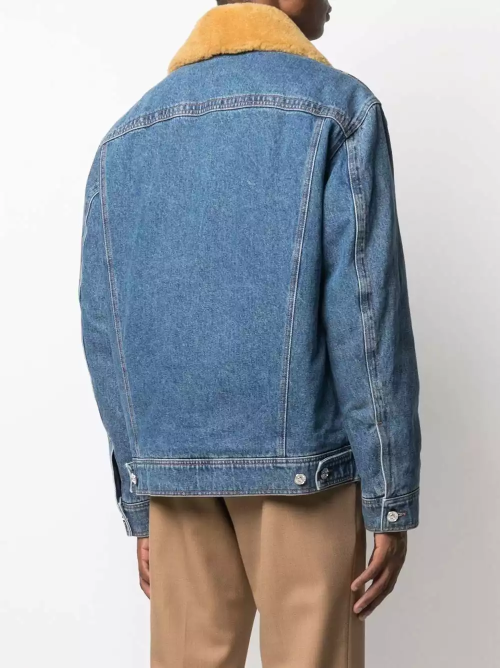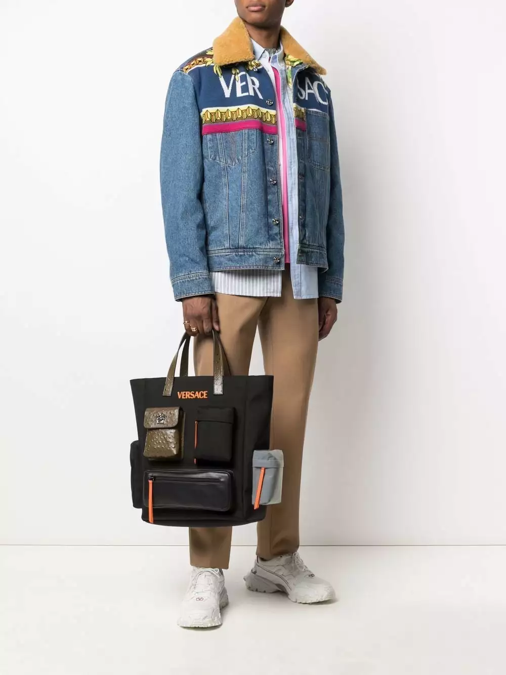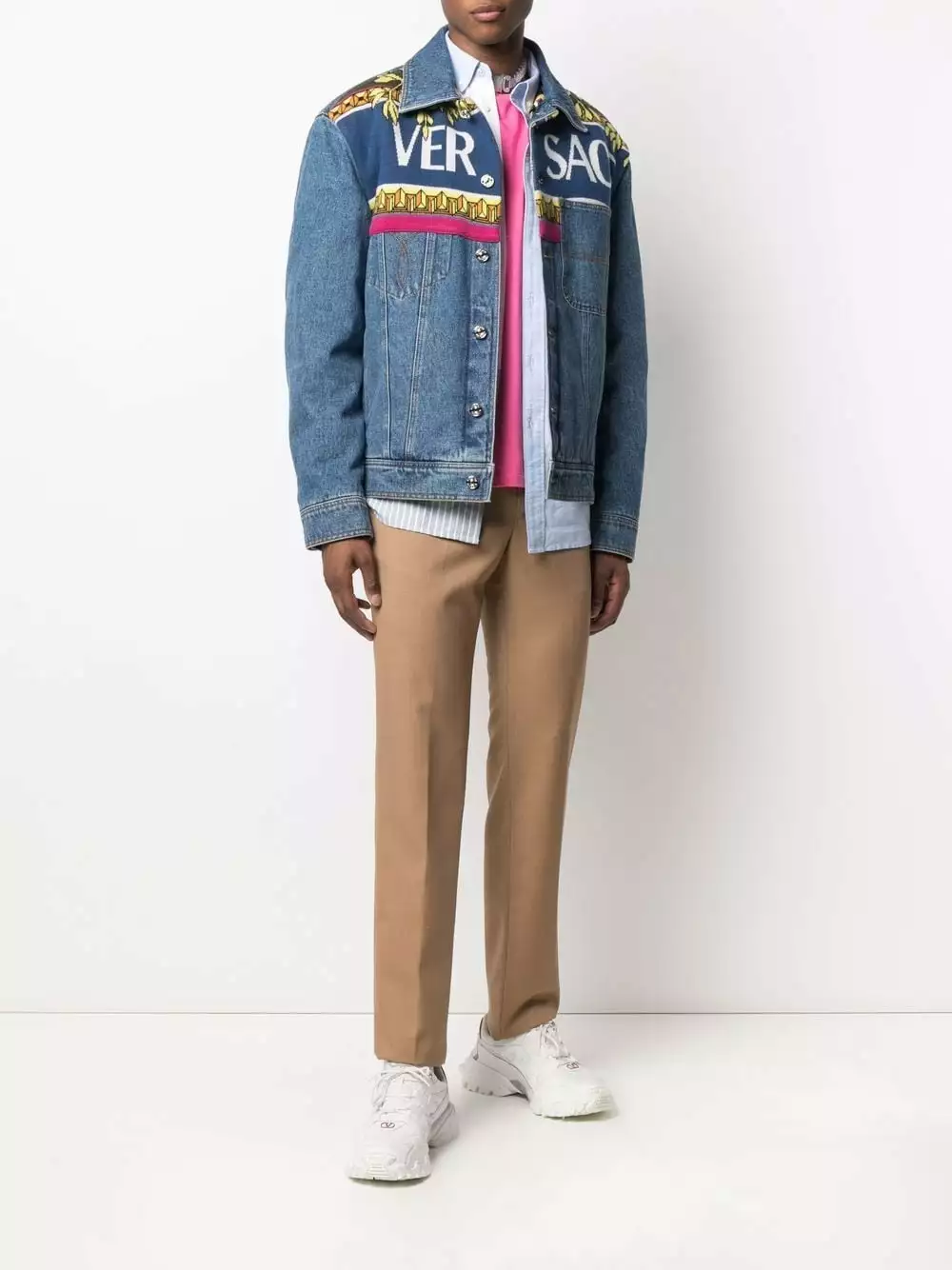 In true Versace style, the fashion House injects its inherently playful nature into a fashion favourite – the classic denim jacket. Incorporating a multicolour-hued knitted insert with an intarsia-knit logo, the AW21 design is finished with a detachable faux-fur collar for colder days ahead.