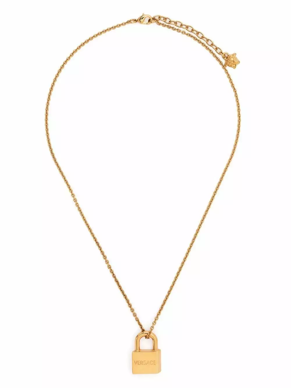 Celebrate the true icons of Versace history with this padlock pendant necklace for AW21. Crafted in Italy, in a gold-tone hue, it features a classic cable link chain and a suspended logo-engraved padlock pendant.