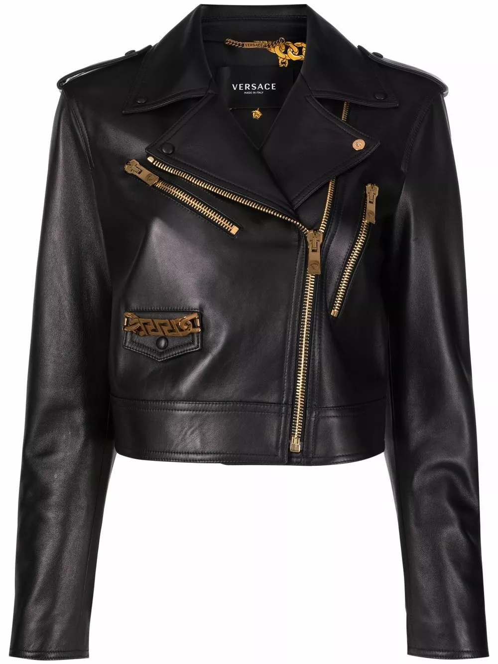 Versace’s Italian-made biker jacket is lined in the brands signature Greca chain motif. Fabricated from black lambskin, this cropped silhouette boasts complimentary gold-tone hardware.