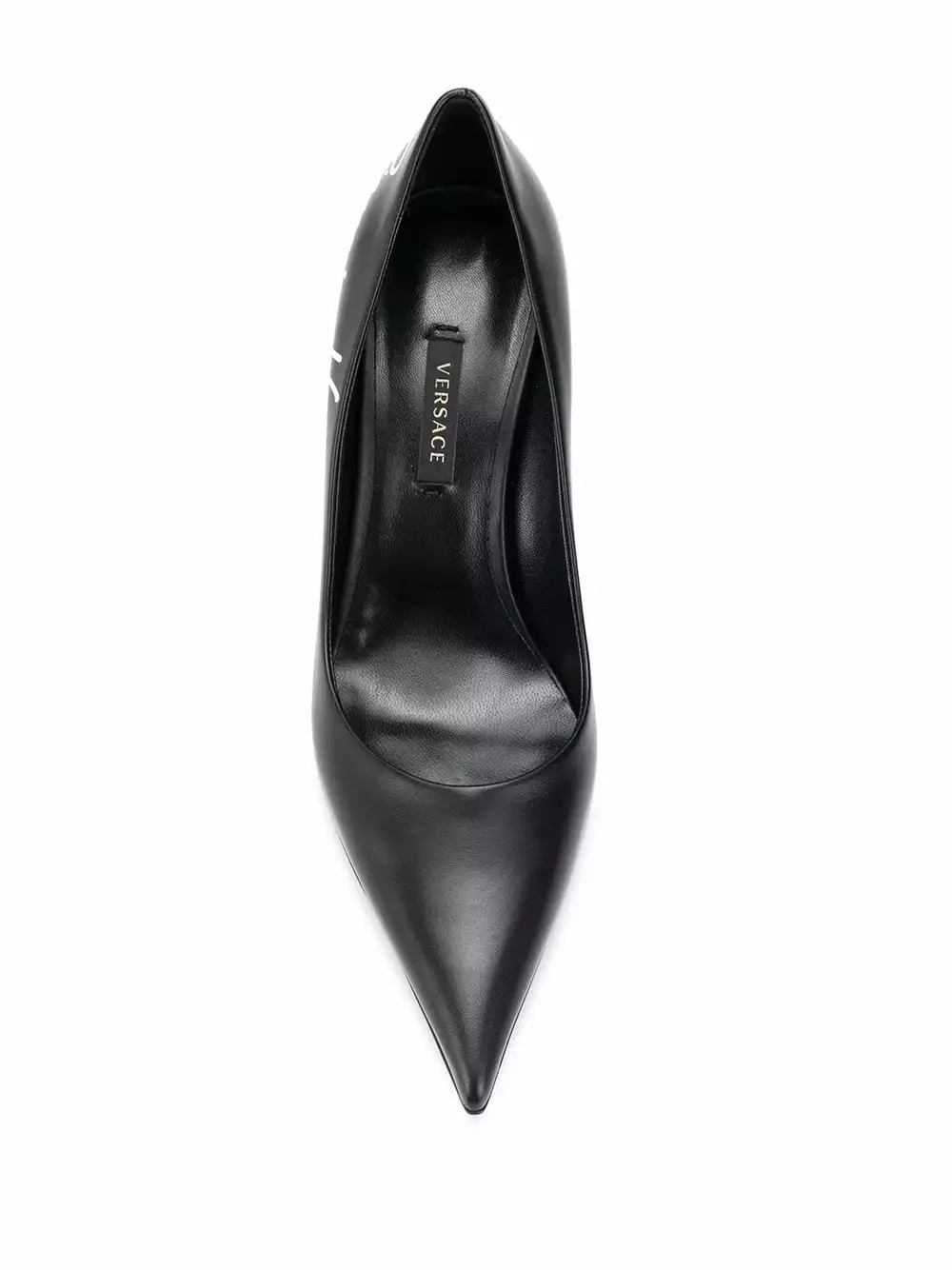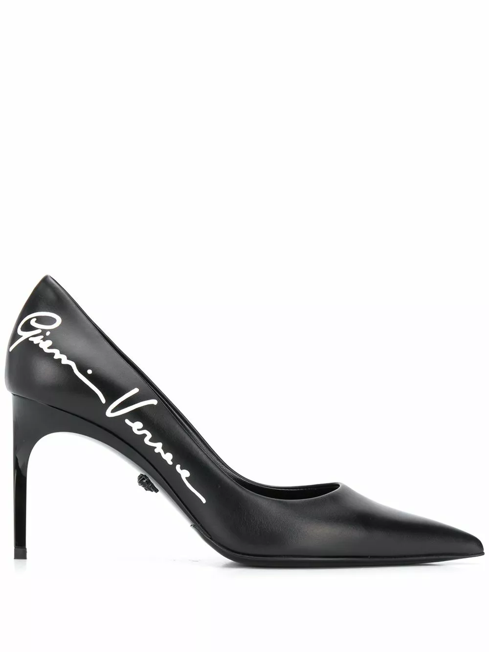 You’ve got the event, all you’re missing is the outfit. FInish off your evening attire with these logo-print 80mm pumps from Versace. Crafted from black leather, the pointed-toe pair come finished with a contrasting print of their ‘Gianni Versace’ logo.