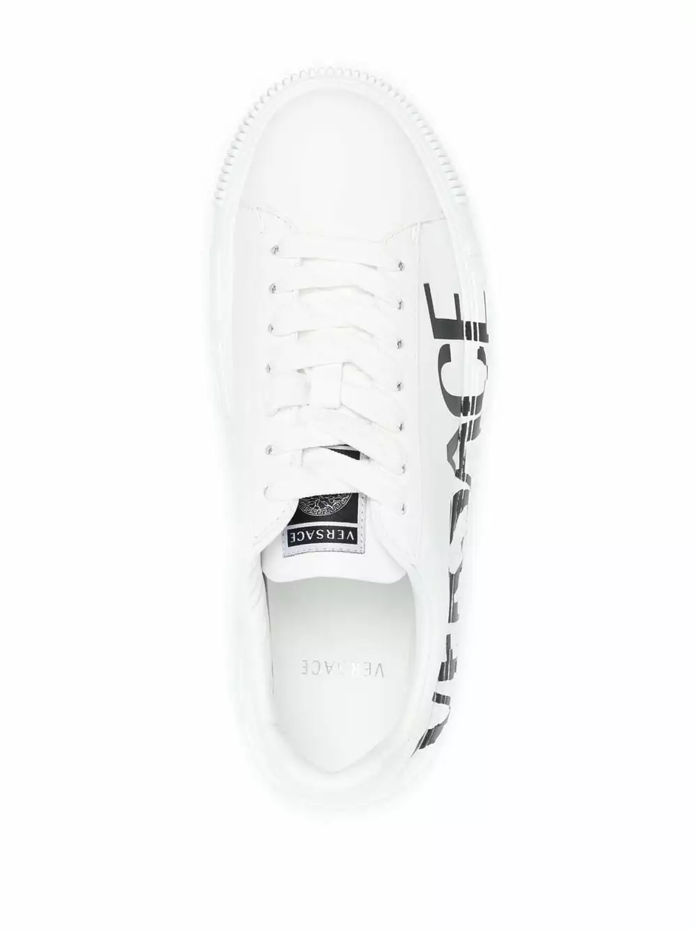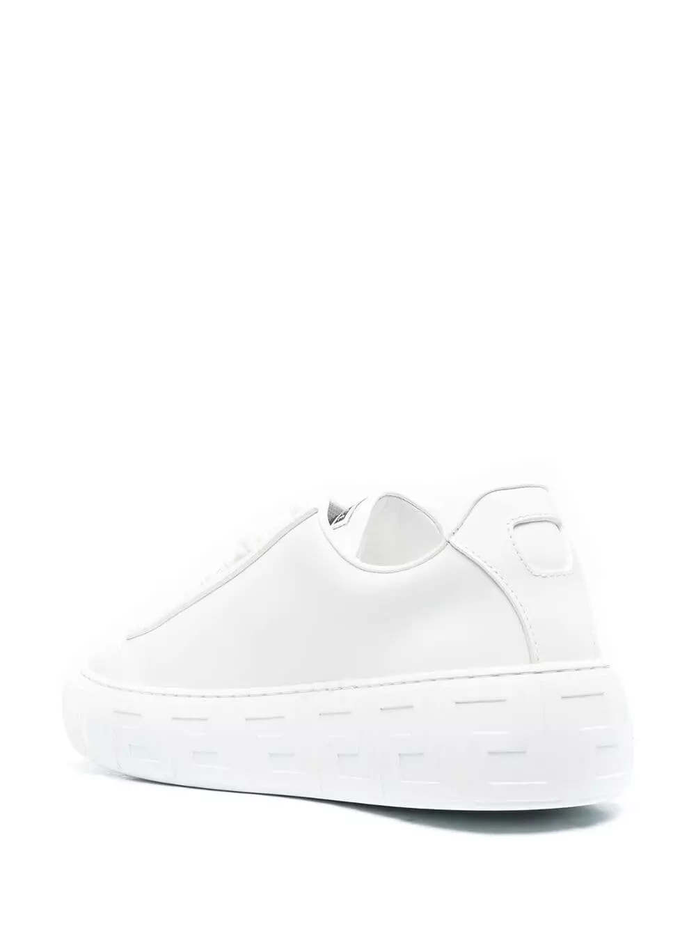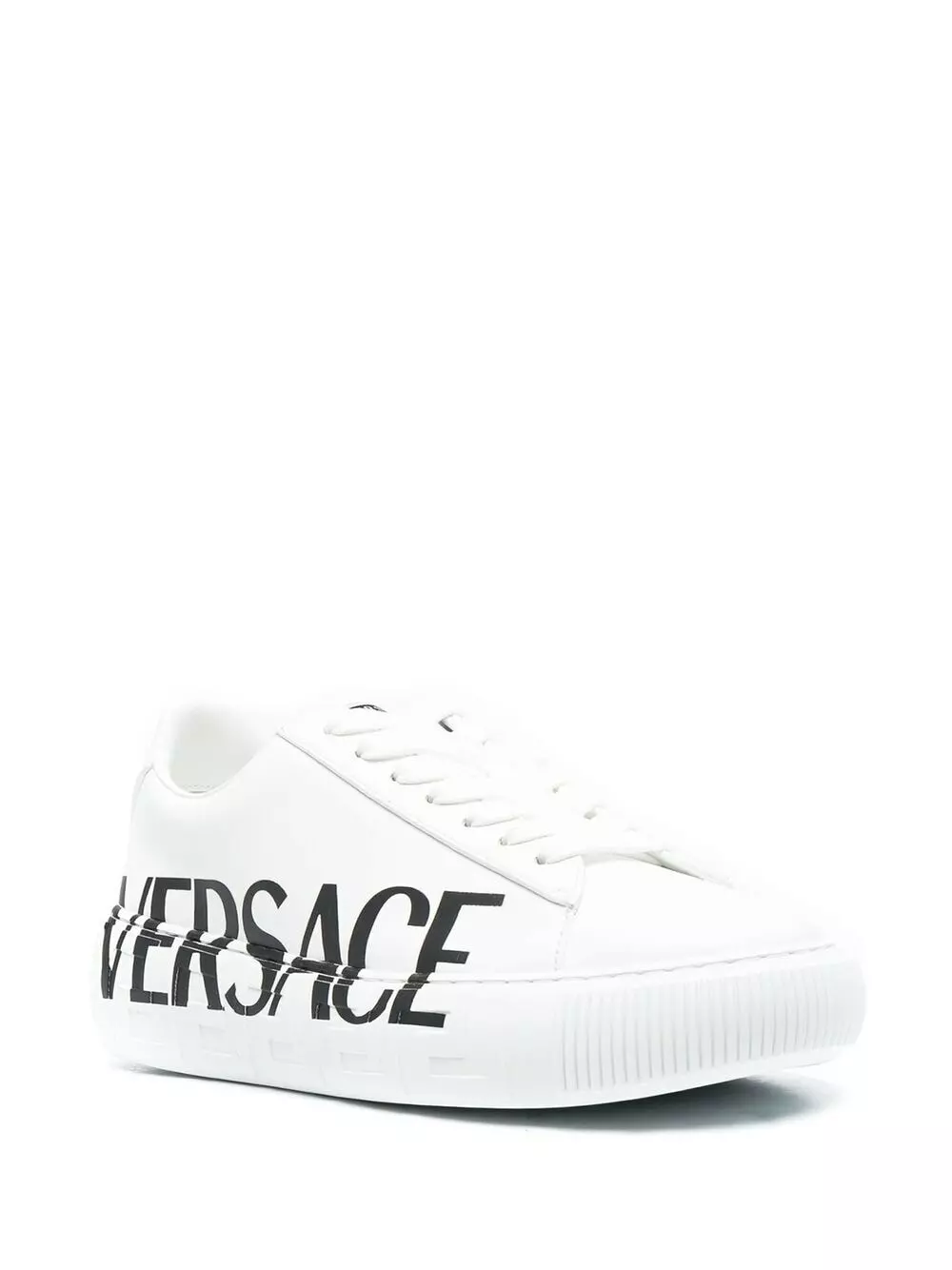 Say it in Versace. Designed in white leather, these low-top sneakers are detailed with the label’s bold lettered logo printed in black to one side. They sit atop a chunky rubber outsole complete with Greca motif embossing so you’ll always step out in style.