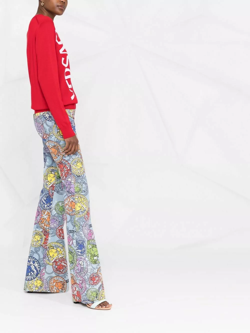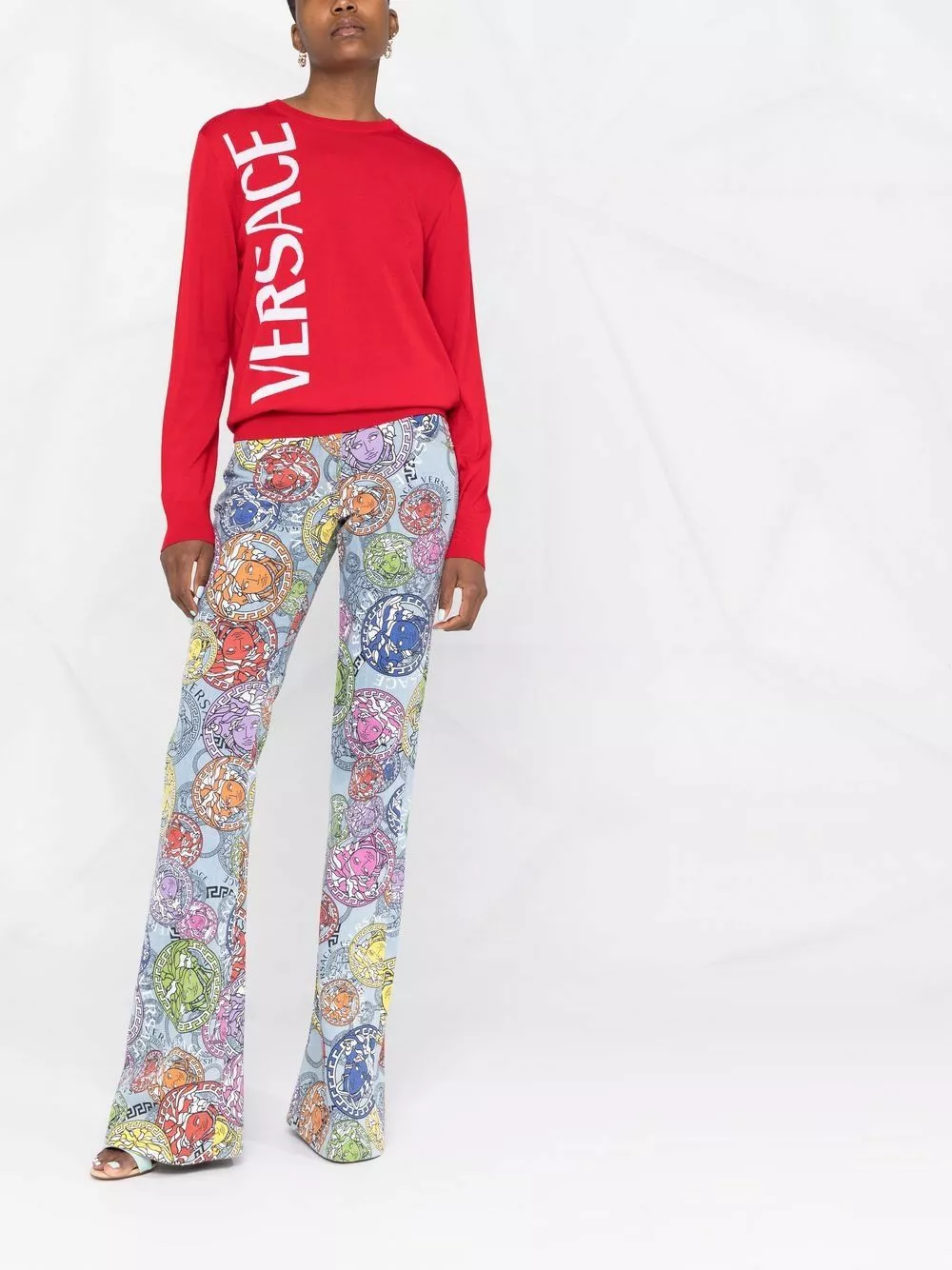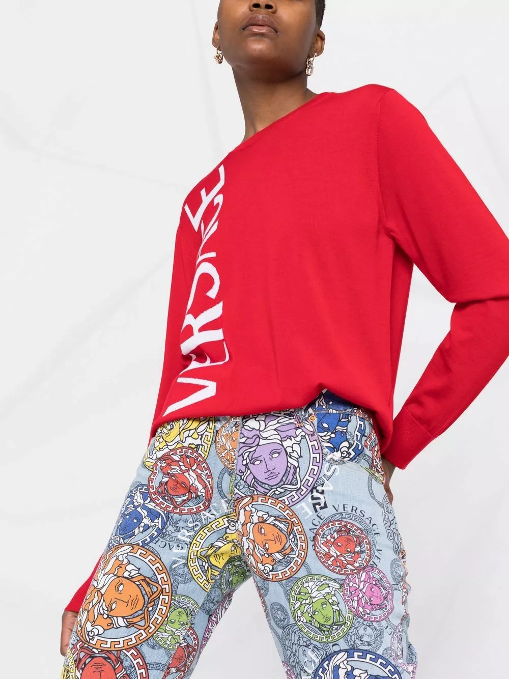 Stepping back from its signature bold patterns, Versace takes a subdued moment to present this jumper. Crafted from soft red wool, a contrasting logo print sits to the side.