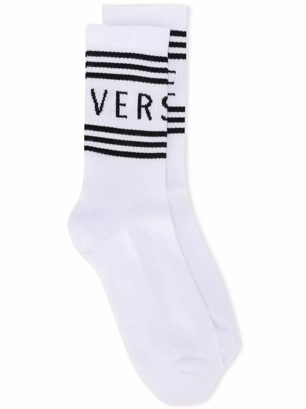 Your look isn’t complete until you’ve slipped into these white and black cotton blend logo socks from Versace. Pair them with your favourite pair of sneakers. Featuring a ribbed knit and a mid-calf length. Socks and Hosiery must be returned in its original unopened packaging.