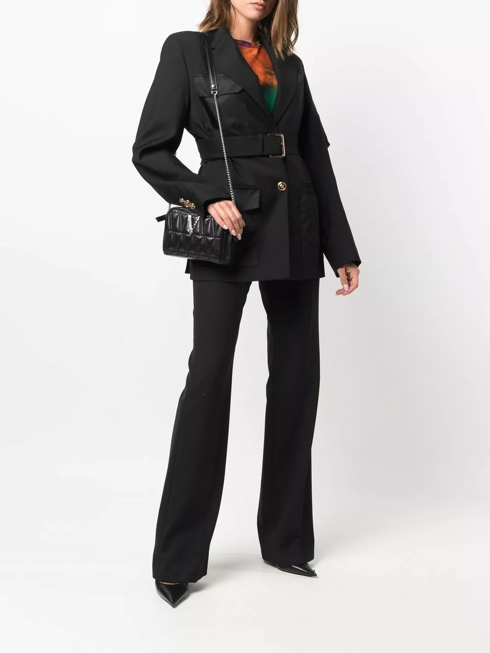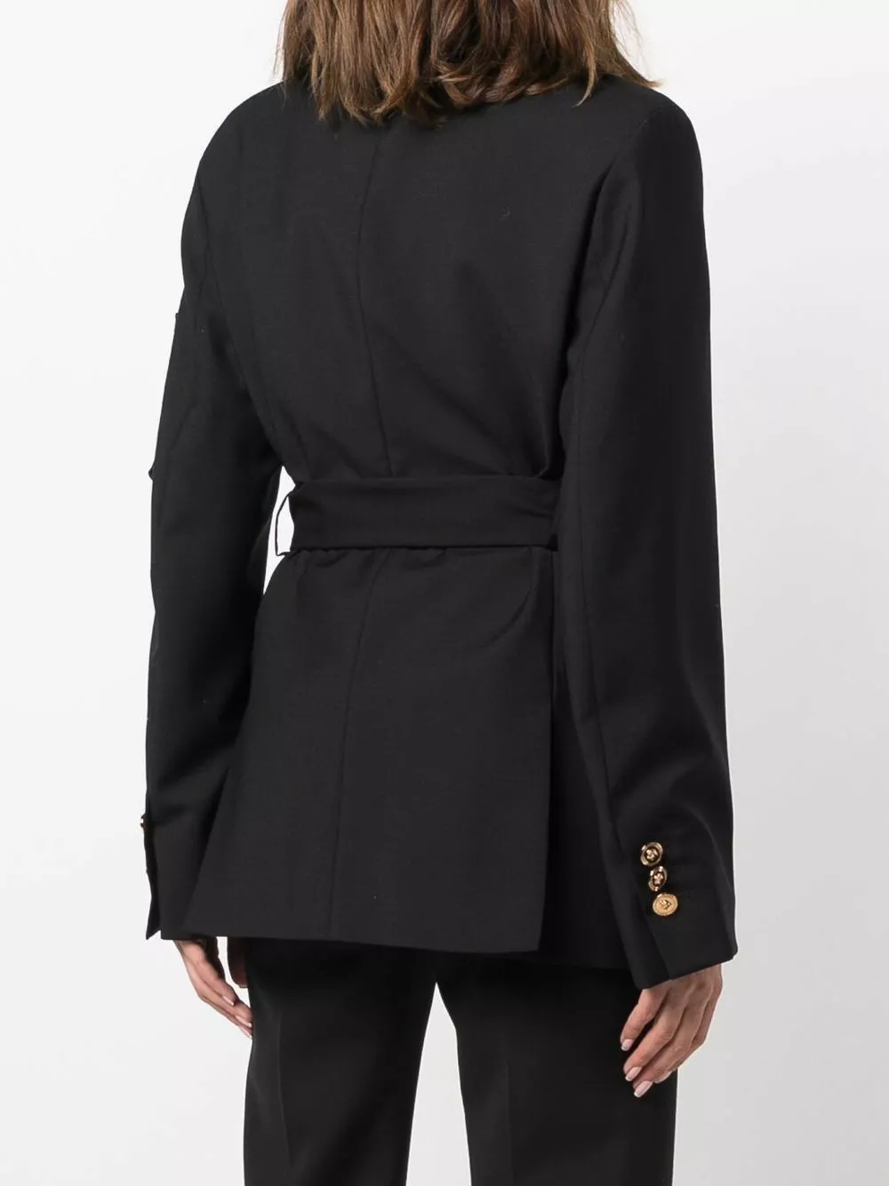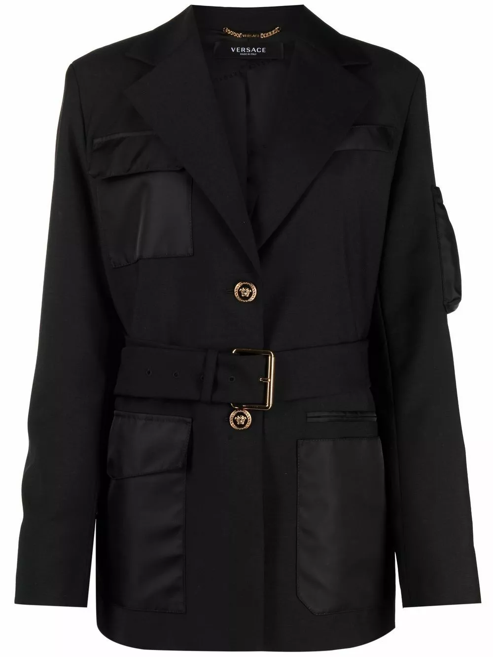 Gold-tone hardware adds an opulent touch to this belted jacket from Versace. The heritage Medusa head motif – a mainstay at the brand since 1993 – appears as an embossed button detail.