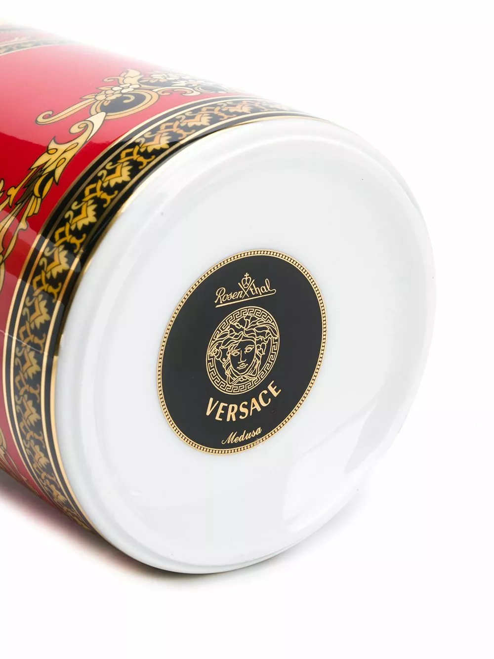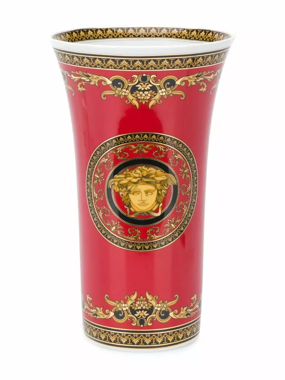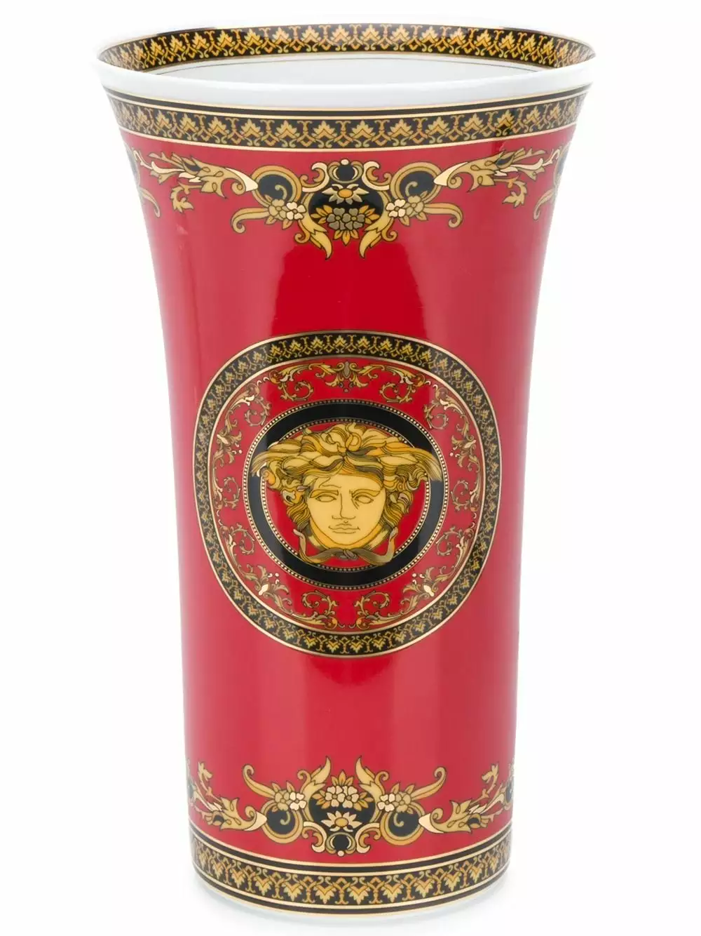 Red, black and gold-tone porcelain Medusa baroque vase from Versace Home featuring a baroque pattern and a Medusa detail.