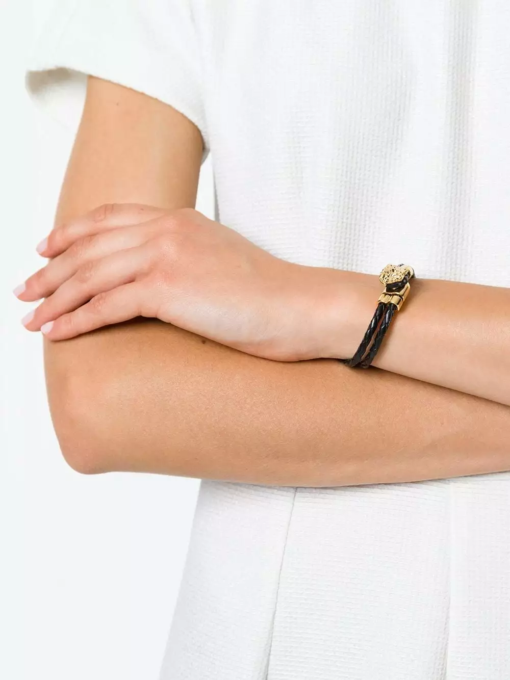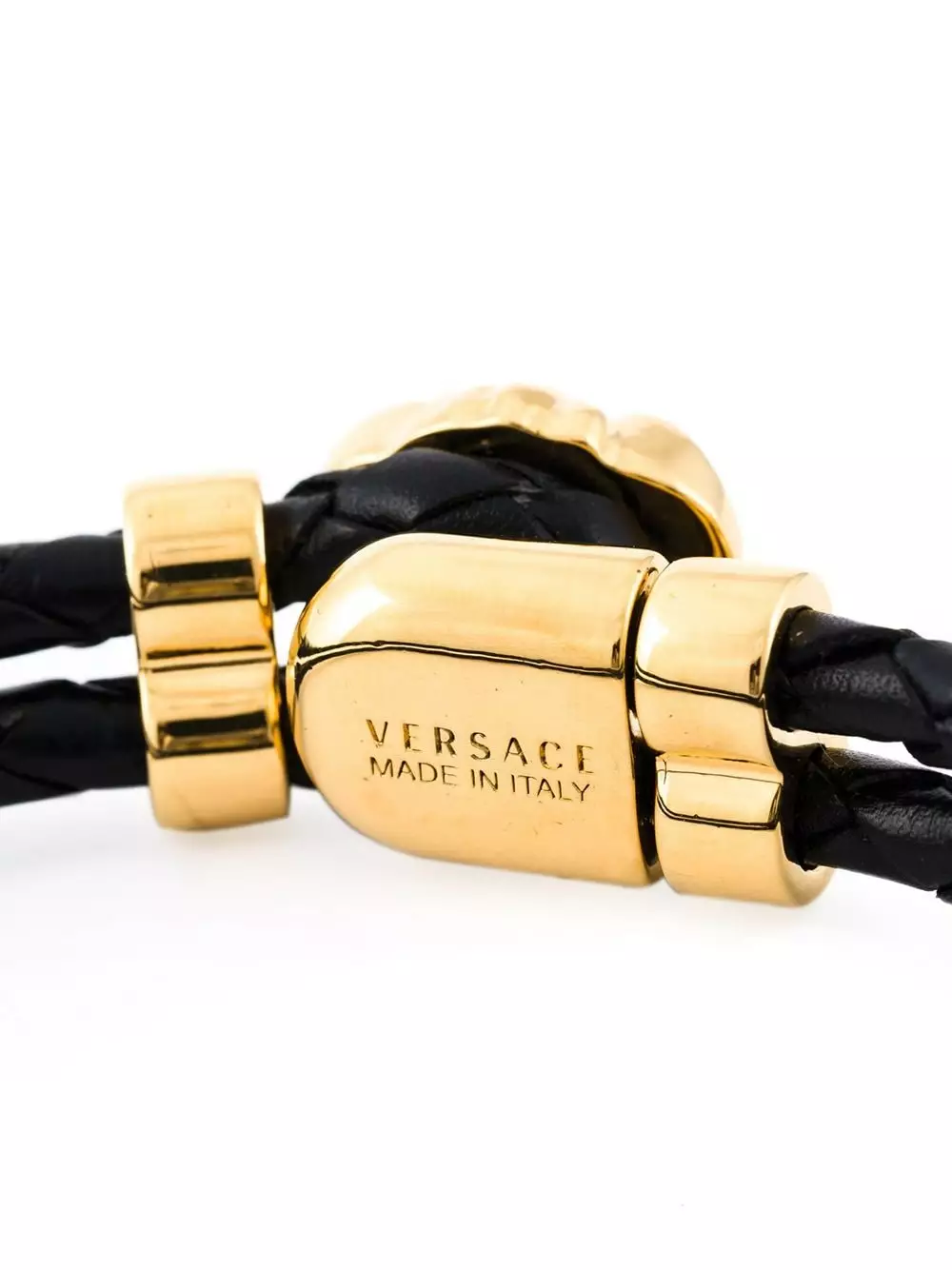 Black and gold calf leather Medusa bracelet from Versace featuring gold-tone hardware, a back embossed logo stamp and a toggle fastening.