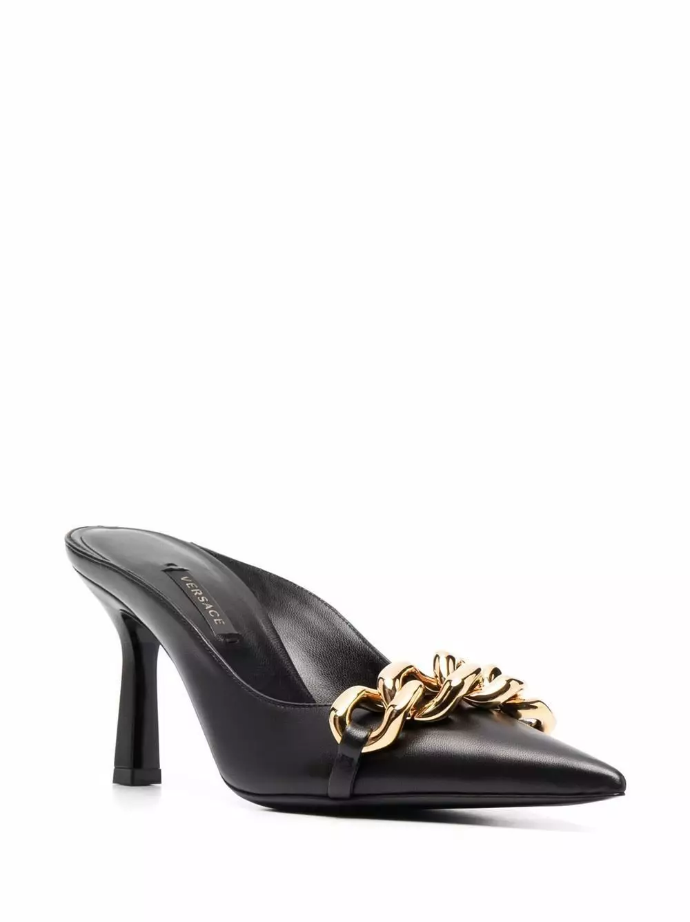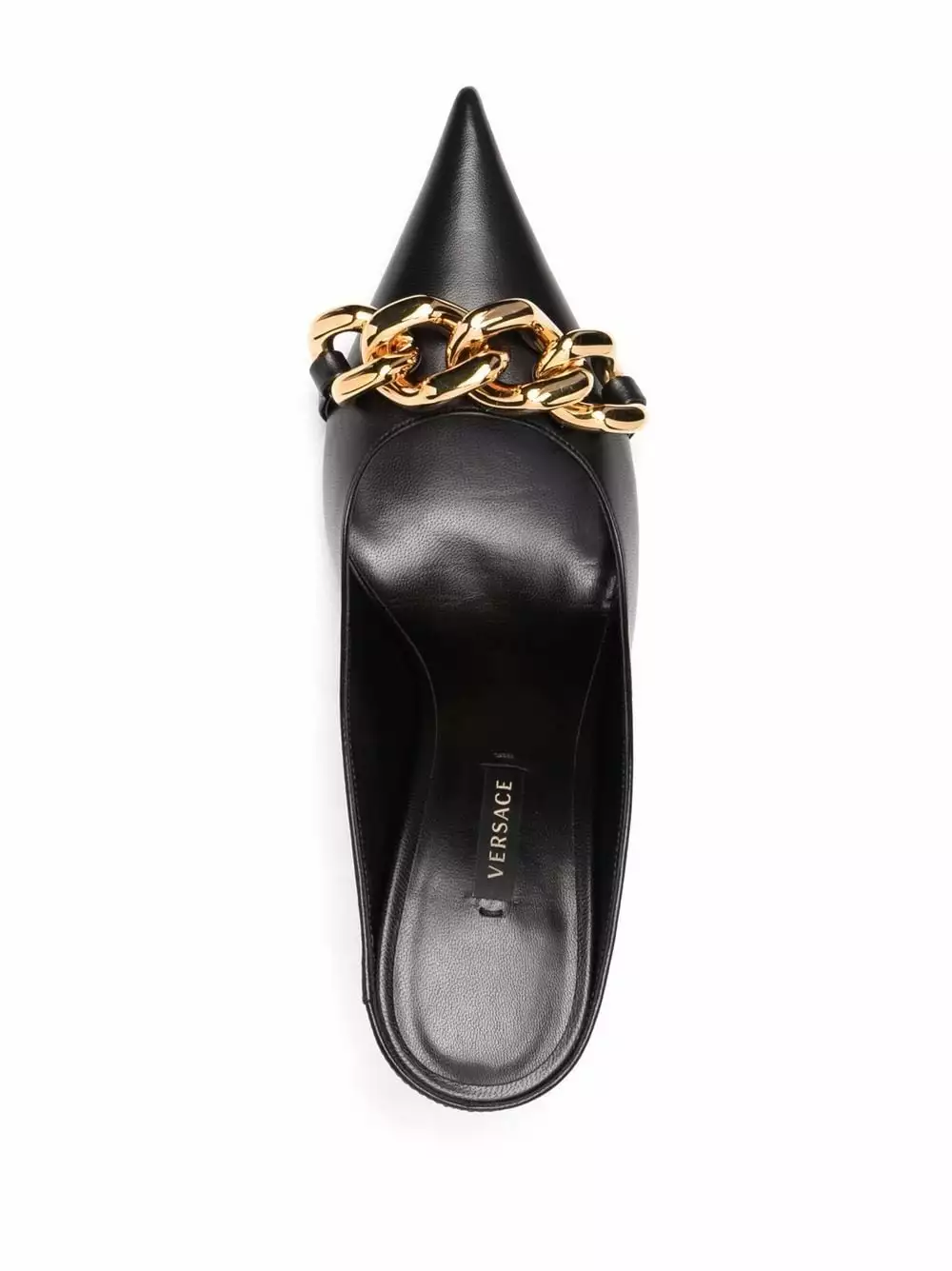 Gianni Versace’s iconic Medusa head motif was inspired by ruins on the floor of the area Reggio Calabria in Italy where he played as a child. It is detailed to the underfoot of these backless mules, which also feature a maxi chain trim across the toe.