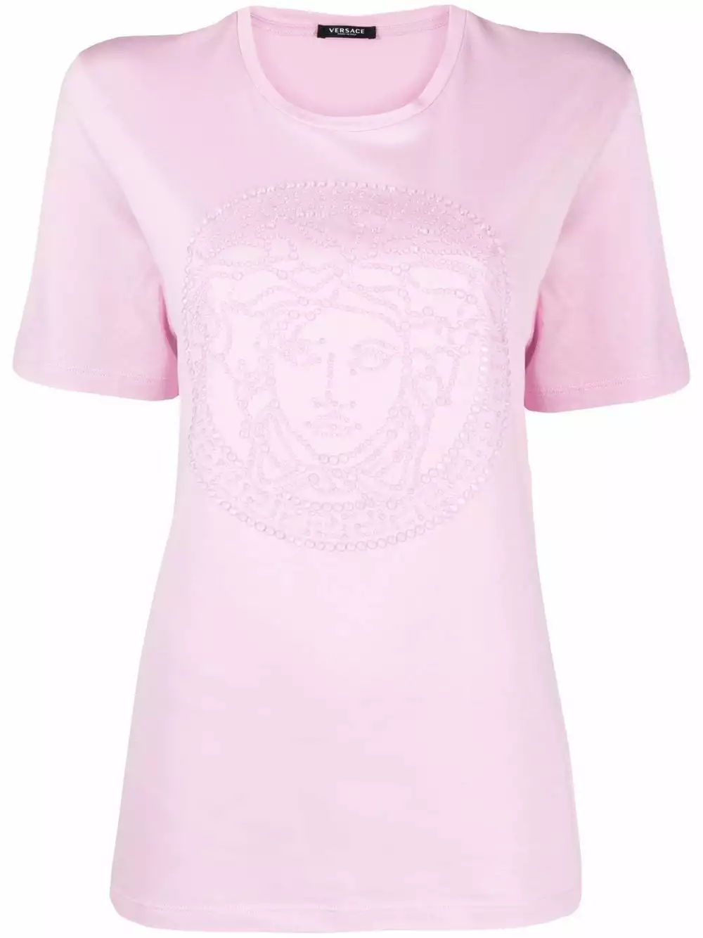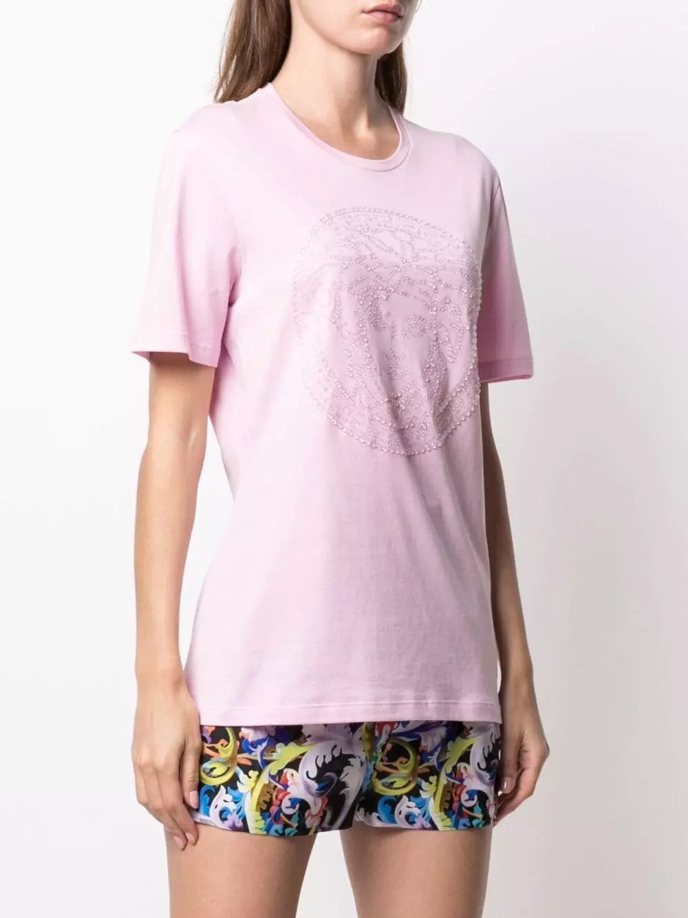 A relaxed design with Versace’s essence. Crafted from cotton, this T-shirt is adorned with the iconic Medusa motif made entirely from tonal crystals.