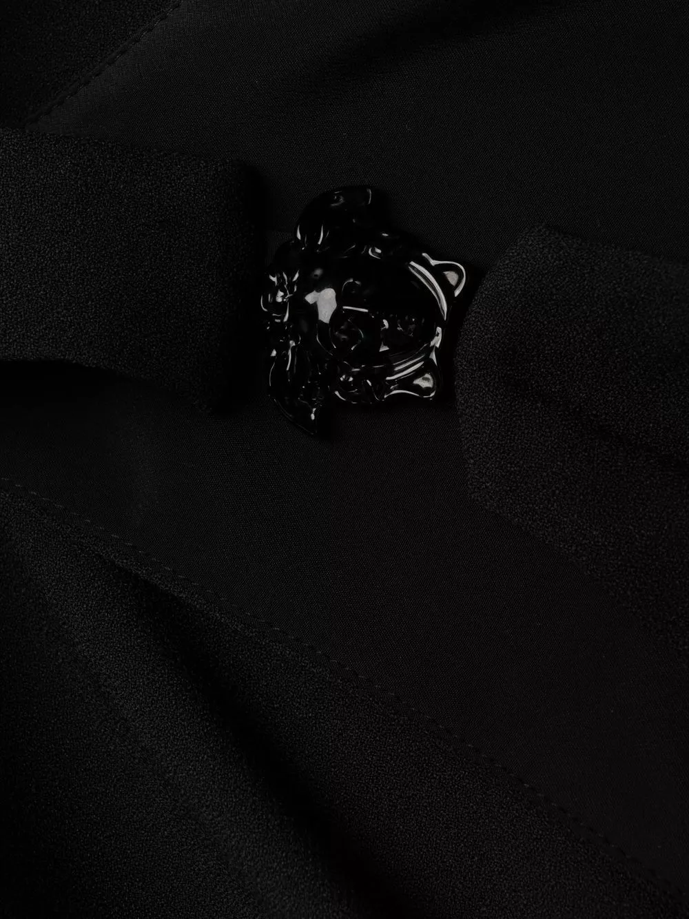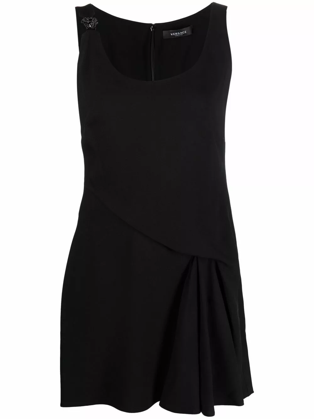 Versace’s minidress is a relatively understated creation from the Italian House lauded for its bold collections. This draped iteration is accented with a glossy Medusa plaque at one shoulder – the motif featured on the doors of the brand’s first Headquarters in Milan.