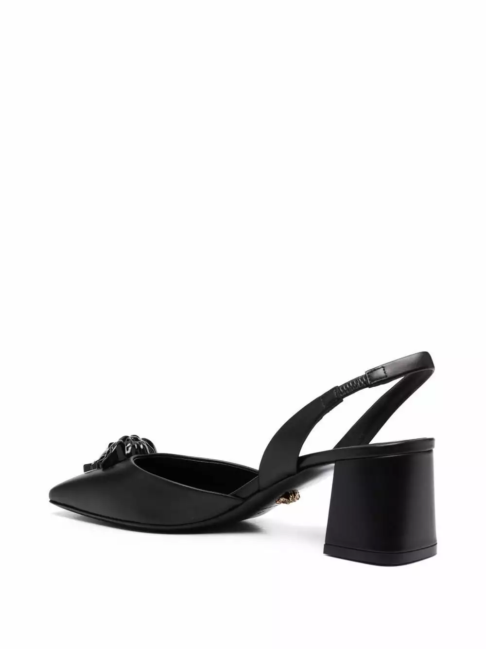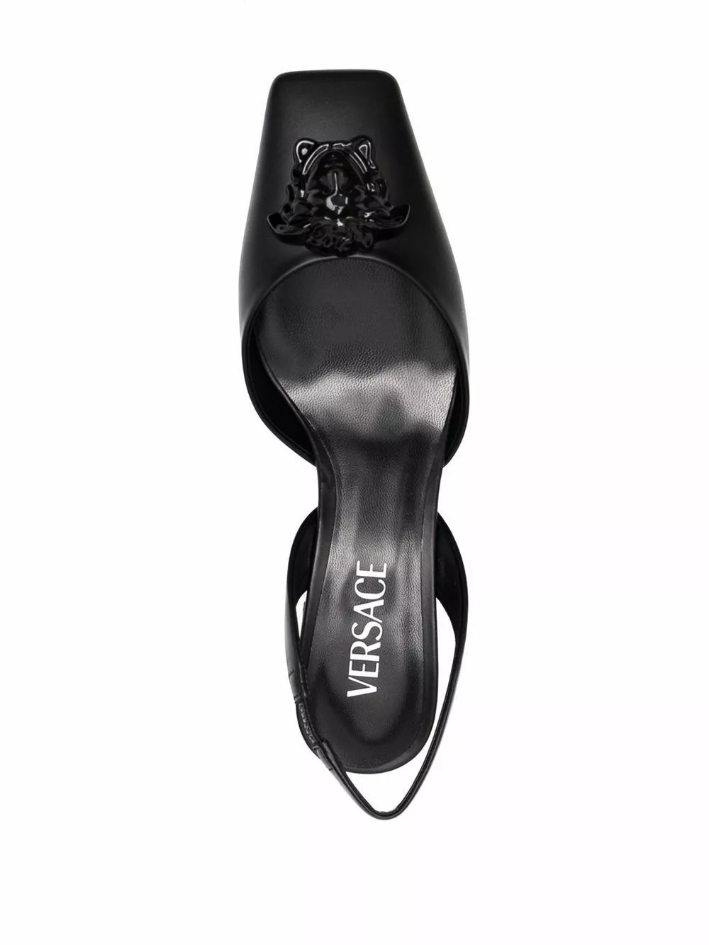Medusa is a recurring motif in Versace’s collections. These black leather pumps feature the mythological figure as a tonal plaque motif on the top.