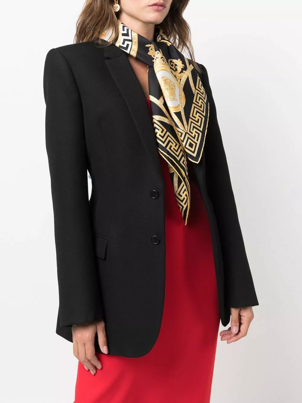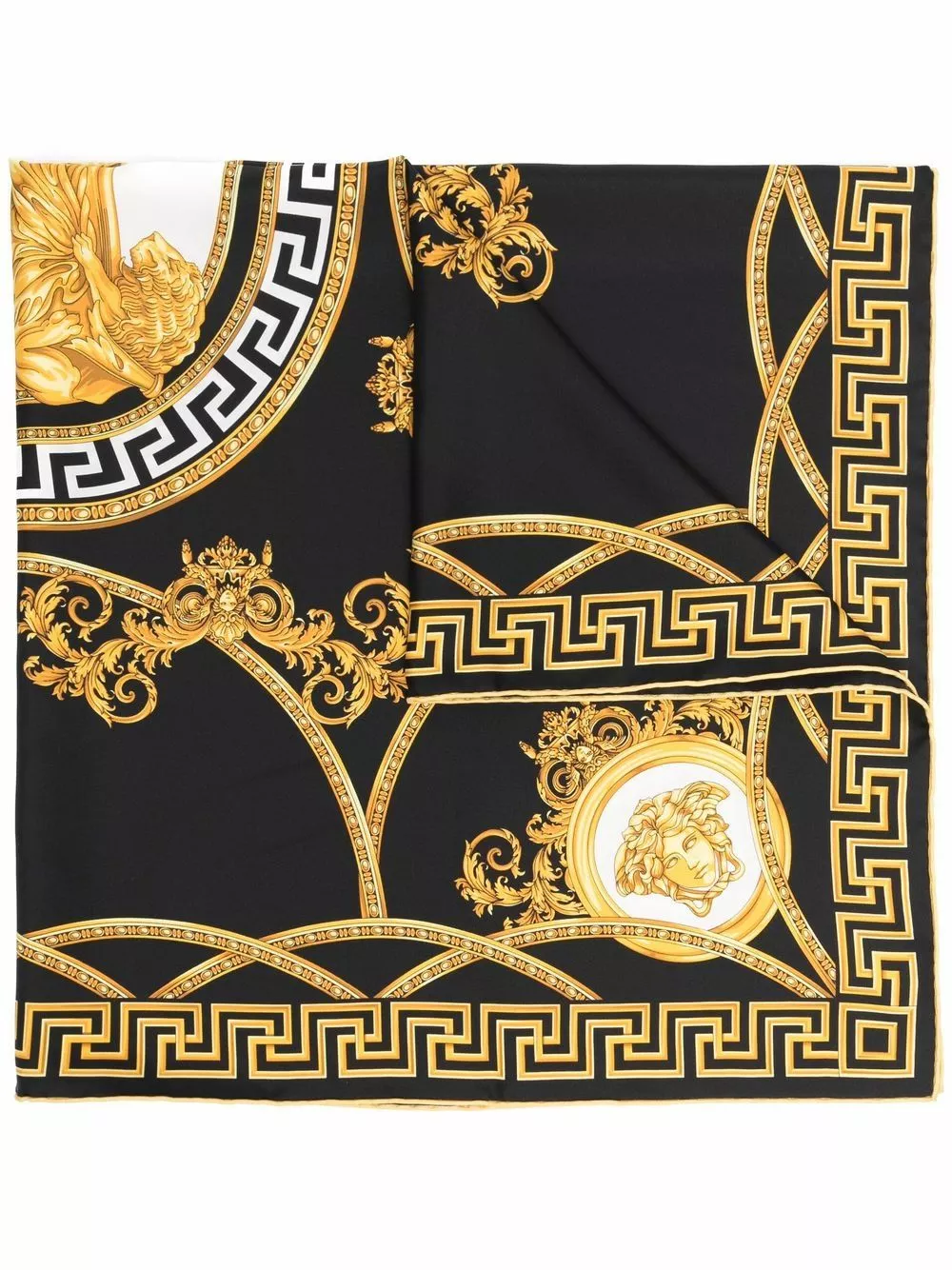 The Medusa head is a synonymous motif of Versace designs and is featured on this silk scarf. Alongside baroque pattern detailing and the signature Greca pattern, the brand’s more is more approach to opulence is showcased.