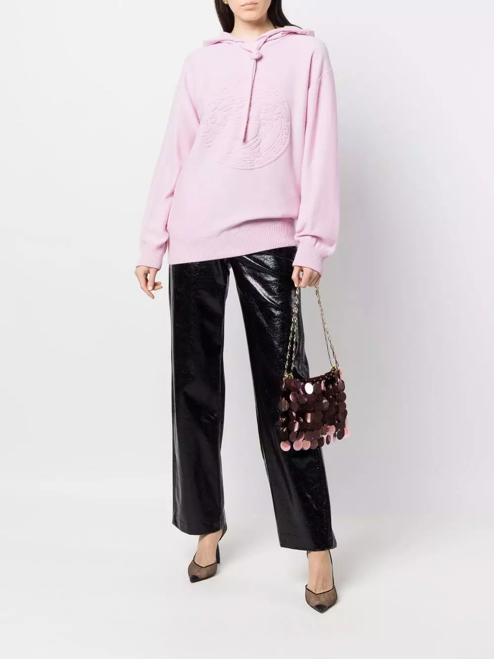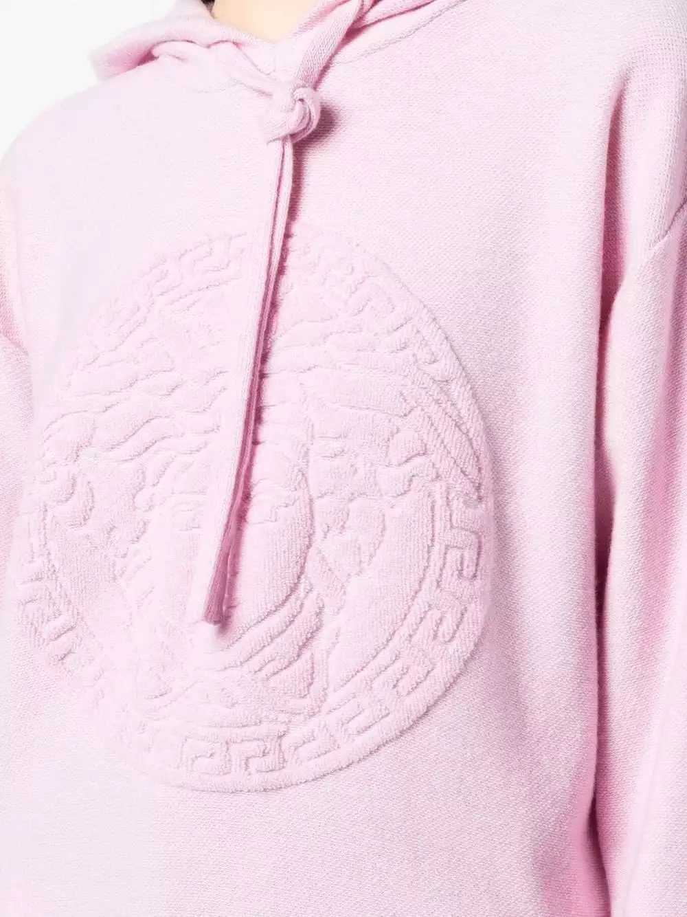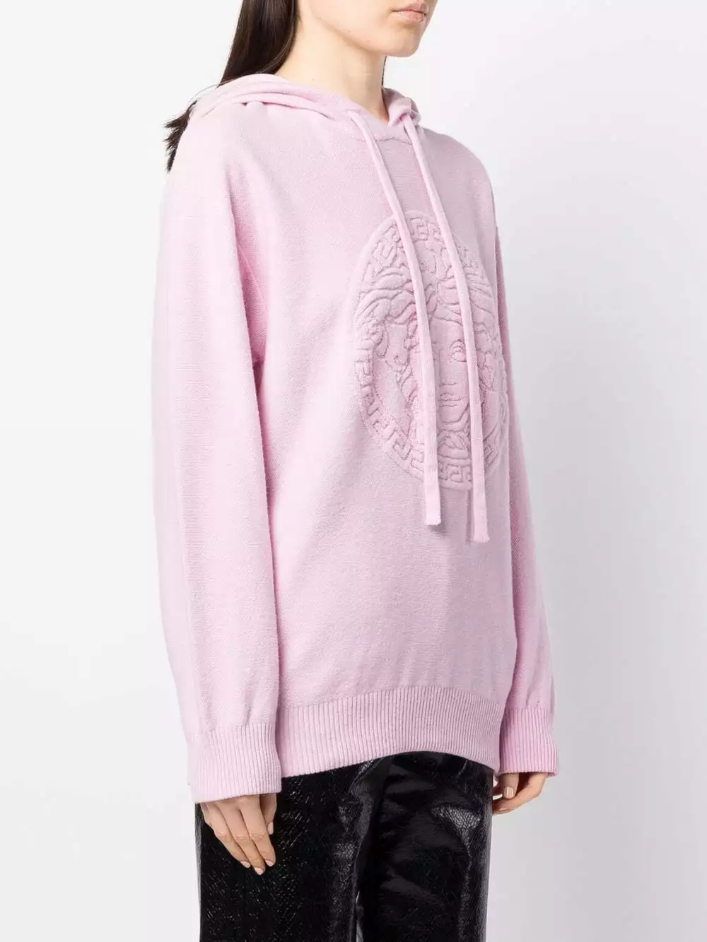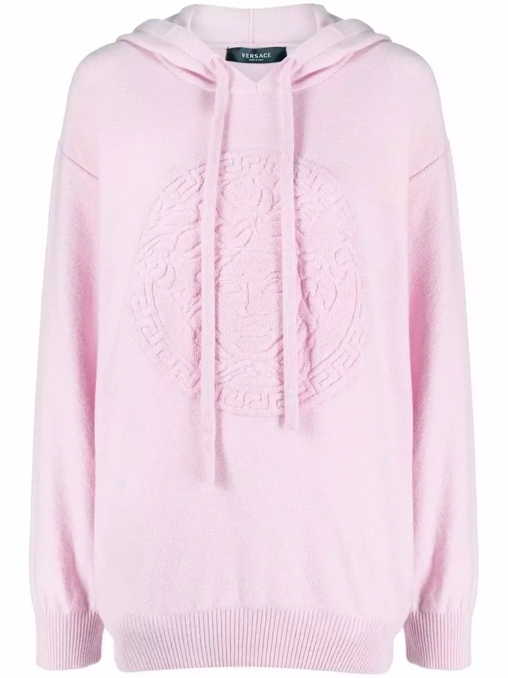 A signature of the brand, Versace’s Medusa head motif decorates the front of this hoodie in a tonal pink hue. This classic hooded silhouette is knit from a soft blend of wool and cashmere.