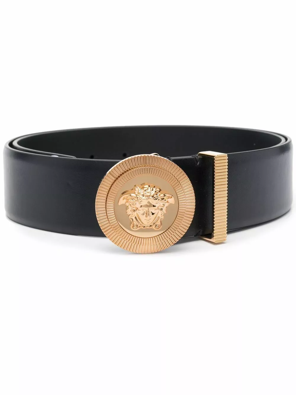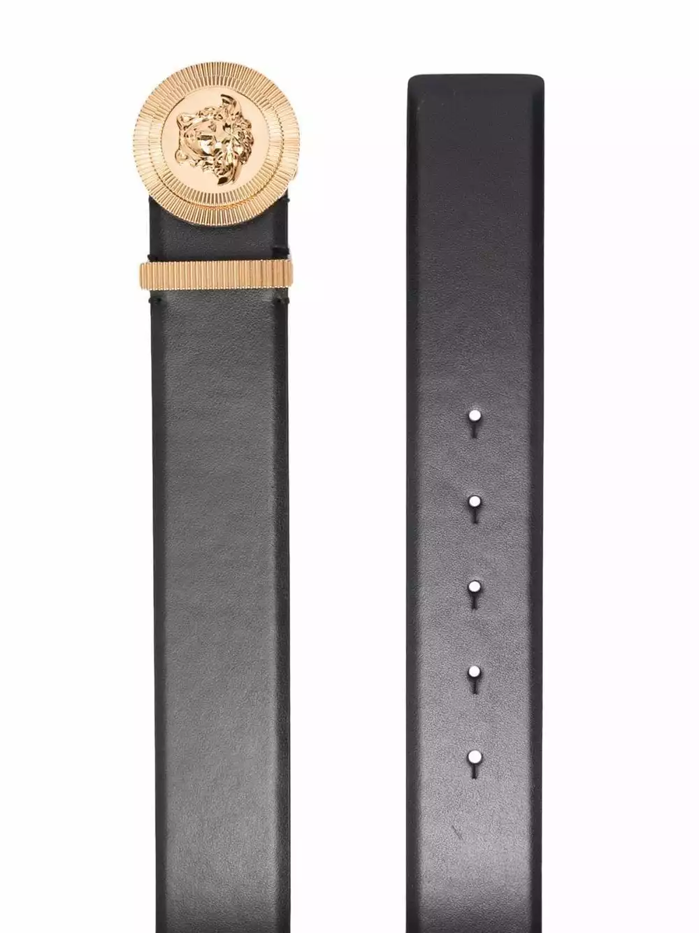 One of Versace’s iconic motifs, the Medusa Head, is rendered in gold-tone hardware decorating this belt for AW21.