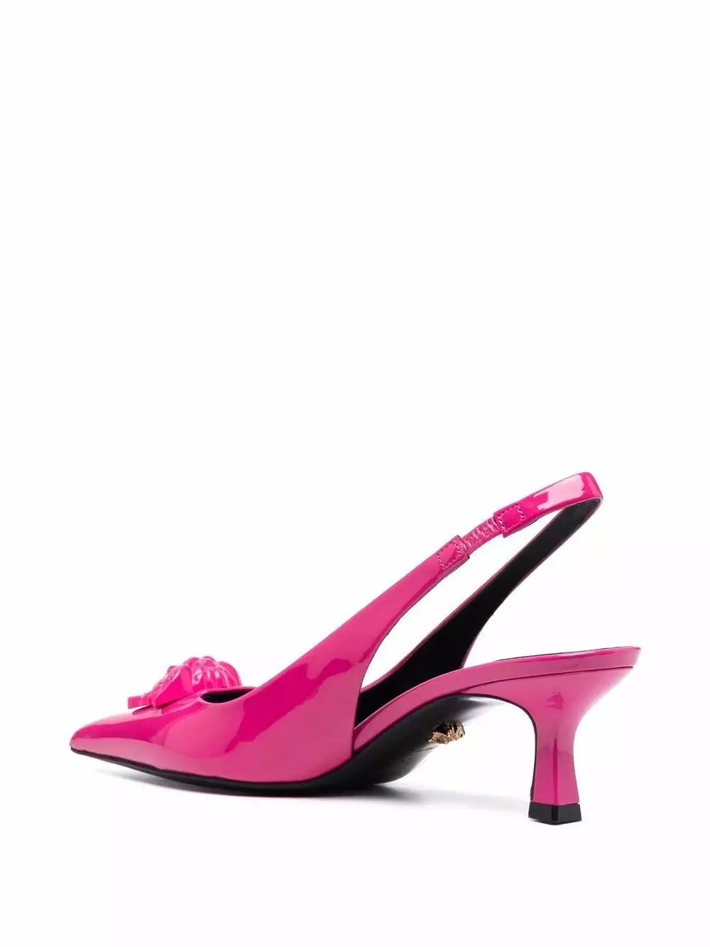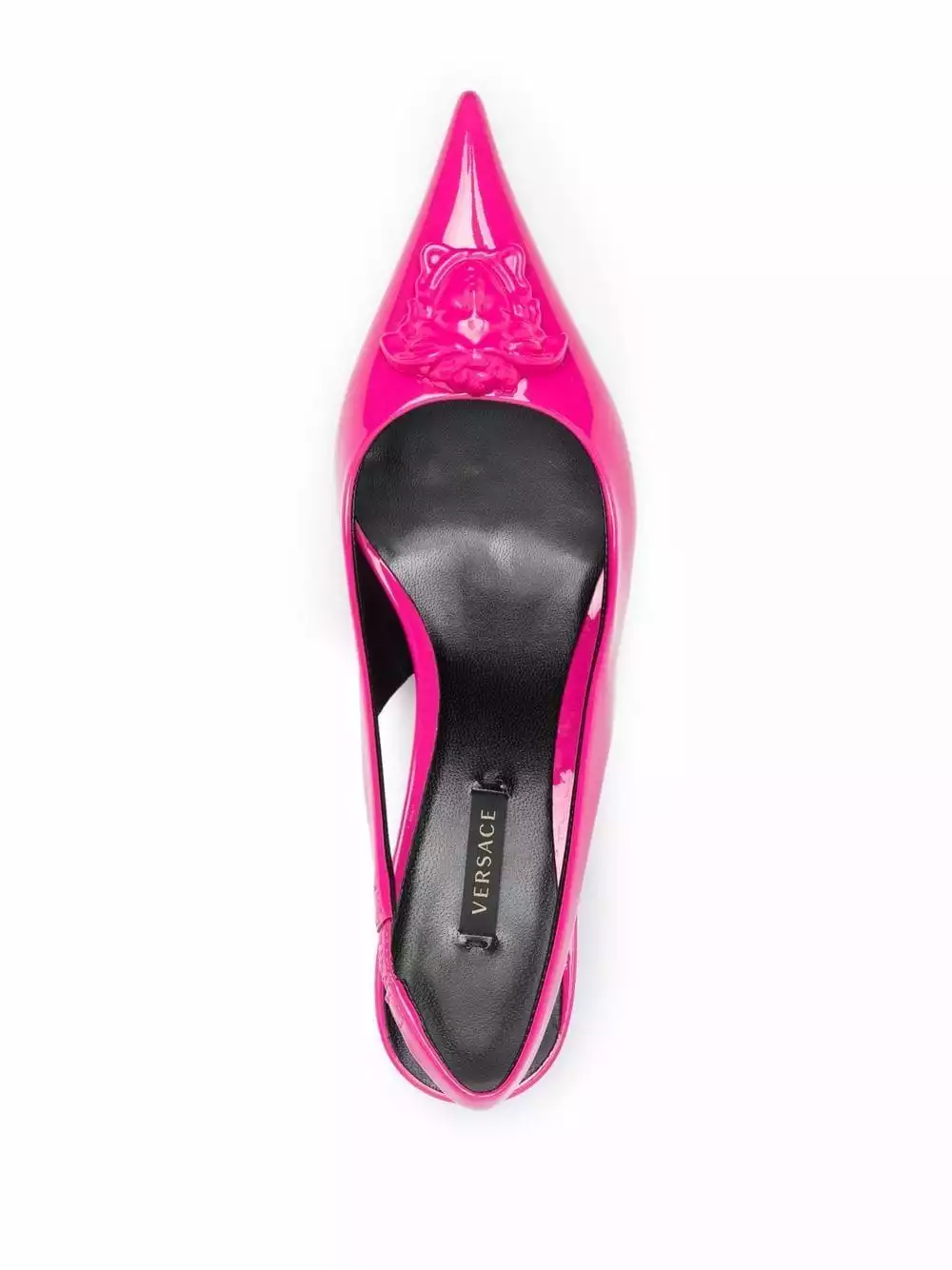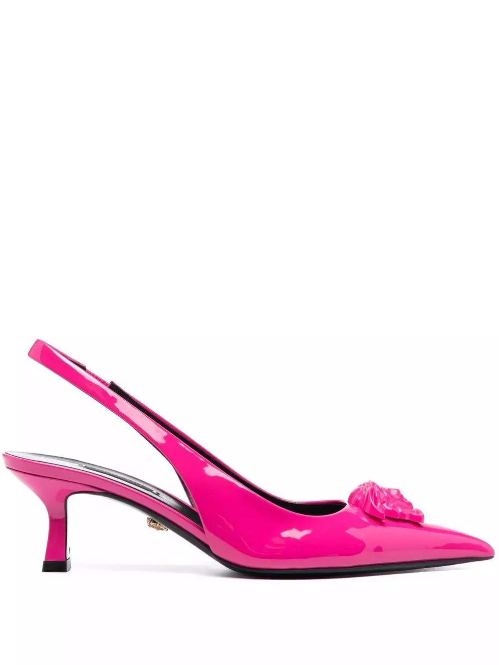In keeping with the brand’s typical use of bold embellishments, Versace presents these fuchsia pink slingback pumps for AW21. They feature tonal Medusa detailing at the front and are distinguished by the brand’s signature Greek mythological motif.