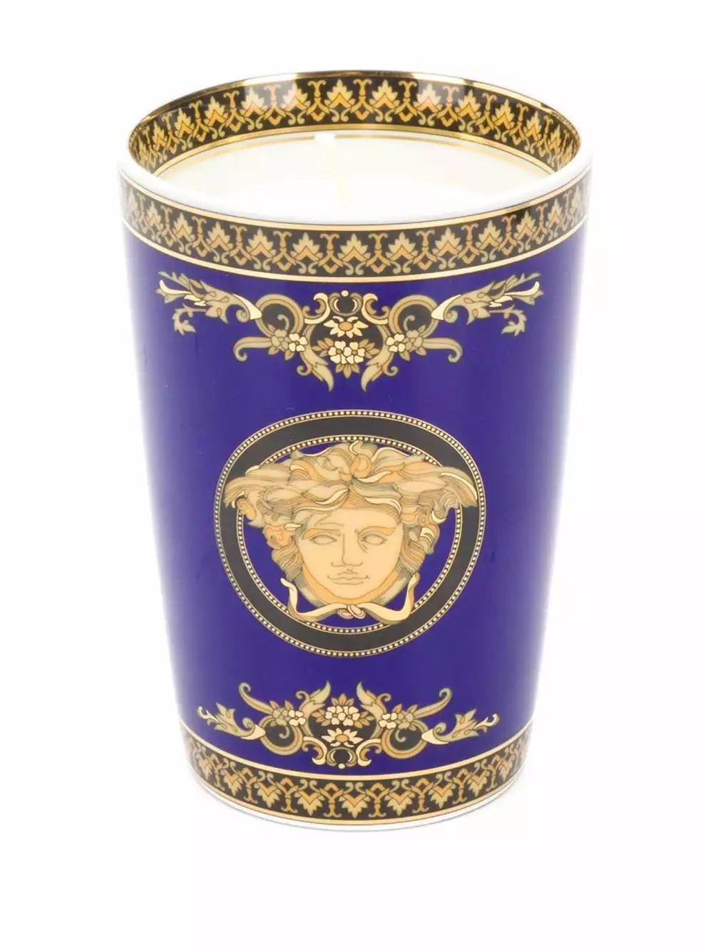 Multicoloured porcelain Medusa print scented candle from Versace Home featuring a baroque print, a top candle handle, a cotton wick and a burning time of over 60 hours.