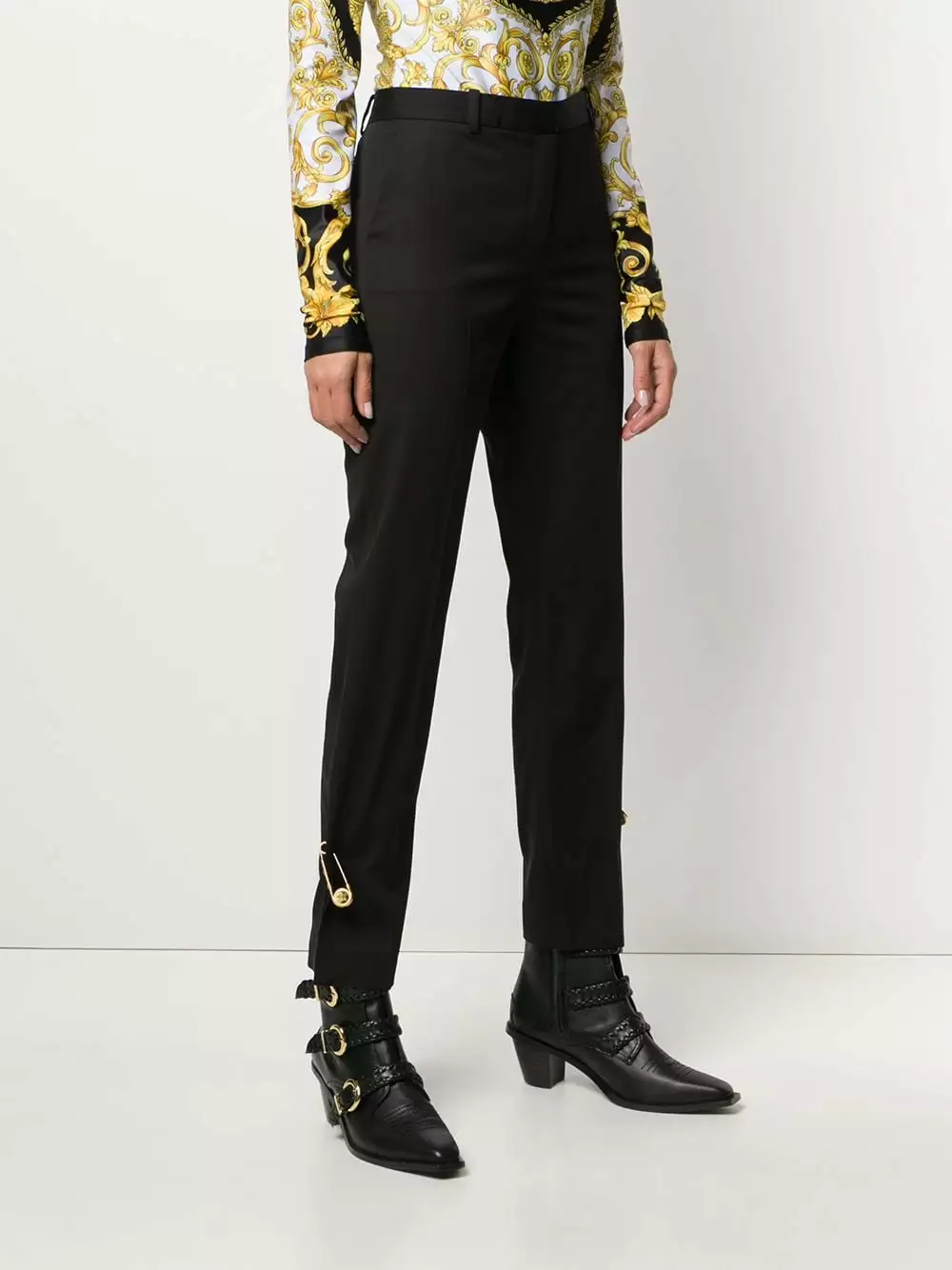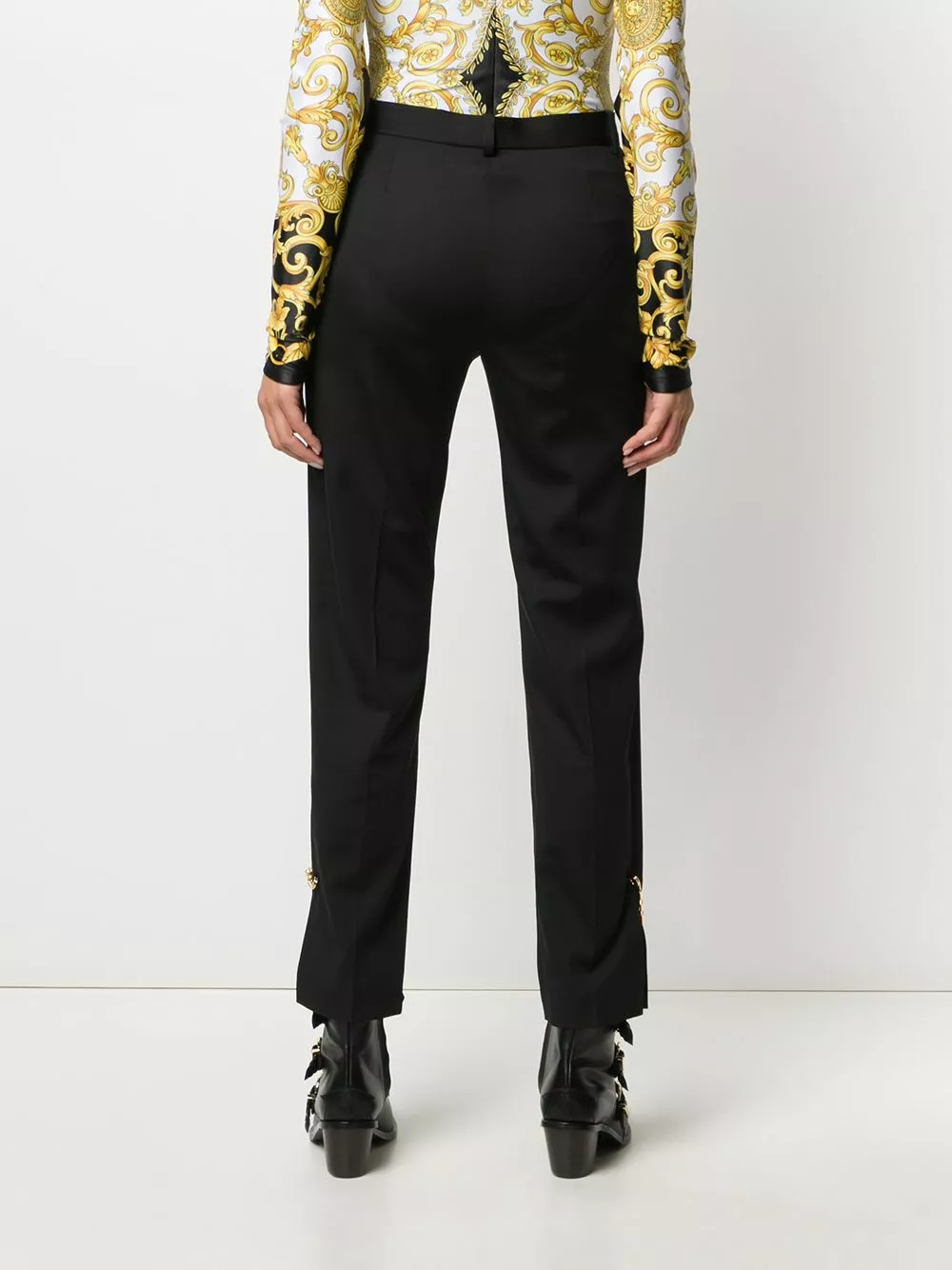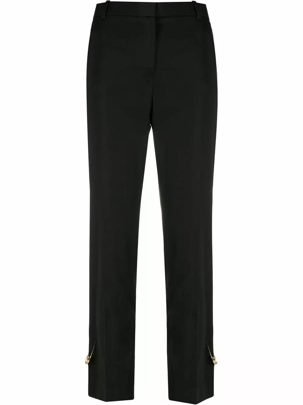 You can never go wrong with a pair of black trousers. Crafted from wool-blend, these slim-fit trousers from Versace are detailed with Medusa head safety pins to the cuffs which gives them a bold touch. The perfect pick for a smart-casual look. Featuring a high waist, a waistband with belt loops, a concealed front fastening, side slit pockets, slits at the hem and a regular length.