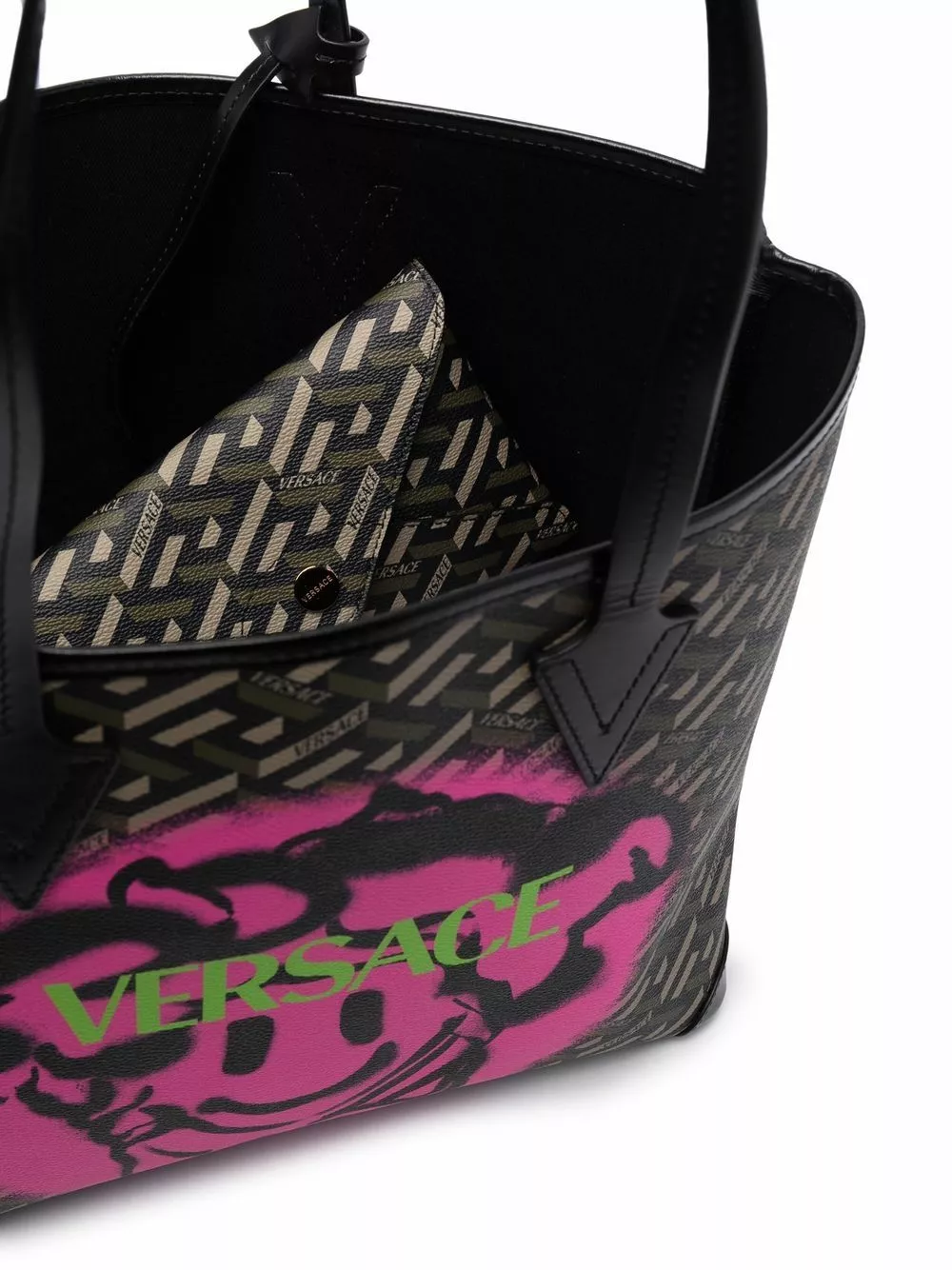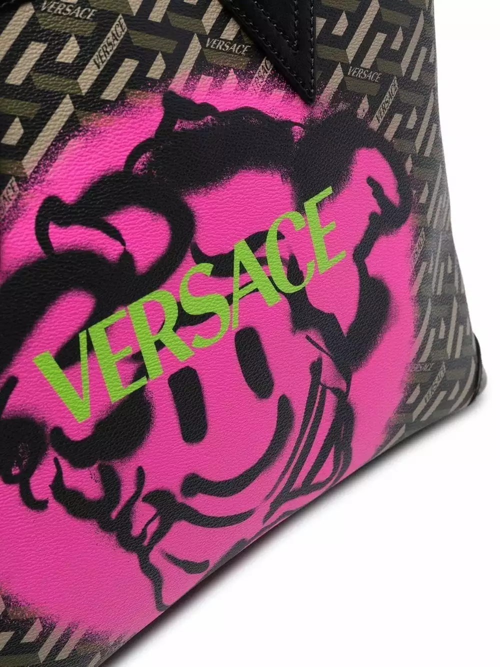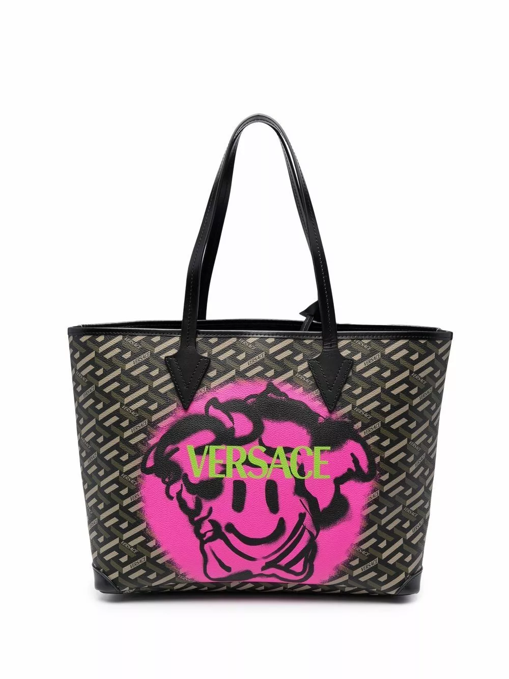 Versace adds a playful twist to the renowned Medusa Head with this tote bag. Crafted from faux leather with a signature La Greca print, the Italian powerhouse is adorned with a graffiti-inspired Medusa Smiley motif, a design that nods to the dancefloor communities of the 1990s.