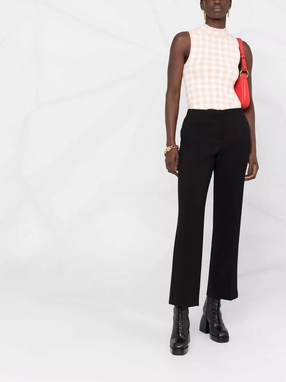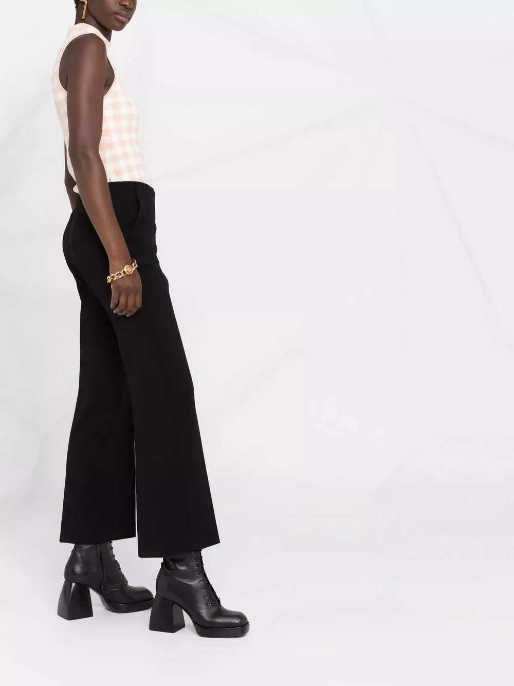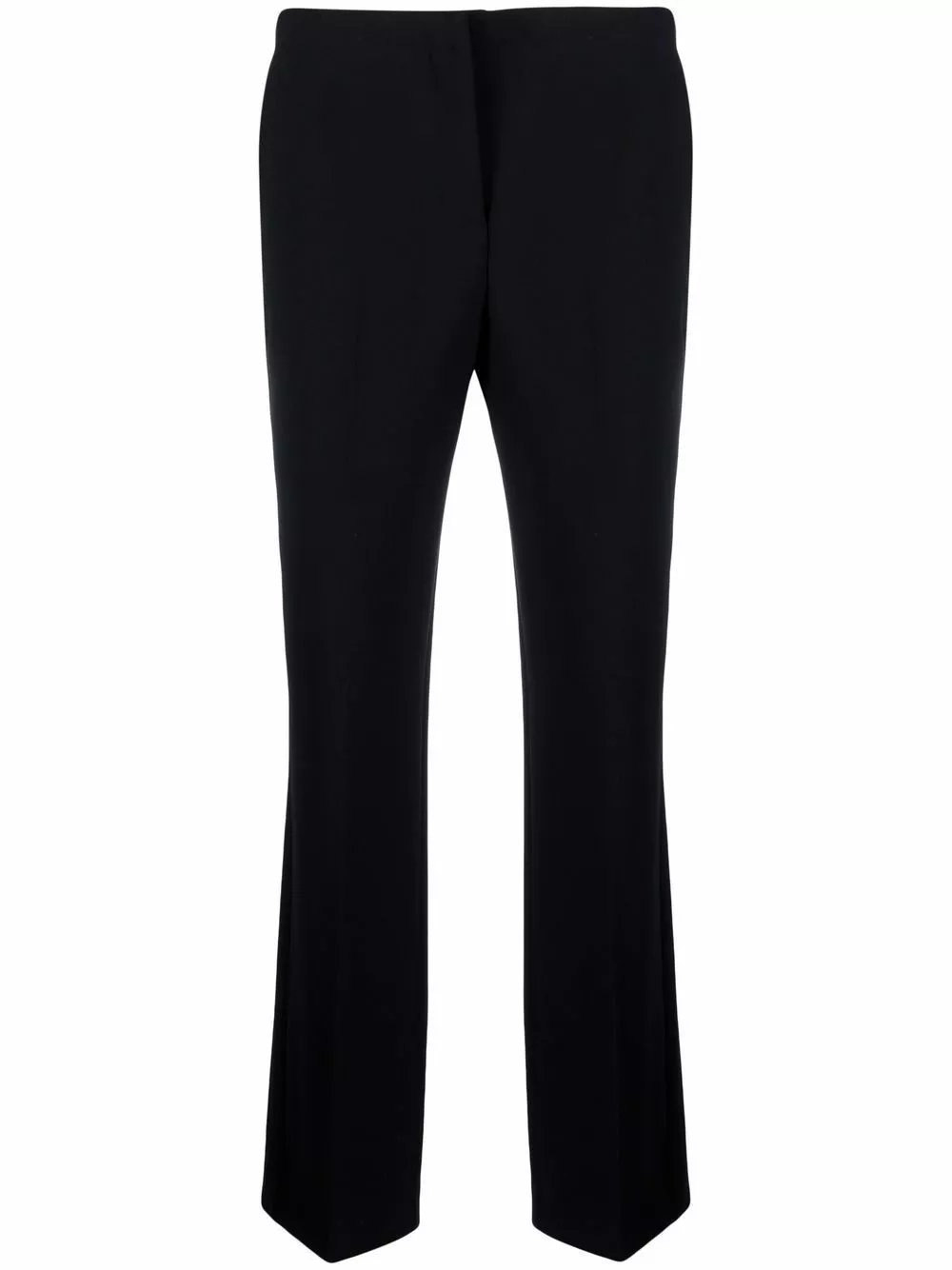 Black virgin wool mid-rise flared trousers from VERSACE featuring mid-rise, two side inset pockets and flared.