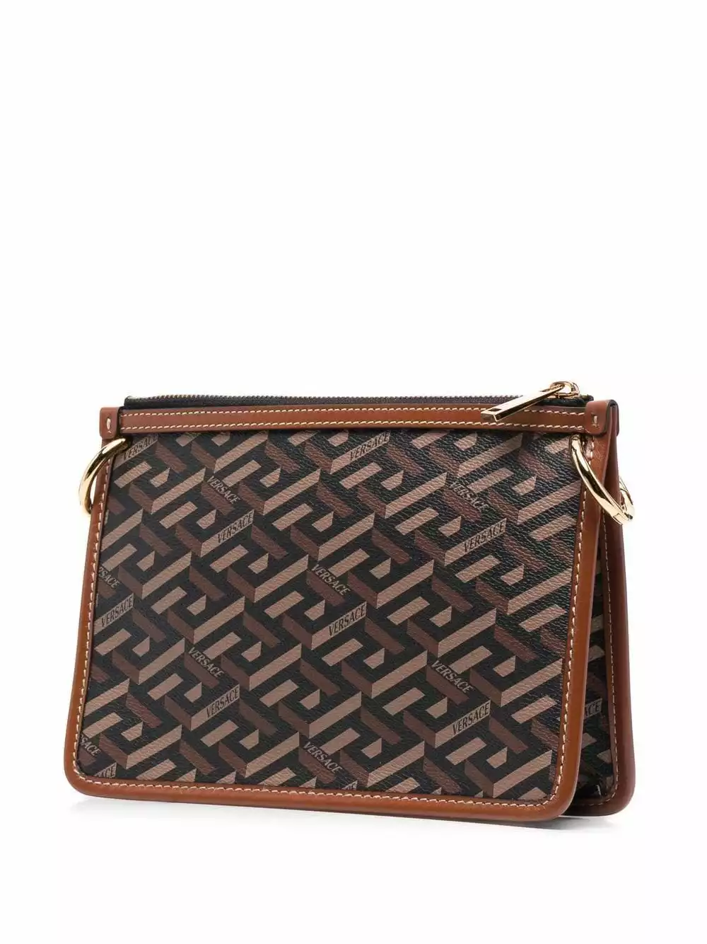 Brown leather monogram-print crossbody bag from VERSACE featuring monogram print, logo print to the front, adjustable shoulder strap, top zip fastening and internal logo patch.