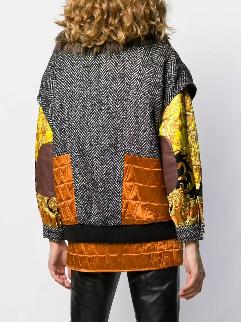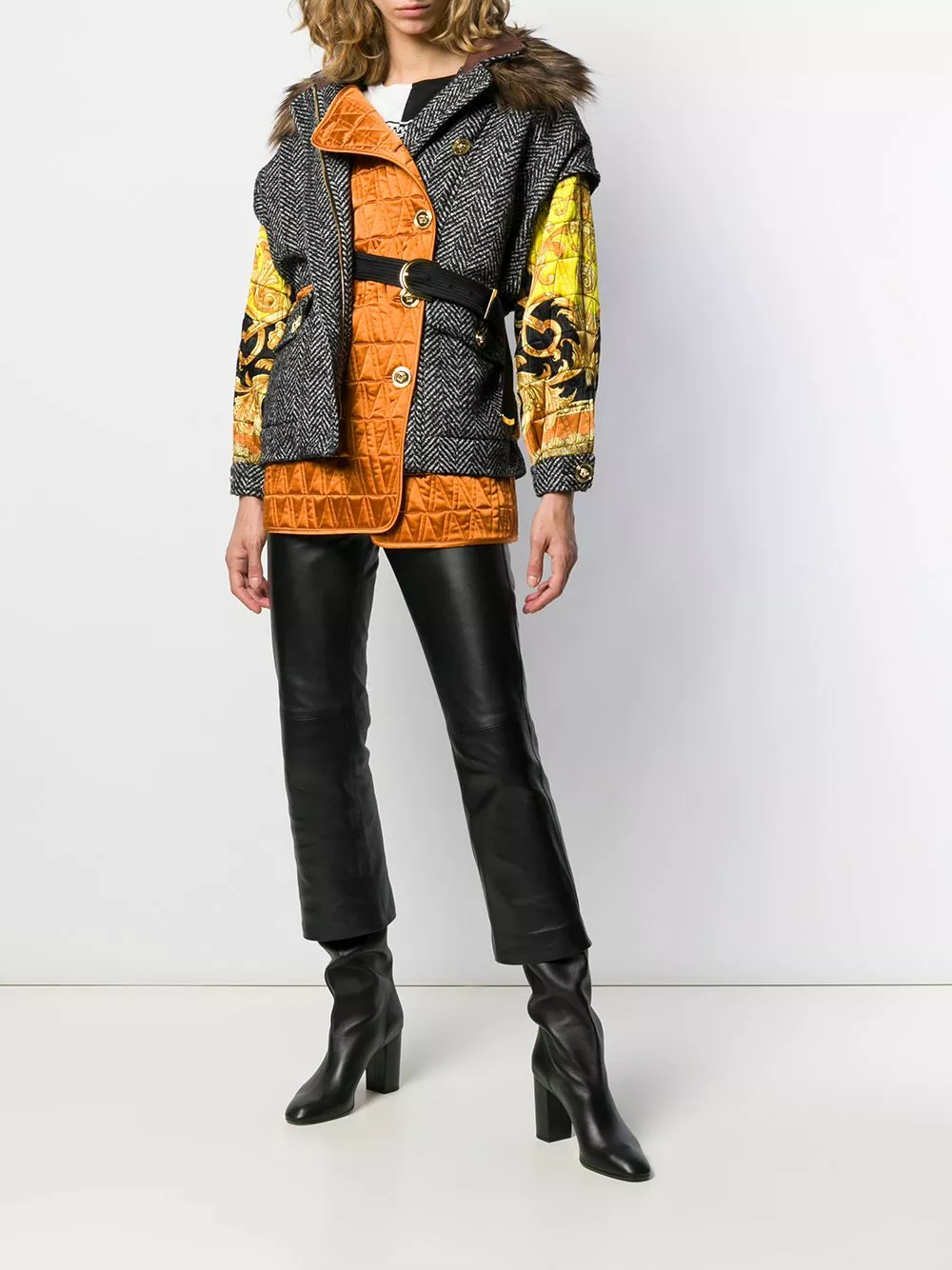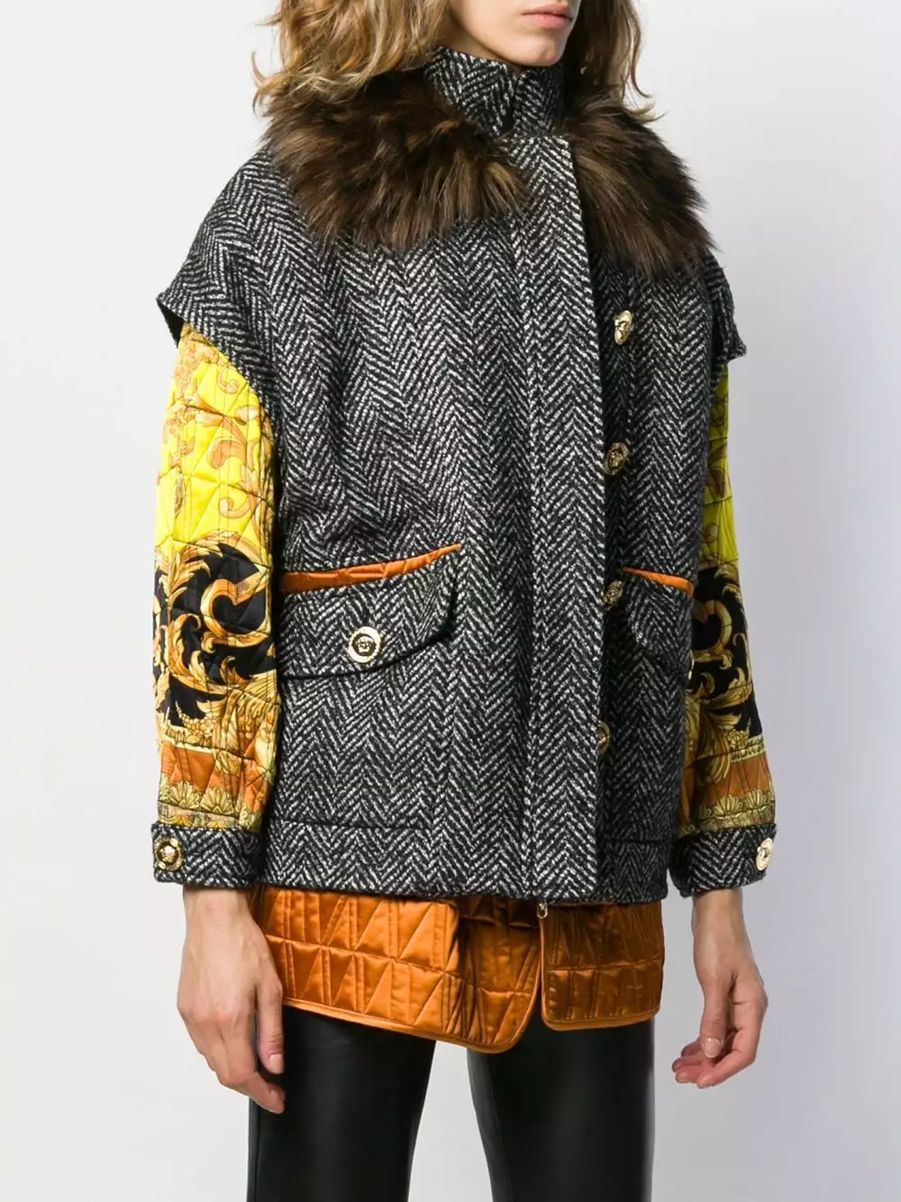 Versace knows how to make the cold weather worth the wait. Crafted in Italy, this multicoloured patchwork jacket adopts an oversized fit and mash-up design. Dare to be different. Featuring a patchwork design, a herringbone pattern, a faux fur collar, an off-centre front button fastening, a belted waist, long sleeves, a quilted effect, printed panels, front flap pockets and a short length.