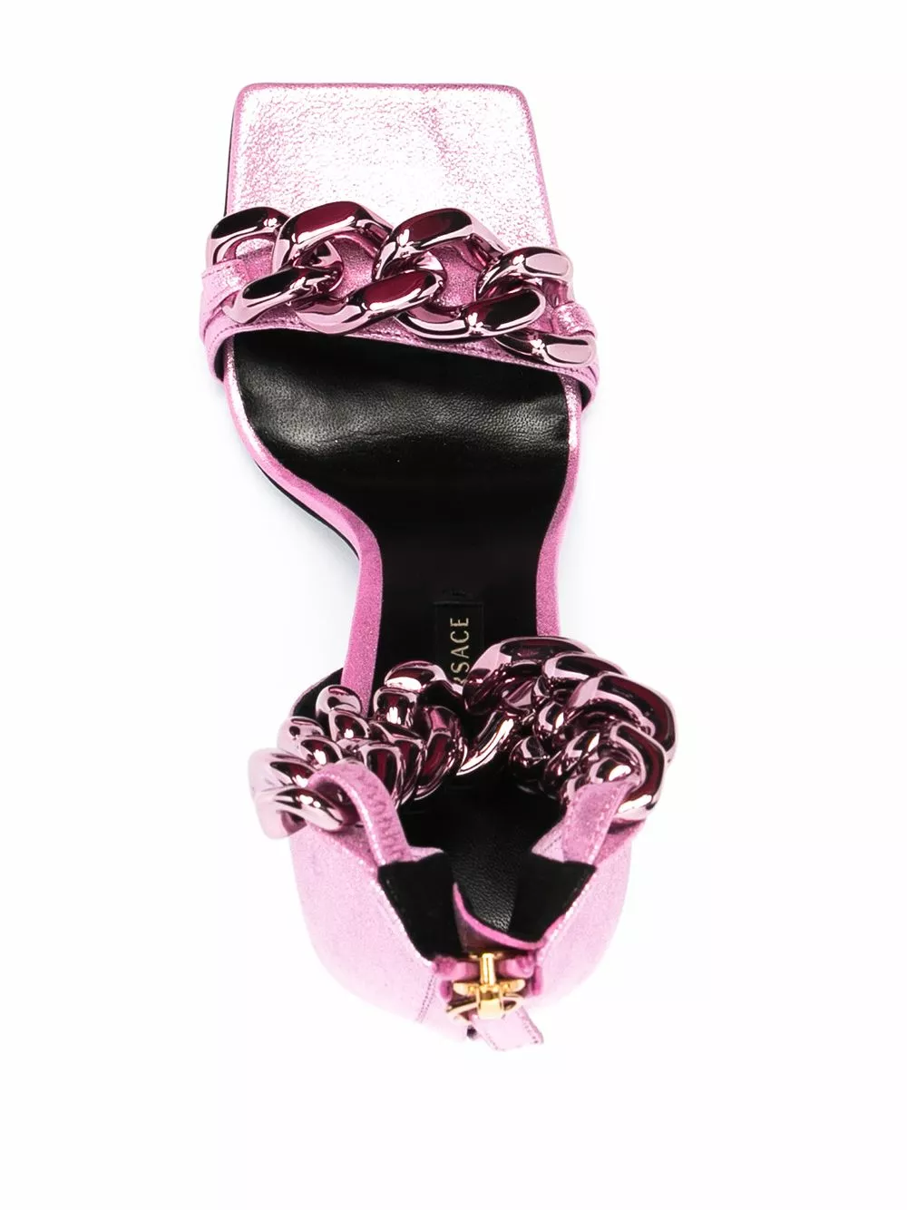 We’re tickled pink by these stunning pink chain-link square sandals from Versace. The metalised design brings a cutting-edge element to any ensemble.