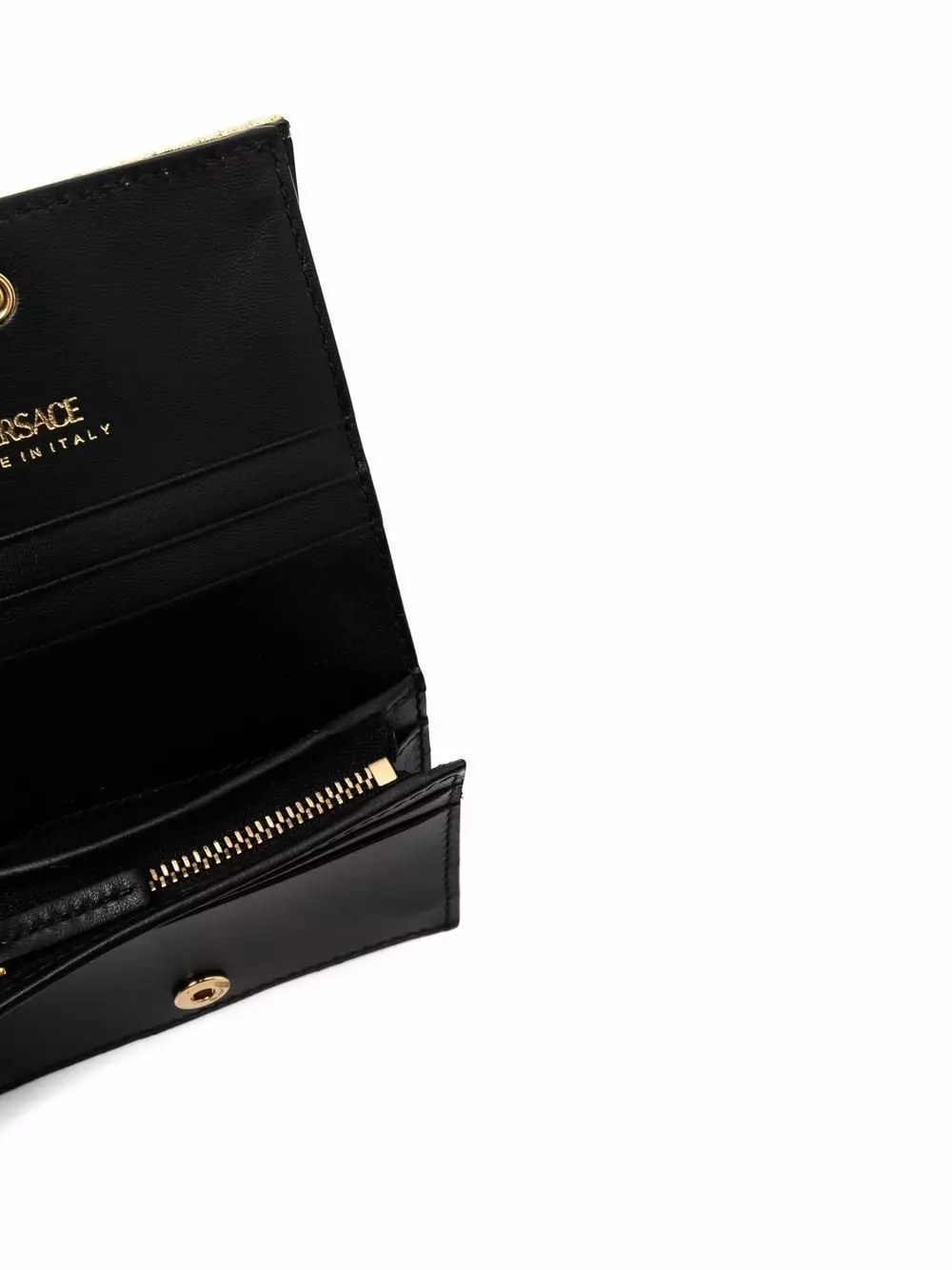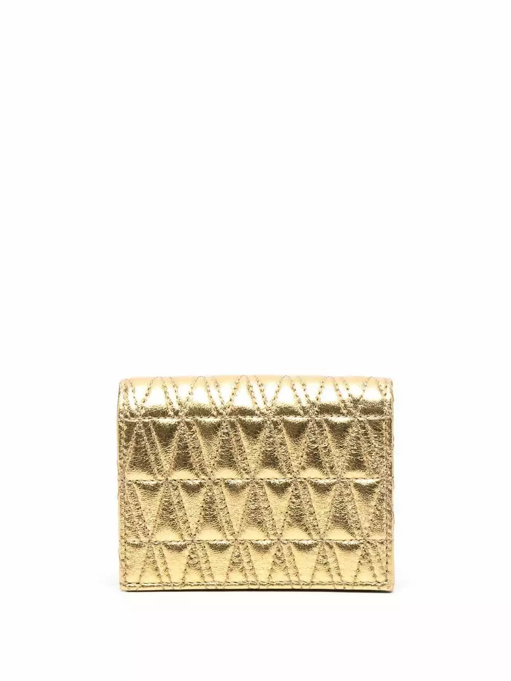 Made from gold-tone calf leather with a metallic finish, this wallet from Versace has a quilted logo facade. The front is punctuated with a gold-tone Virtus logo plaque.