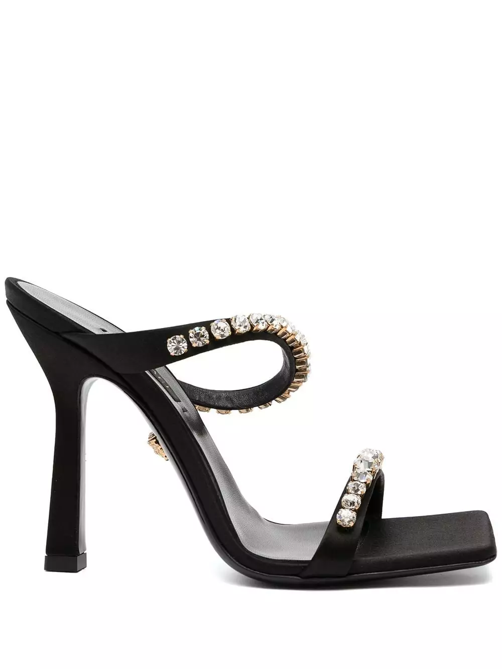 Versace’s mules will add a touch of sparkle to any outfit. Set on a high heel, this satin pair is adorned with a row of shimmering rhinestones on the two straps.