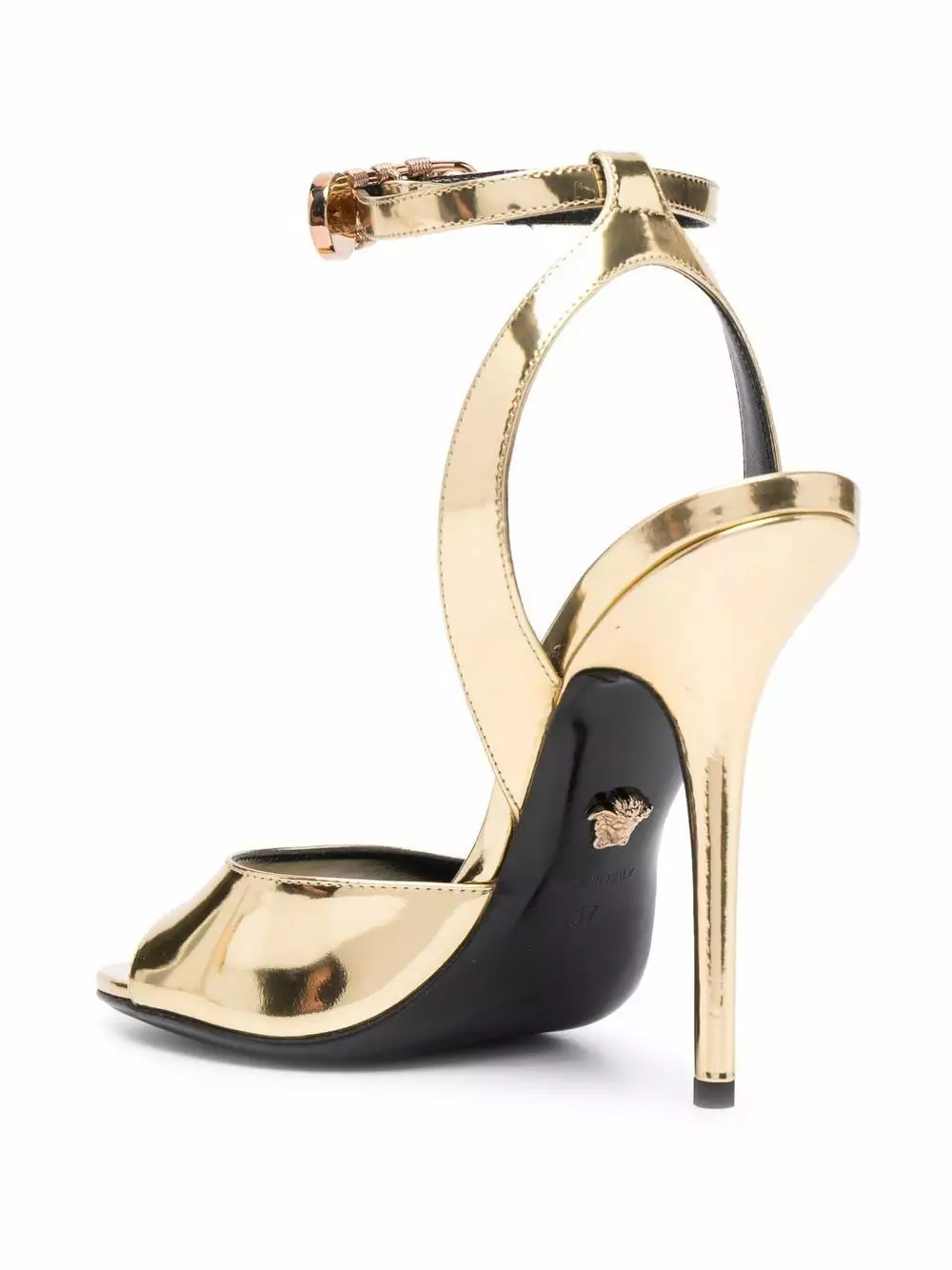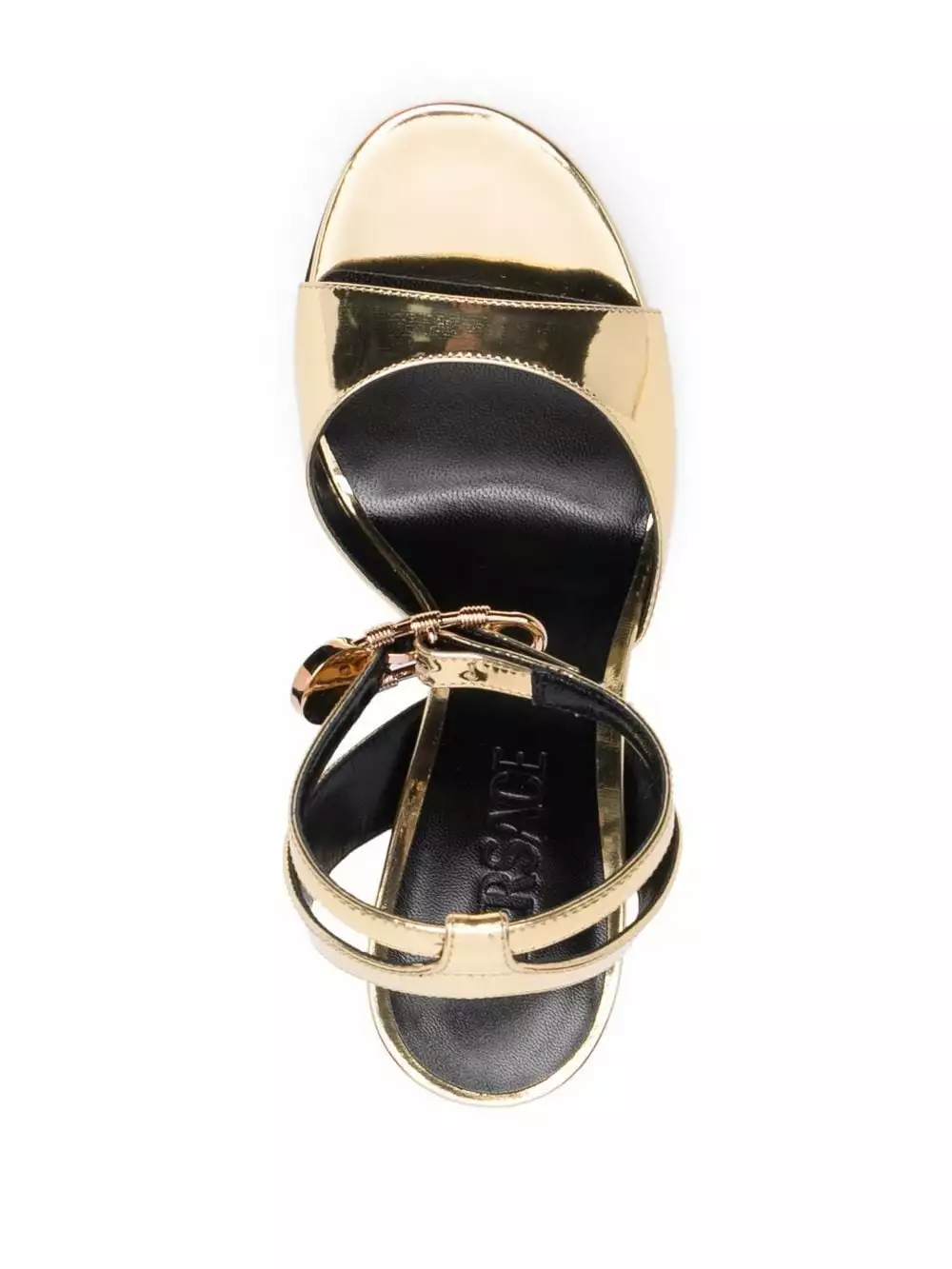 The safety pin brooch has become a signature Versace symbol, characterised by its unmistakable Medusa Head embellishment. Presented in a golden hue, it appears to the front of these pumps, adding an unmistakable look to their design.