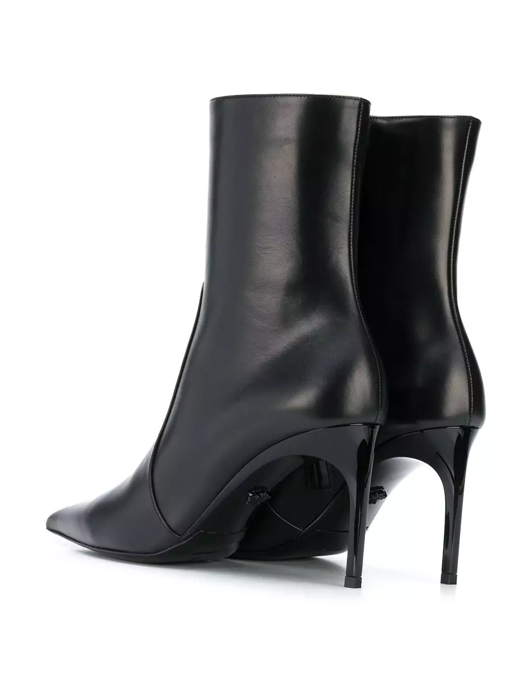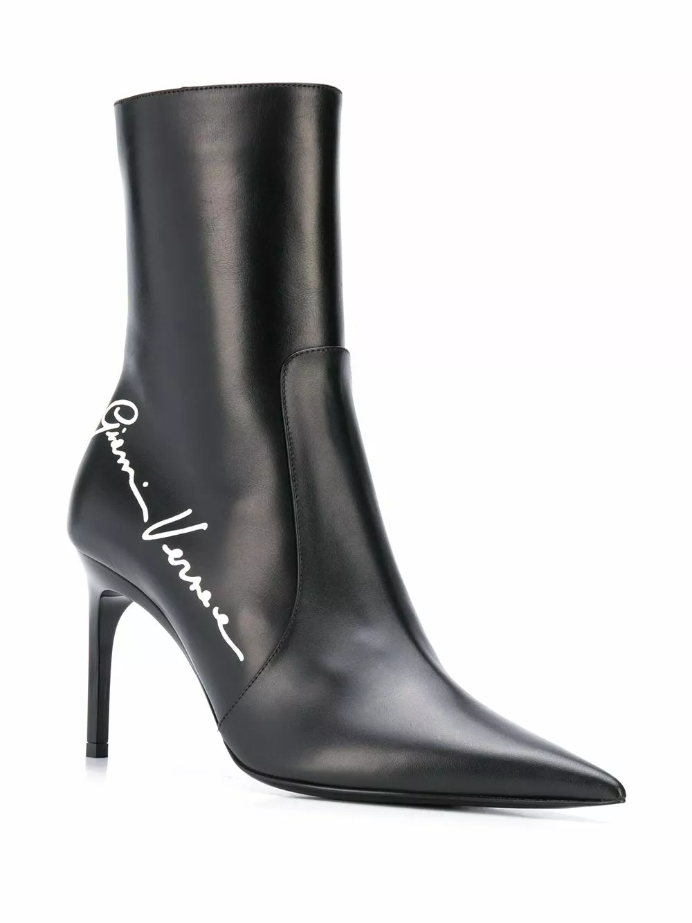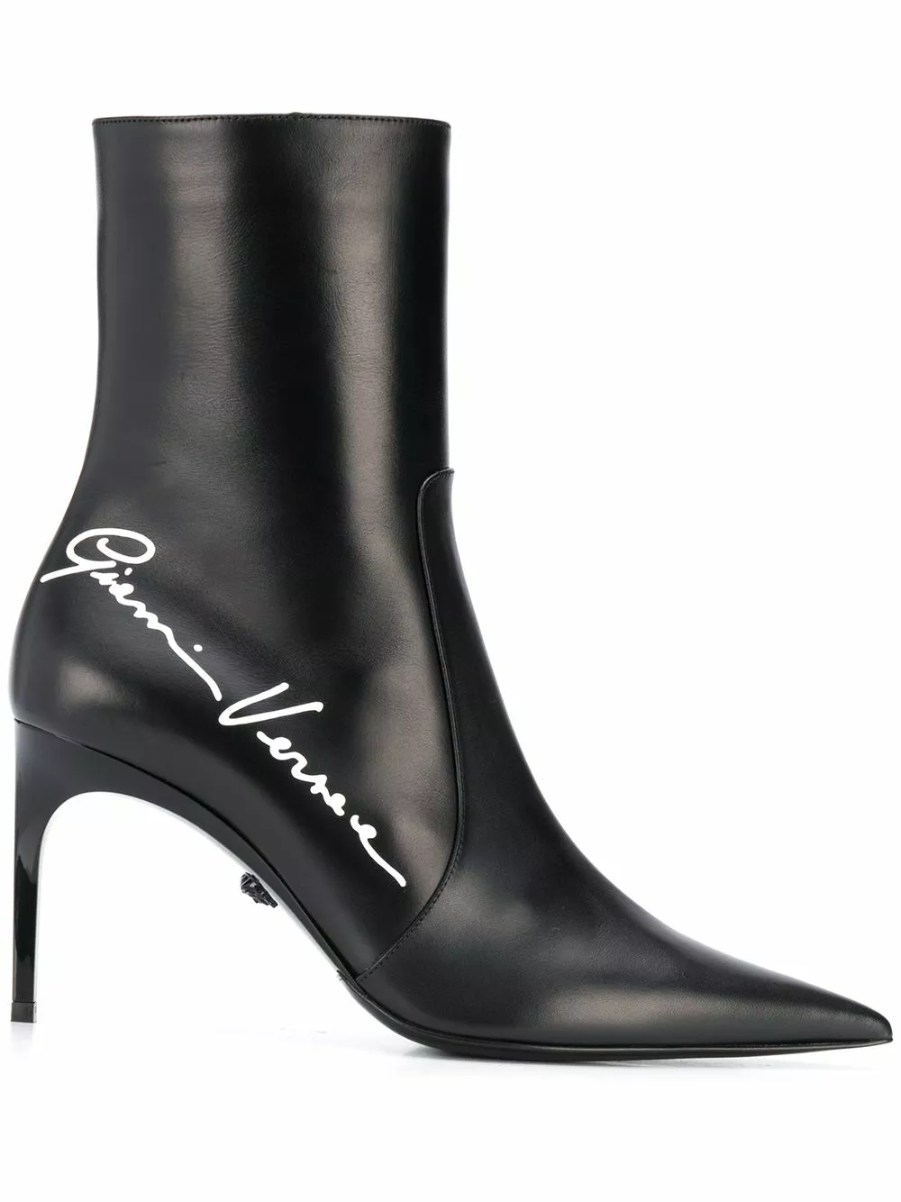 Pay homage to Versace’s founder. These black leather signature ankle boots from Versace sit atop a high stiletto heel. They’re a sure step up.