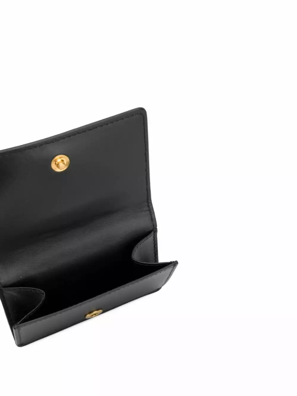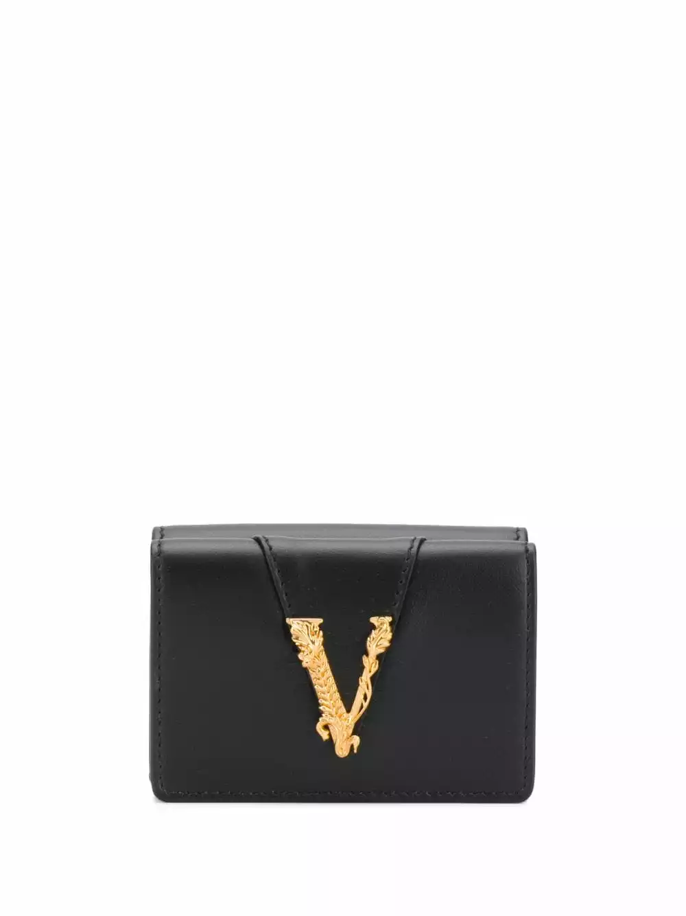 Carry your coins in style with this black leather small Virtus purse from Versace. Perfectly compact, it will provide a much needed home for any loose change. Where do we get ours? Featuring gold-tone hardware, a front flap closure, a press stud fastening, a back embossed logo stamp, a main internal compartment and signature Virtus logo plaque to front.