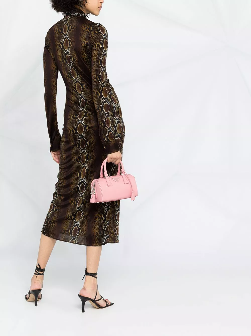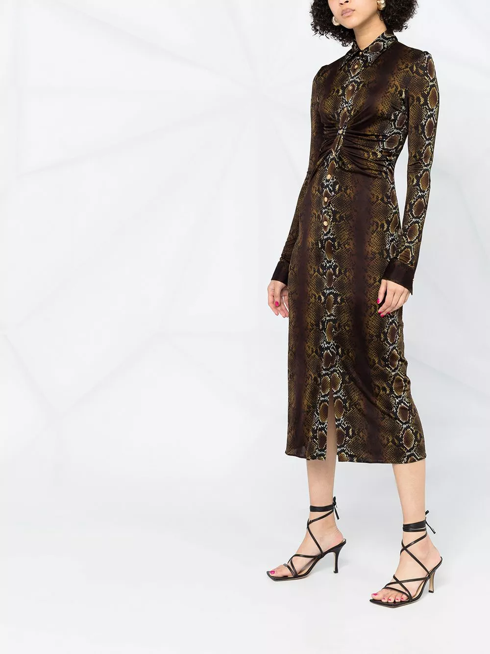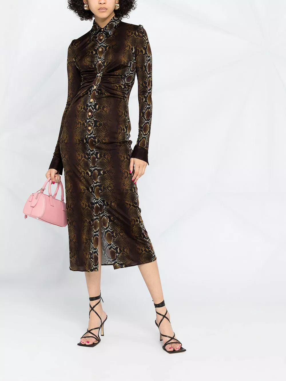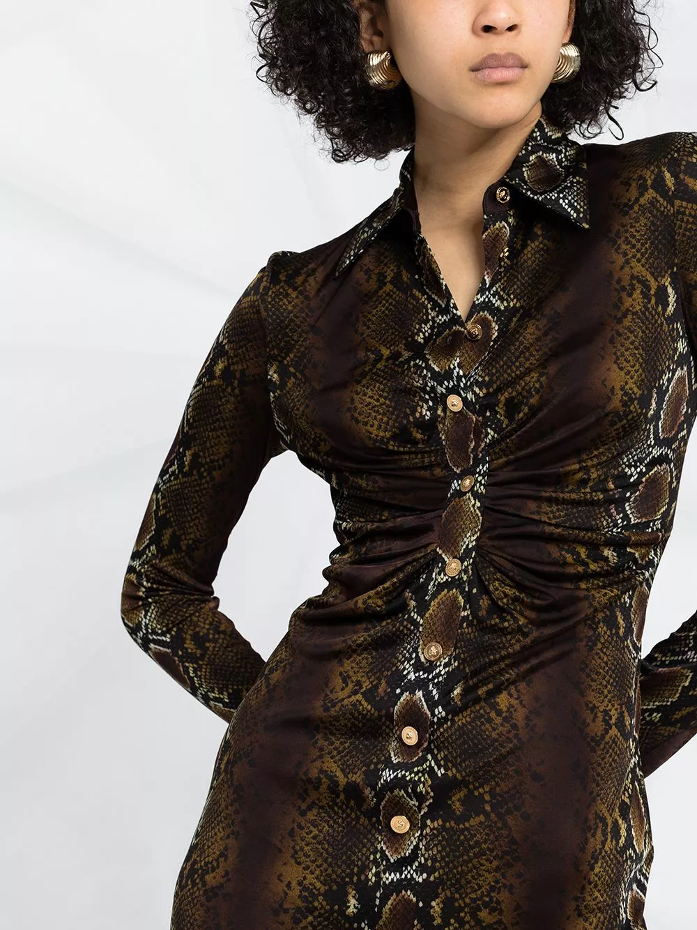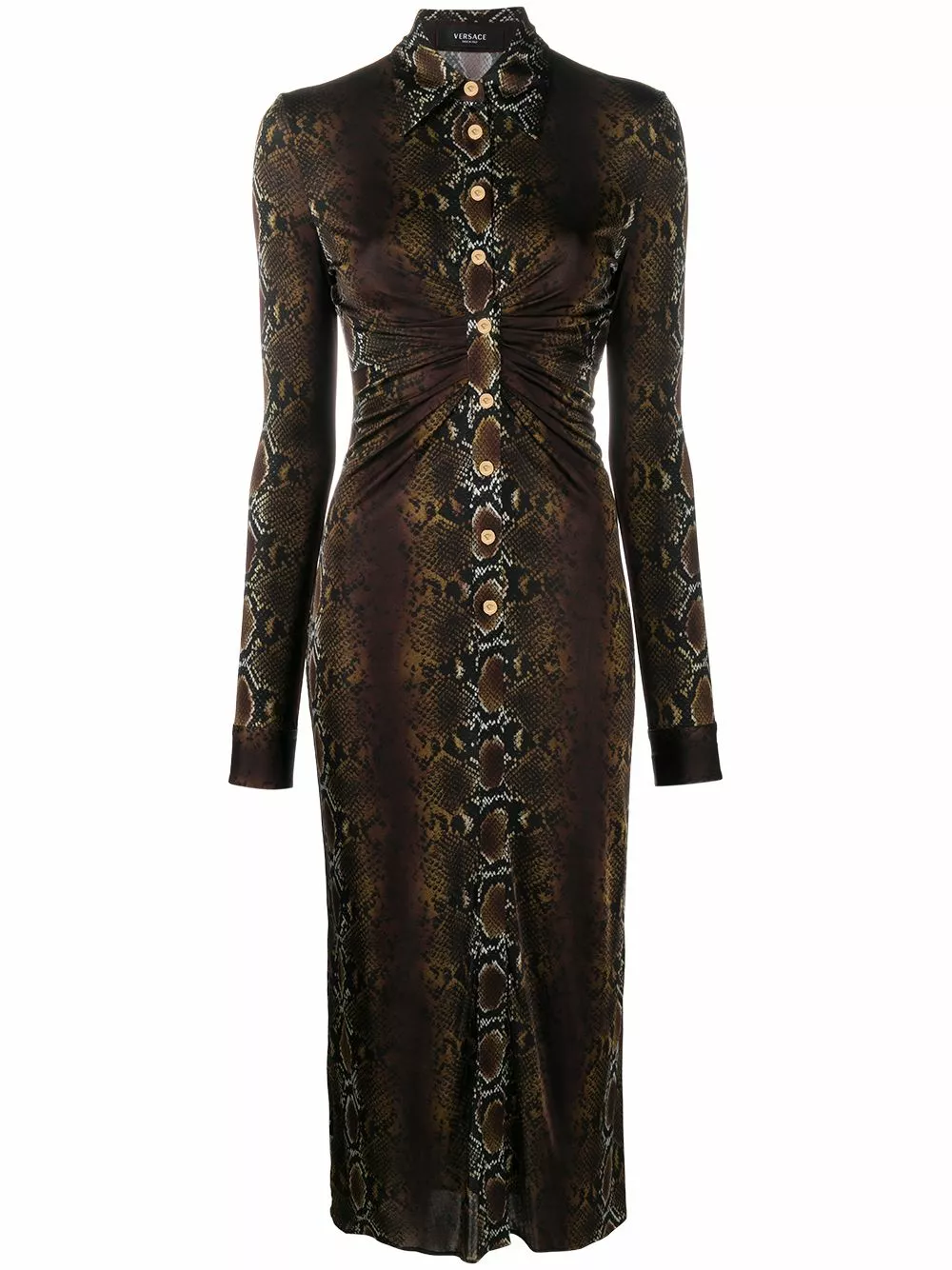 Take a walk on the wild side. Step out of your comfort zone by swapping your everyday monochrome looks for this snakeskin printed shirt dress by Versace. You won’t regret it.