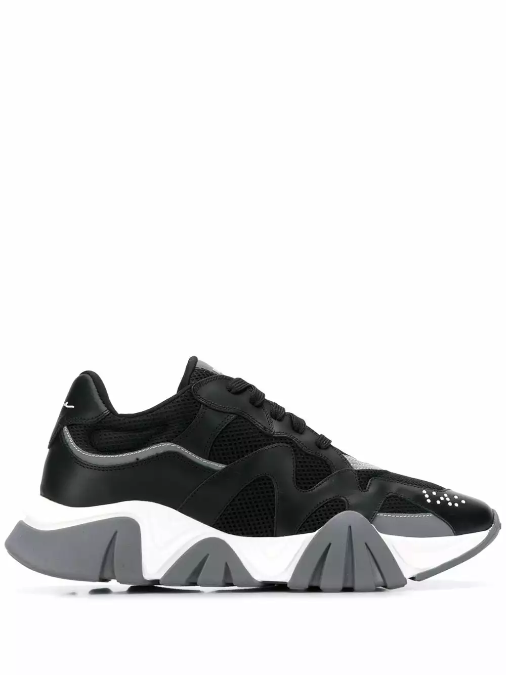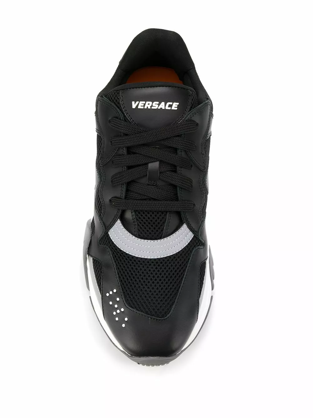 Versace goes beyond utilising the actual brand name to represent their rich Italian heritage and contemporary design ethos through instantly-recognisable house codes. These black, white and grey Squalo sneakers are crafted from leather and feature a round toe, a lace-up front fastening, a logo patch at the tongue, mesh panels, branded heel counter and an oversized rubber sole.