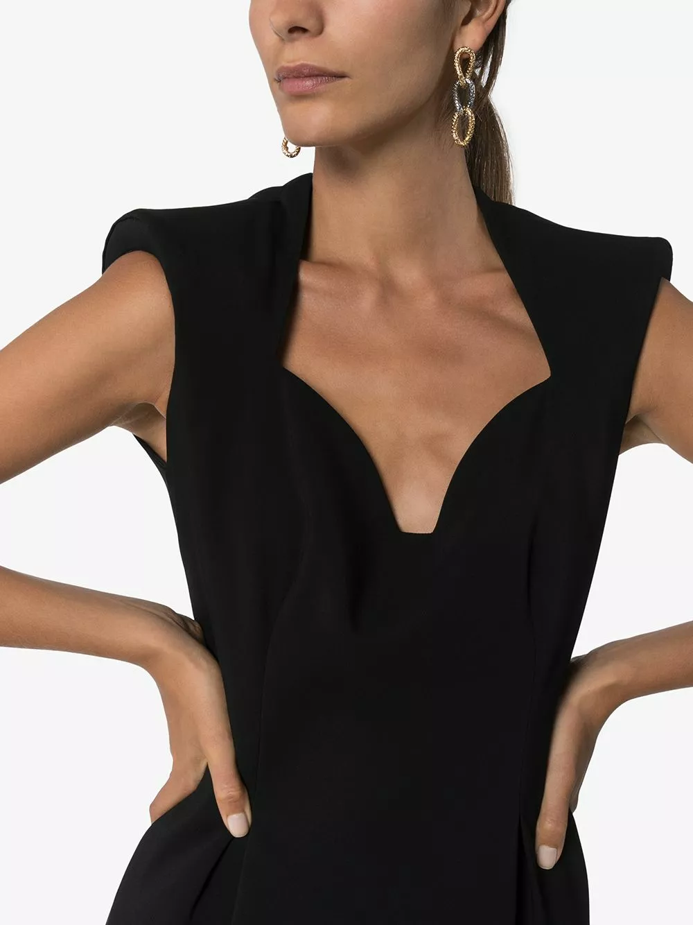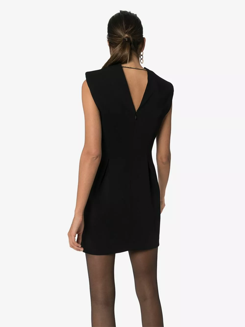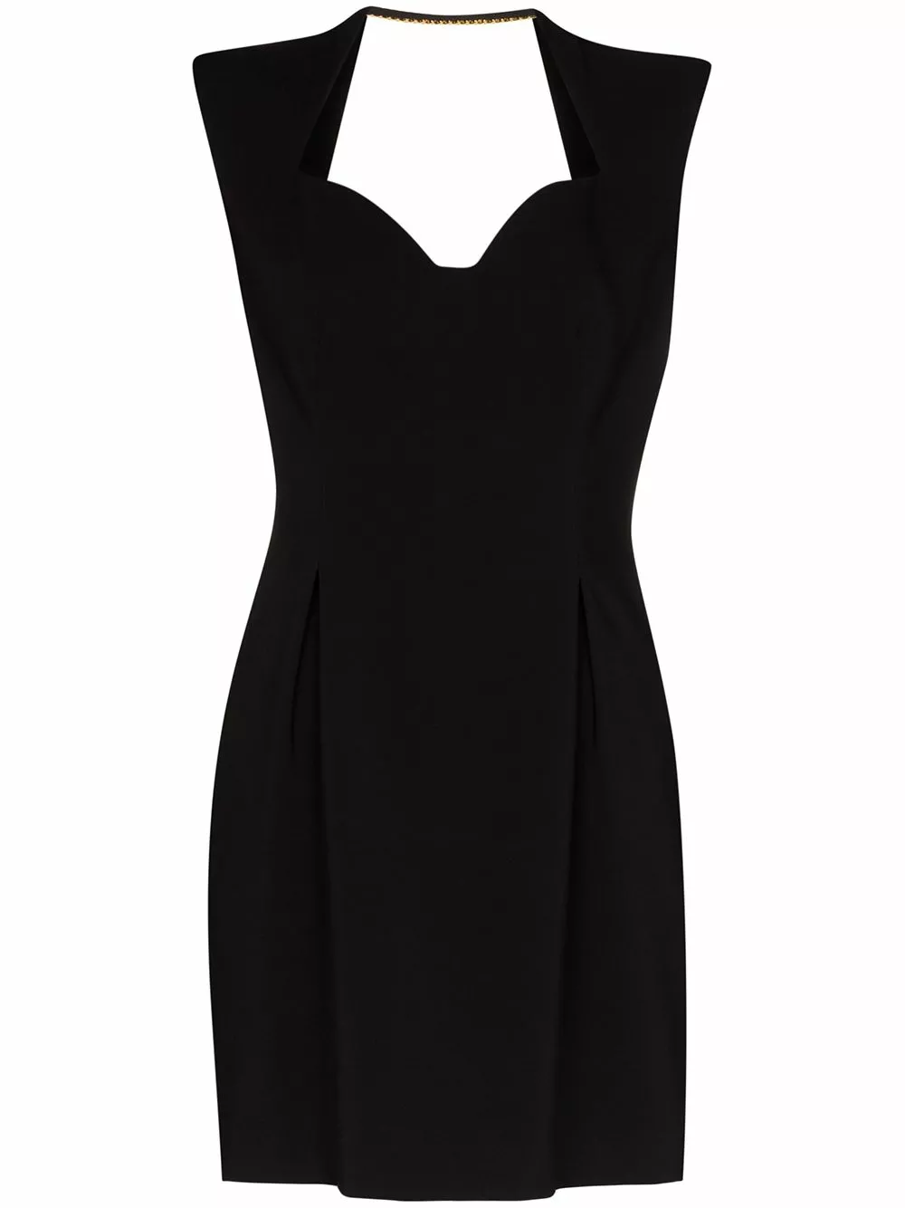 When has an LBD ever let you down? No matter the elegant affair this black silk-blend sweetheart neckline mini dress from Versace has a fitted silhouette that hugs the body with a fitted silhouette. Sometimes simple looks do work best. Featuring a fitted silhouette, a v-back, a back zip fastening, a fitted silhouette, micro pleated details, a straight hem, a sleeveless design, a back zip fastening and crystal strap detail.