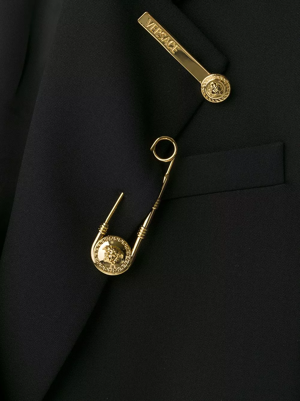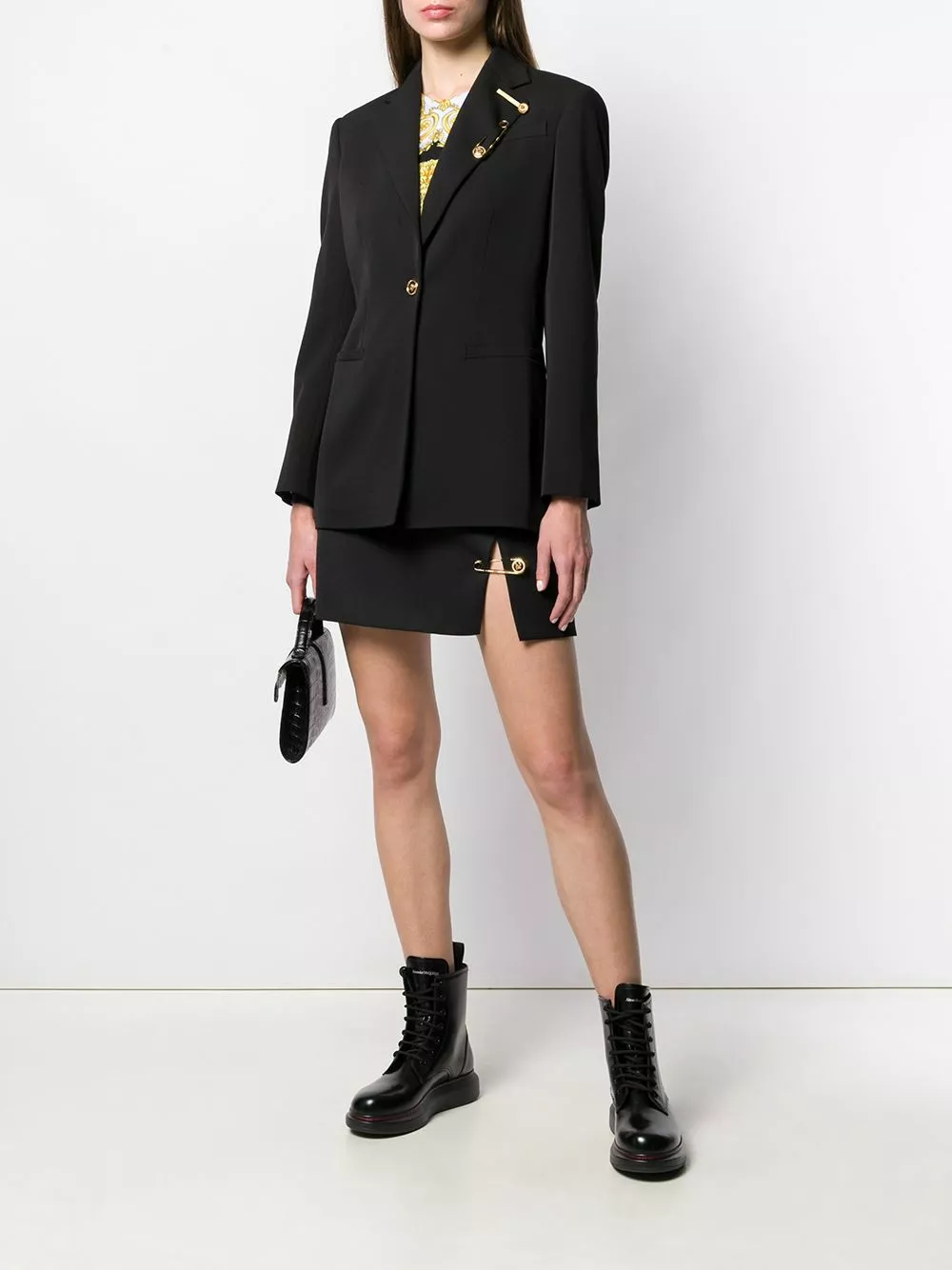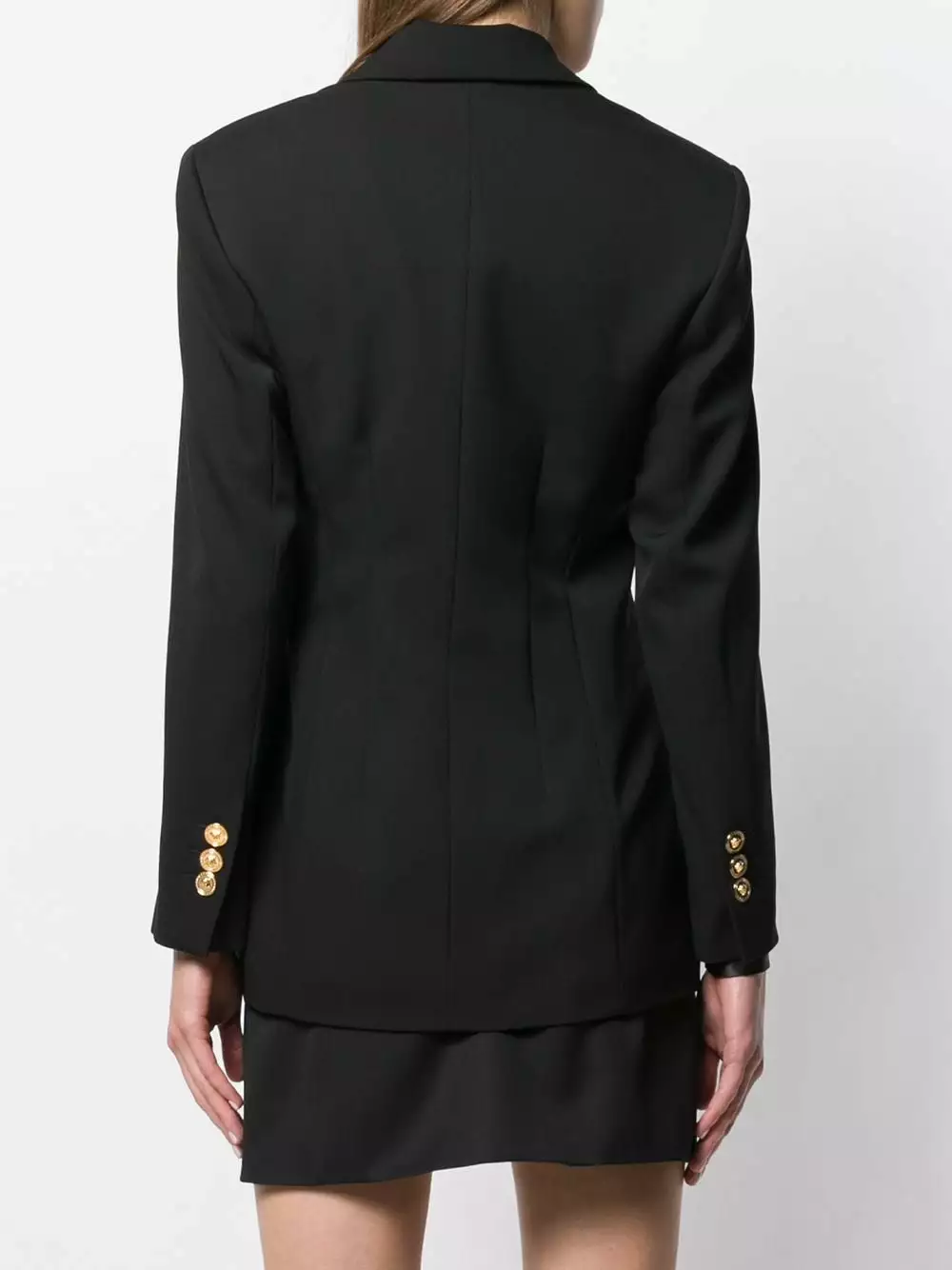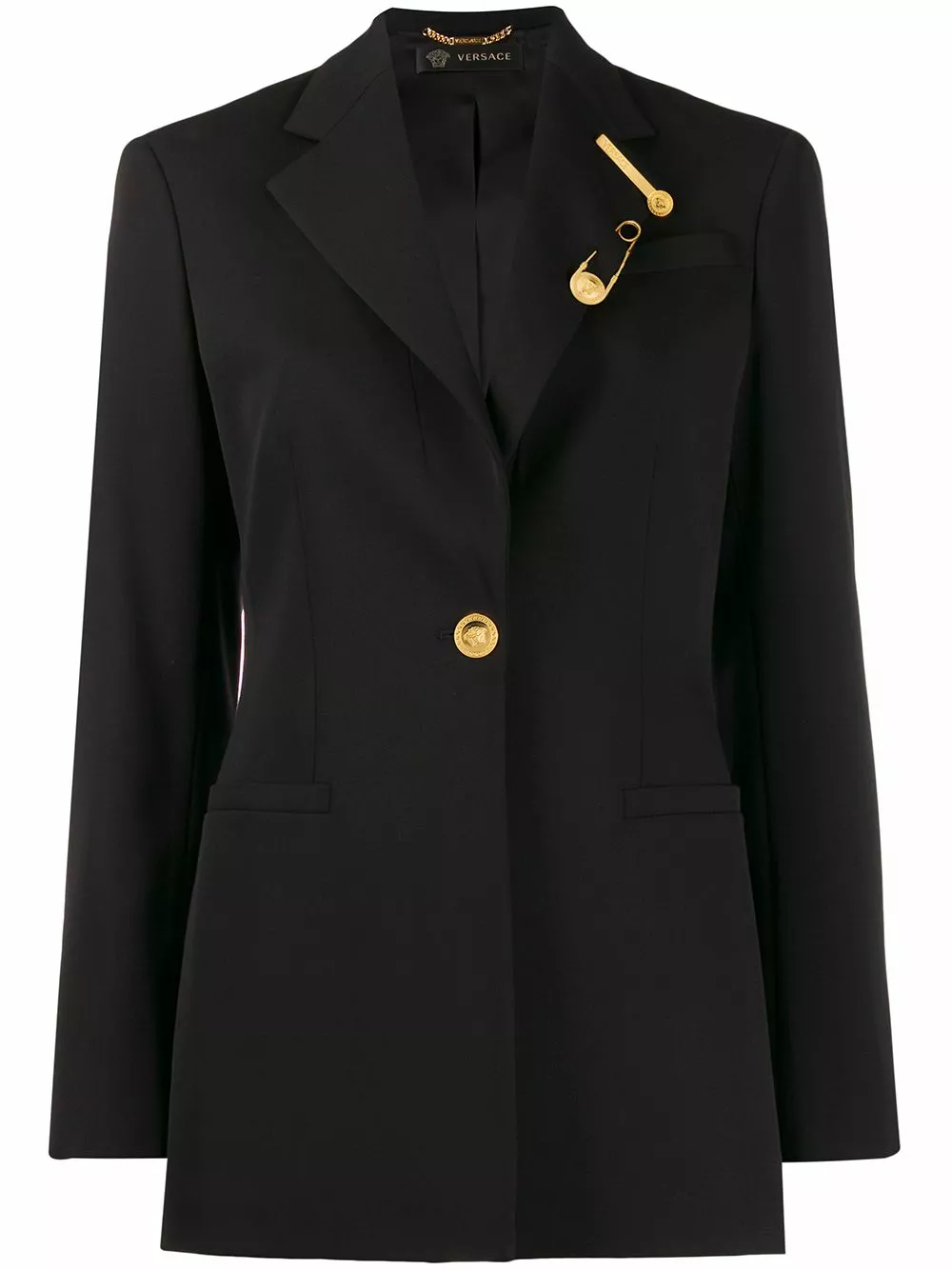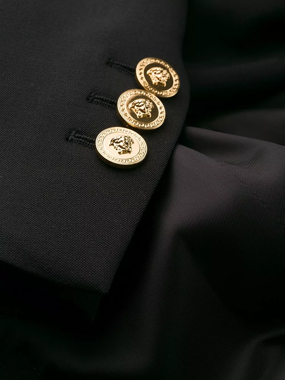 Keep your business-wear on top with this black tailored long-length blazer from Versace. Designed with gold-tone details, this piece will make you stand out anytime. Now, go. The big project is (already) yours! Featuring notched lapels, a front button fastening, long sleeves, front pockets and gold-tone hardware.