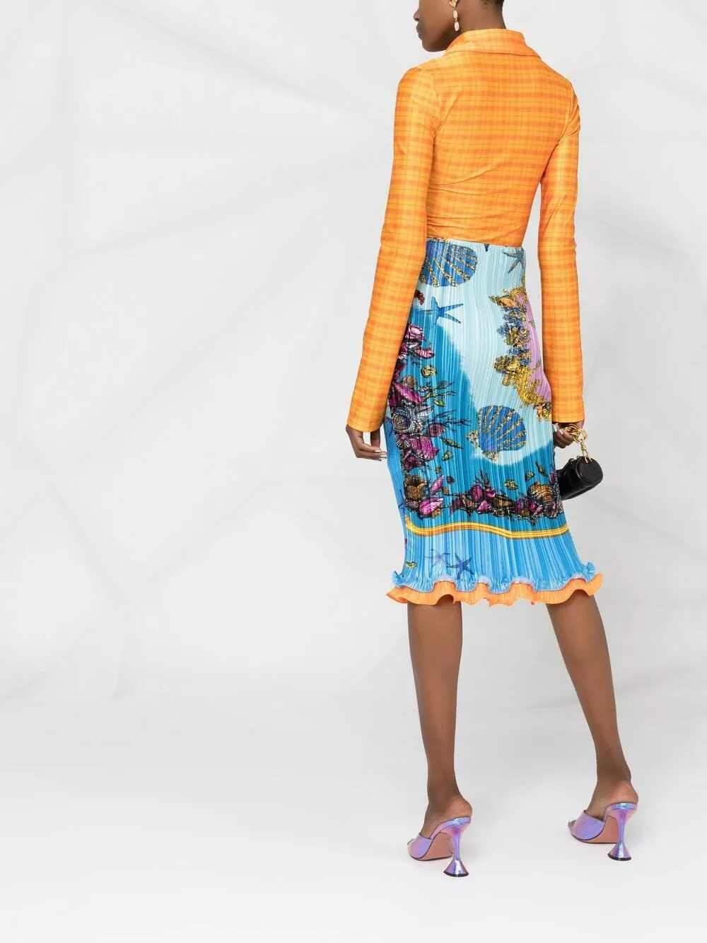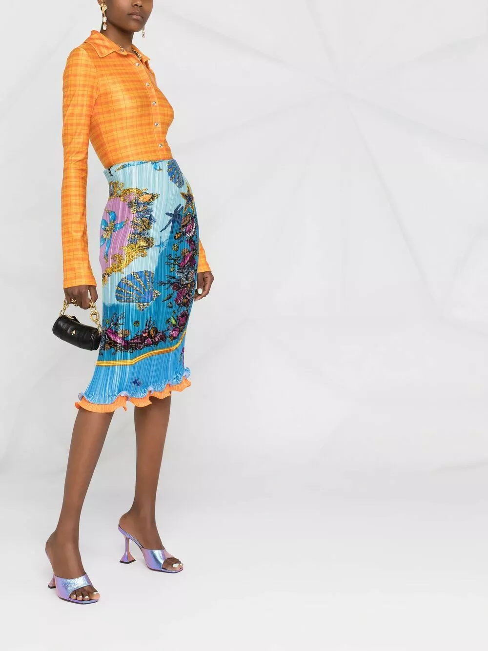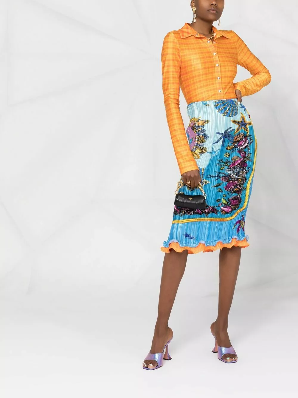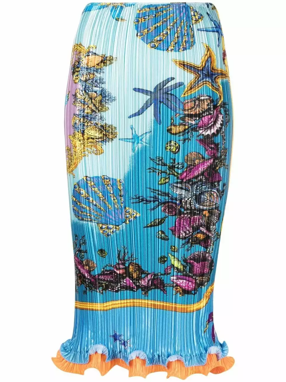 Celebrate your love of all things fashion and fauna. Versace’s Trésor de la Mer print, which champions nature decorates the exterior of this tightly pleated skirt. With a ruffle trim, it’s ideal to wear everywhere.