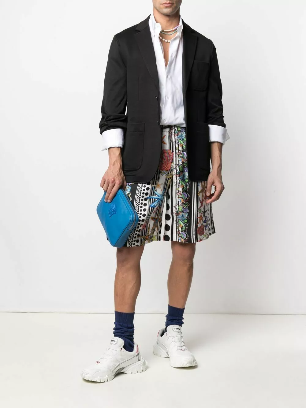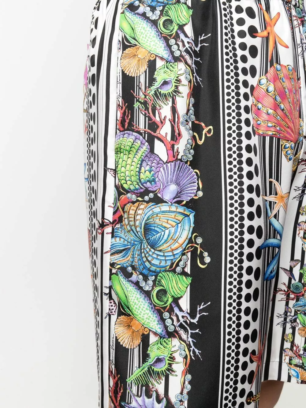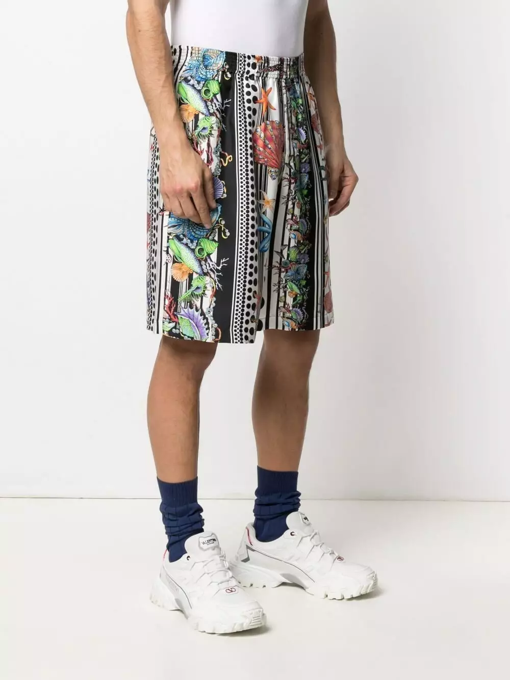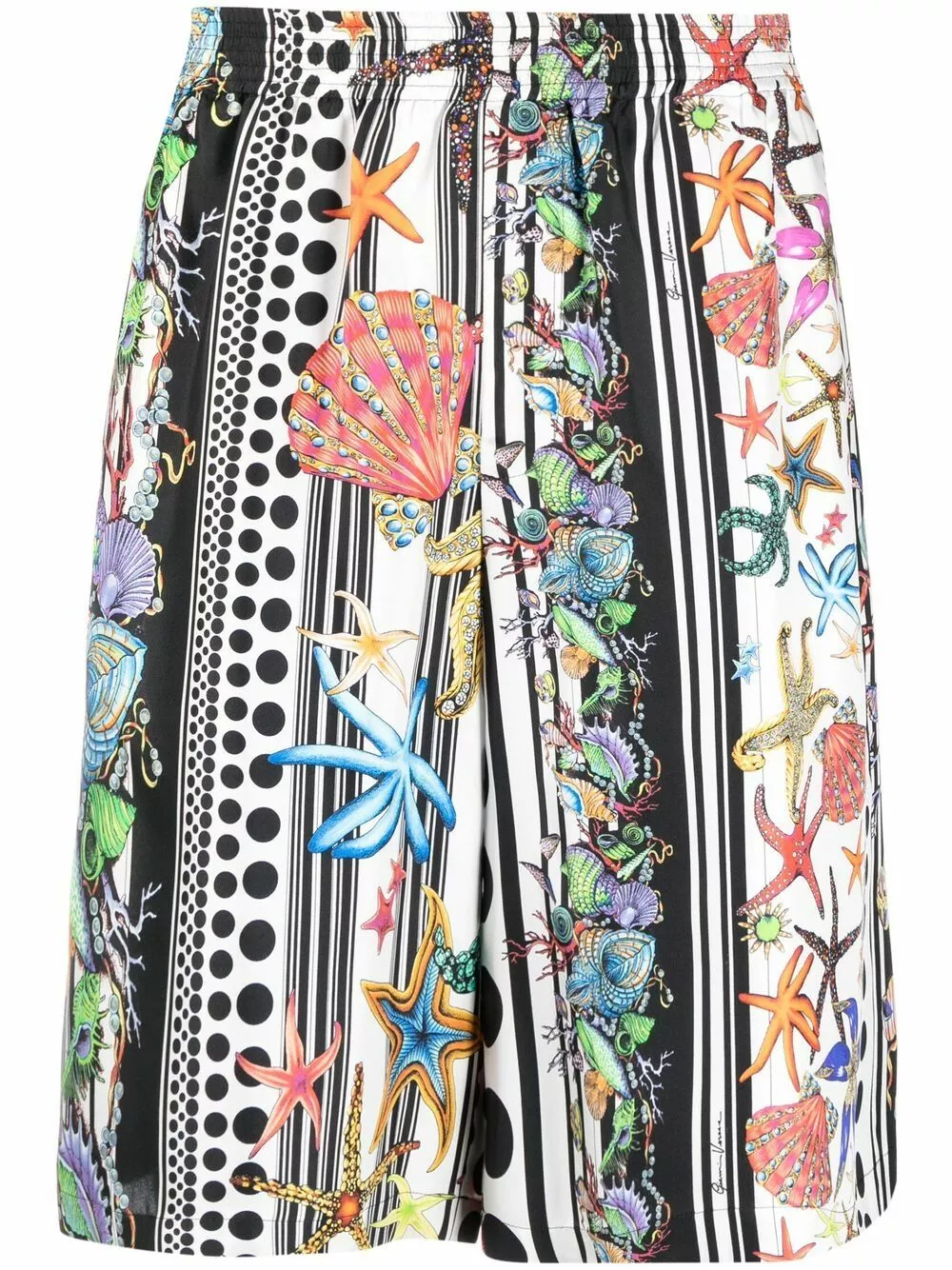 Versace’s signature Trésor de la Mer print is a re-working of archival designs that celebrates aquatic life and the mythical world of Versacepolis. It is decorated across these Italian-crafted shorts in direct contrast to the silhouette’s graphic pinstripe print.