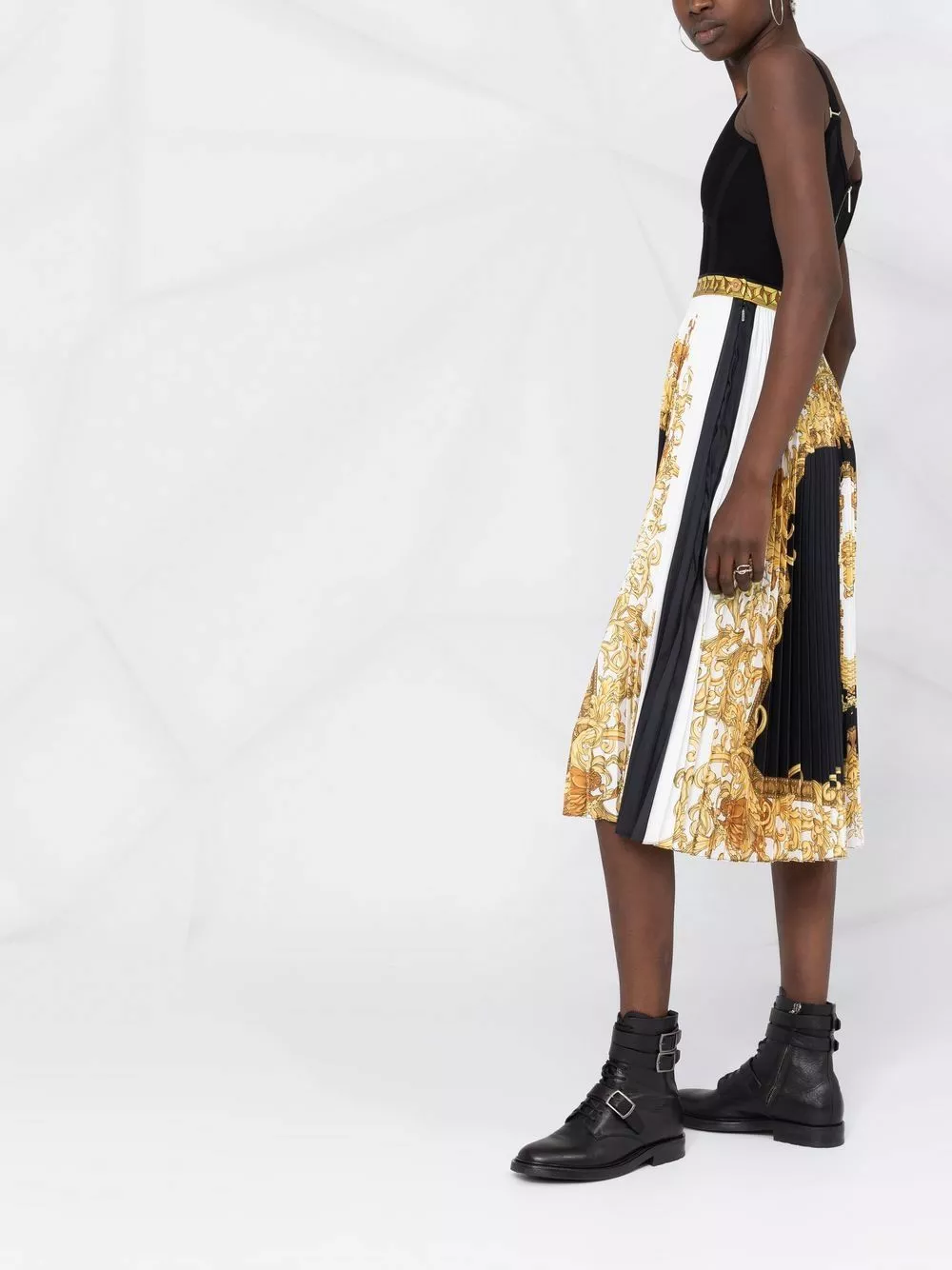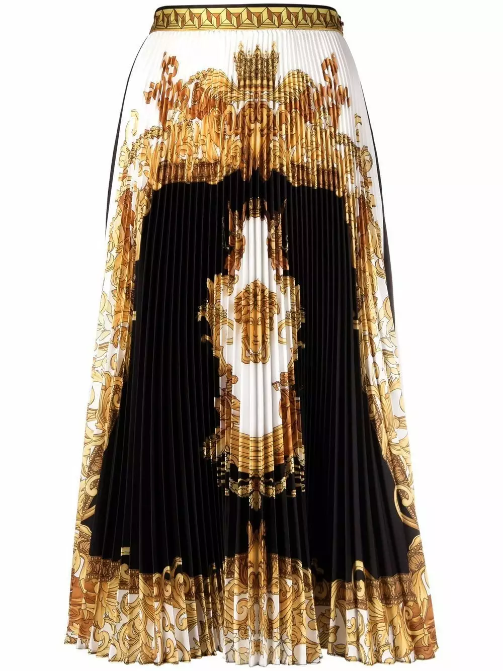 Versace’s skirt is a testament to the Italian brand’s maximalist sensibility. It’s emblazoned with a trompe l’oleil print depicting its signature Medusa head motif peeking through an ornate frame.