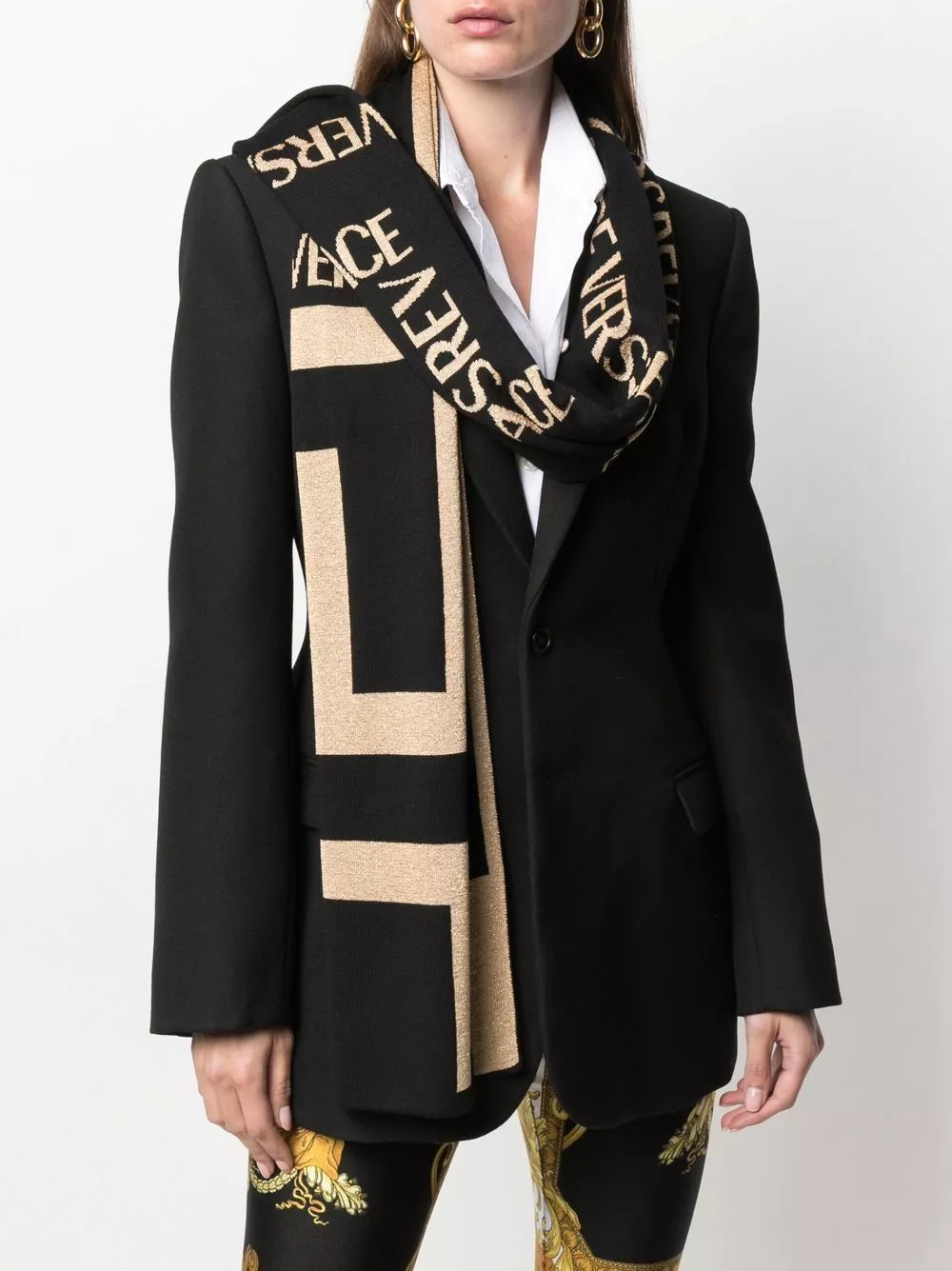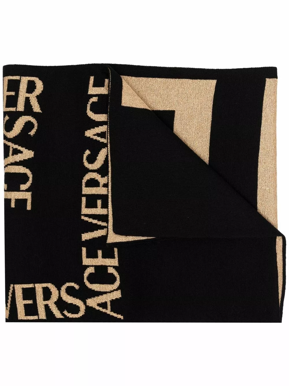 Featuring Versace’s signature Greca pattern in an intarsia-knit iteration, this two-tone scarf becomes a bold design. Unafraid to mix materials, this striking element is made prominant with the use of metallic gold thread throughout.