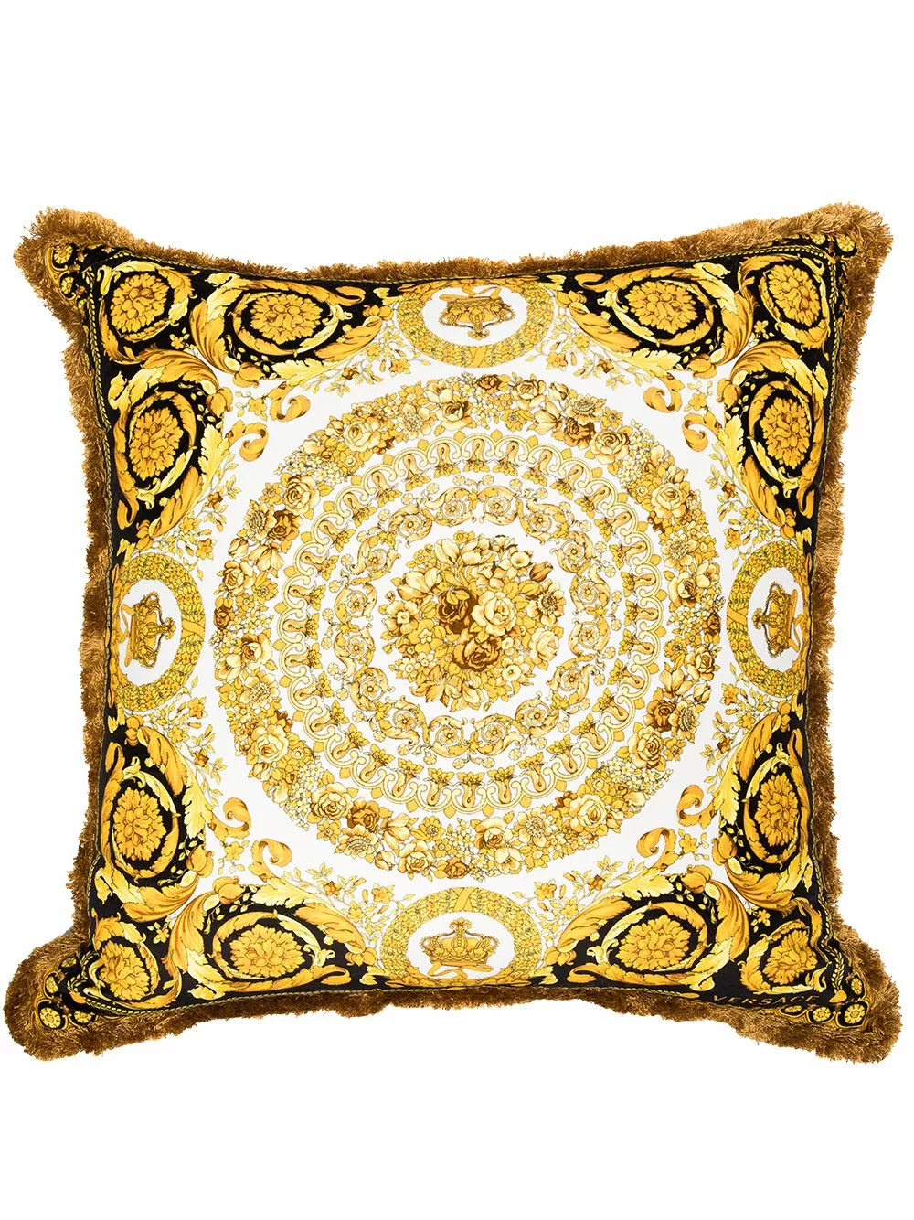 Versace heightens the sumptuous feel of this black cushion by framing it with frayed edges in the house’s signature golden hue. Italian-crafted from cotton, it’s printed with the iconic Baroque print on one side and with Medusa motifs on the reverse.