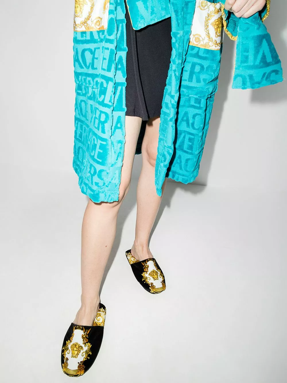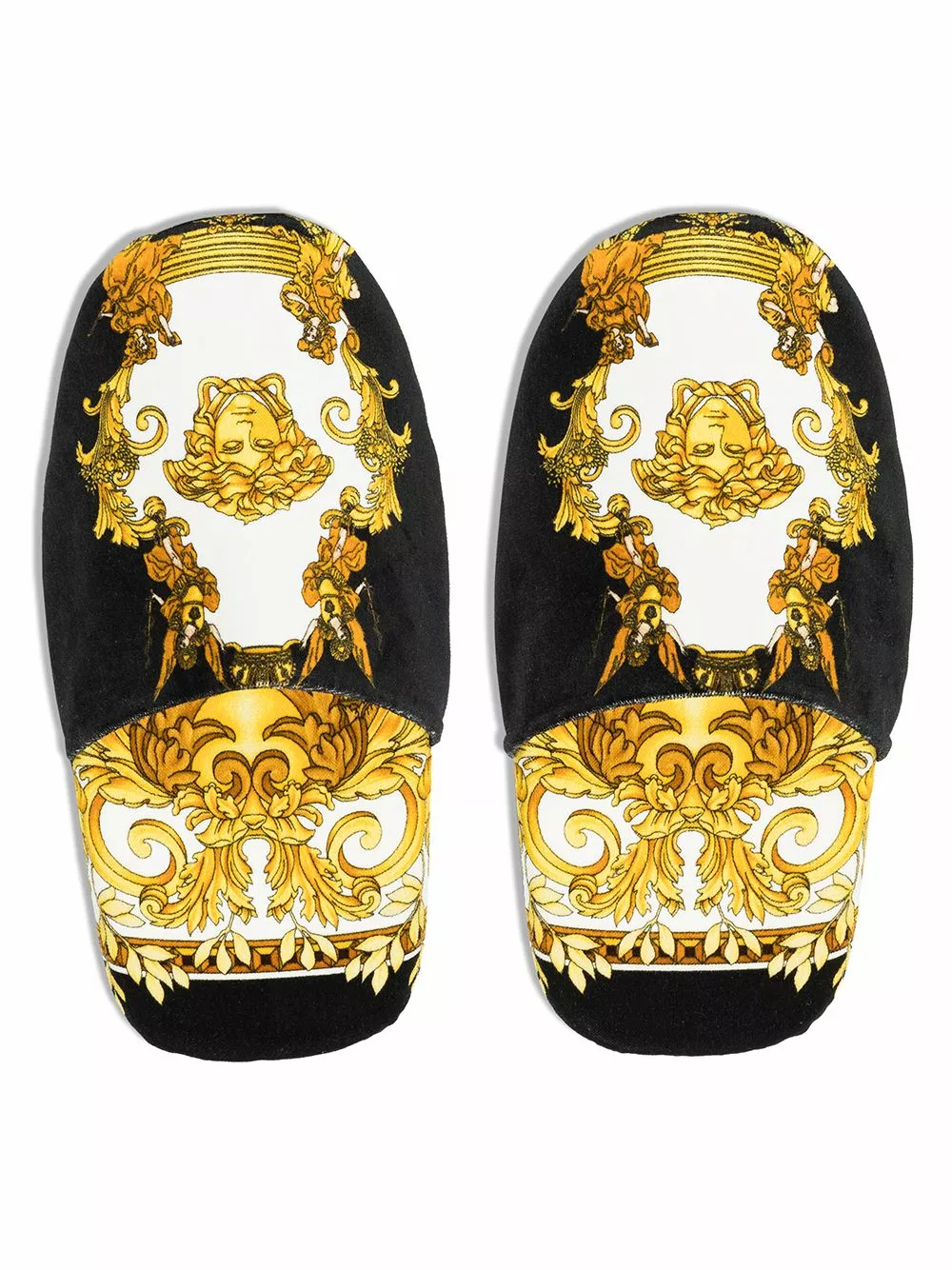 Versace’s slippers align with the brand’s ornate aesthetic. This black velvet iteration is decorated with the brand’s signature Barocco motif.