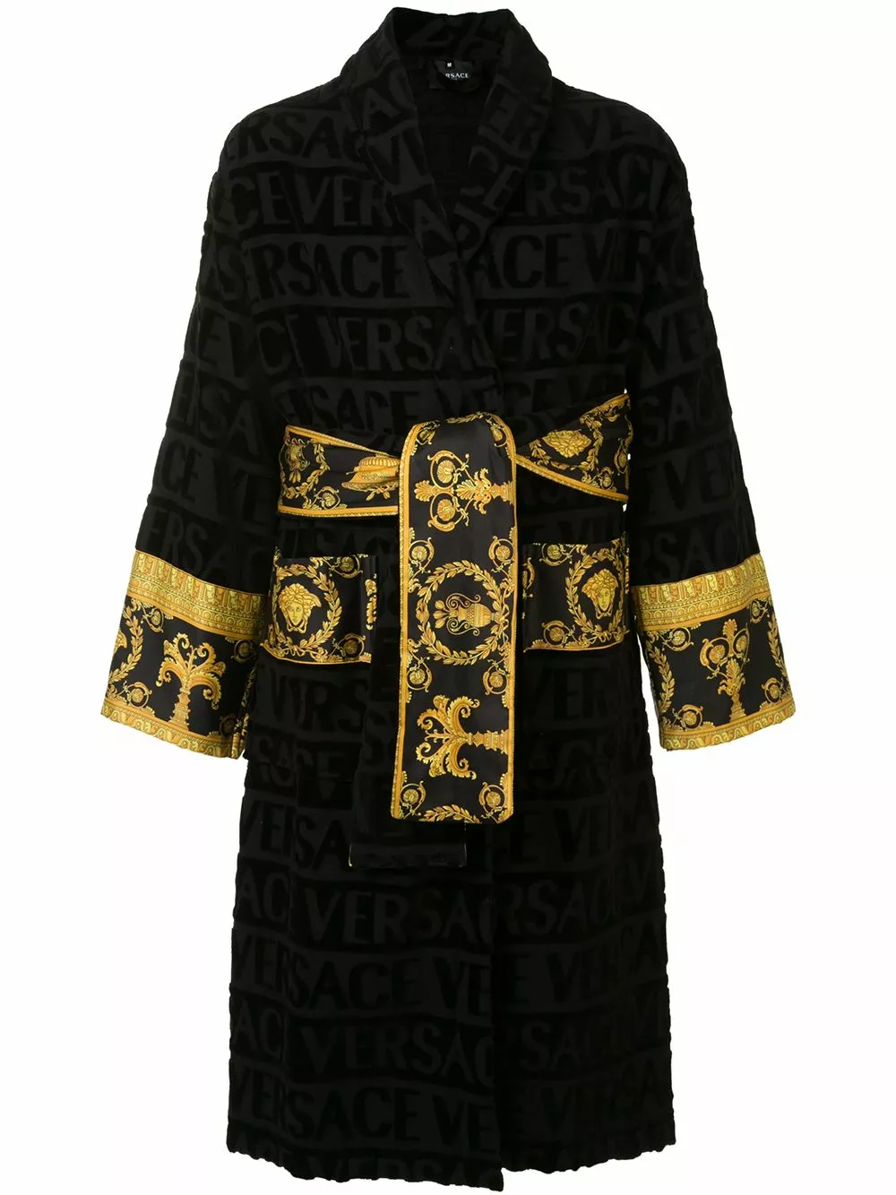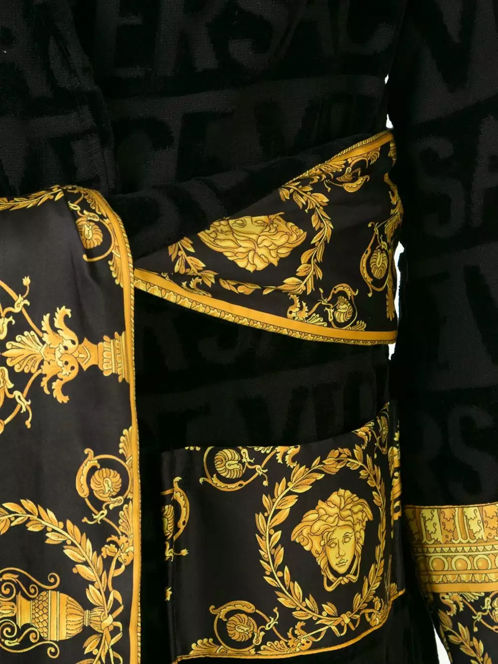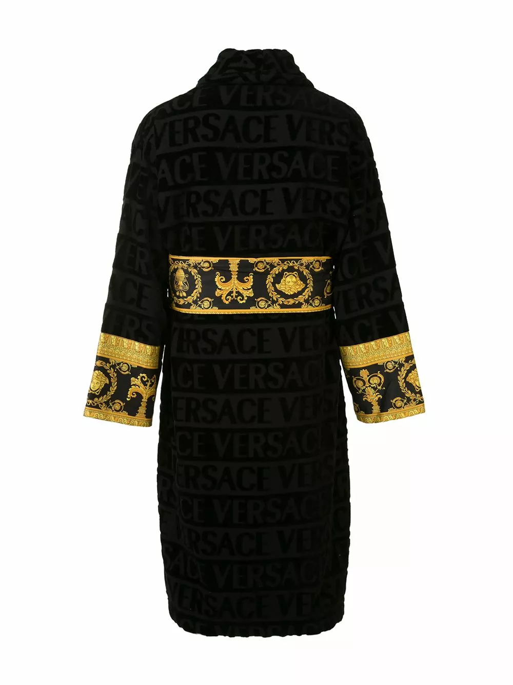 Black and gold cotton Barocco trim bathrobe from Versace Home featuring a wrap style front, long sleeves, a tie waist, front pockets, a relaxed fit and a monogram design.