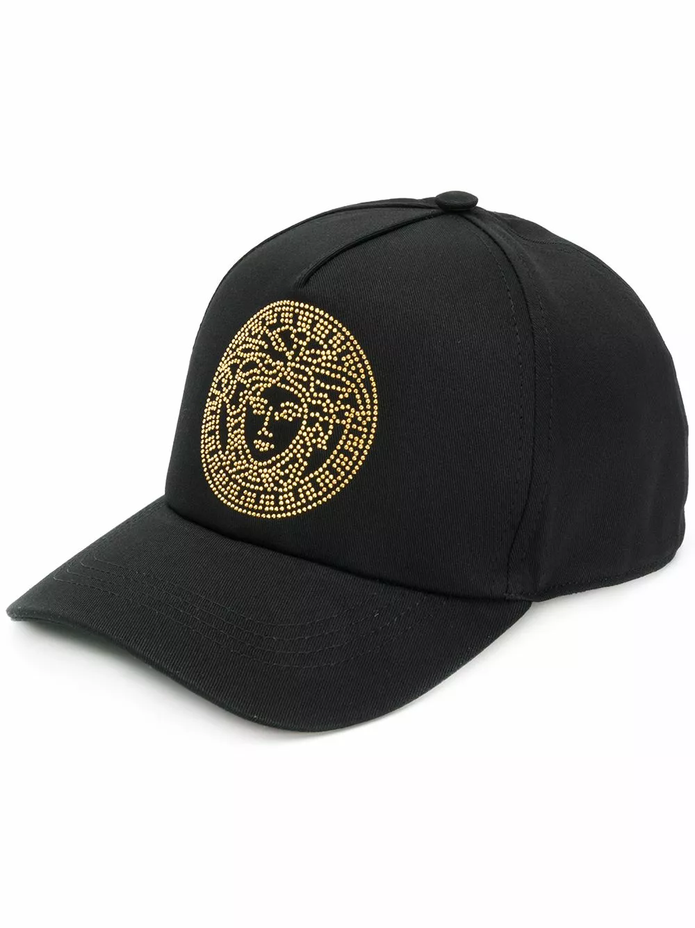 In true Versace fashion, even the humble cap is designed with glamour in mind. Made from cotton-canvas, it’s decorated with gold beads arranged to depict the brand’s iconic Medusa head motif. More is more.