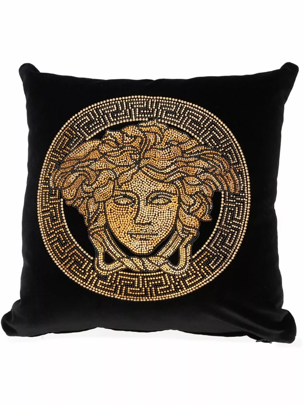 A mainstay for the brand, Versace’s Medusa Head motif appears on a multitude of items year after year, as seen on this throw cushion. Crafted from plush velvet, an embellished rendition of the infamous gorgon adorns the piece.
