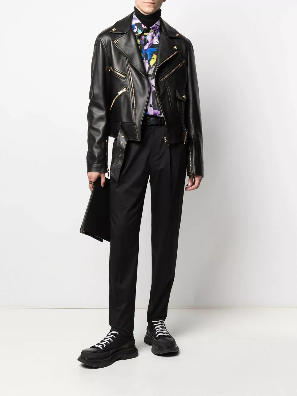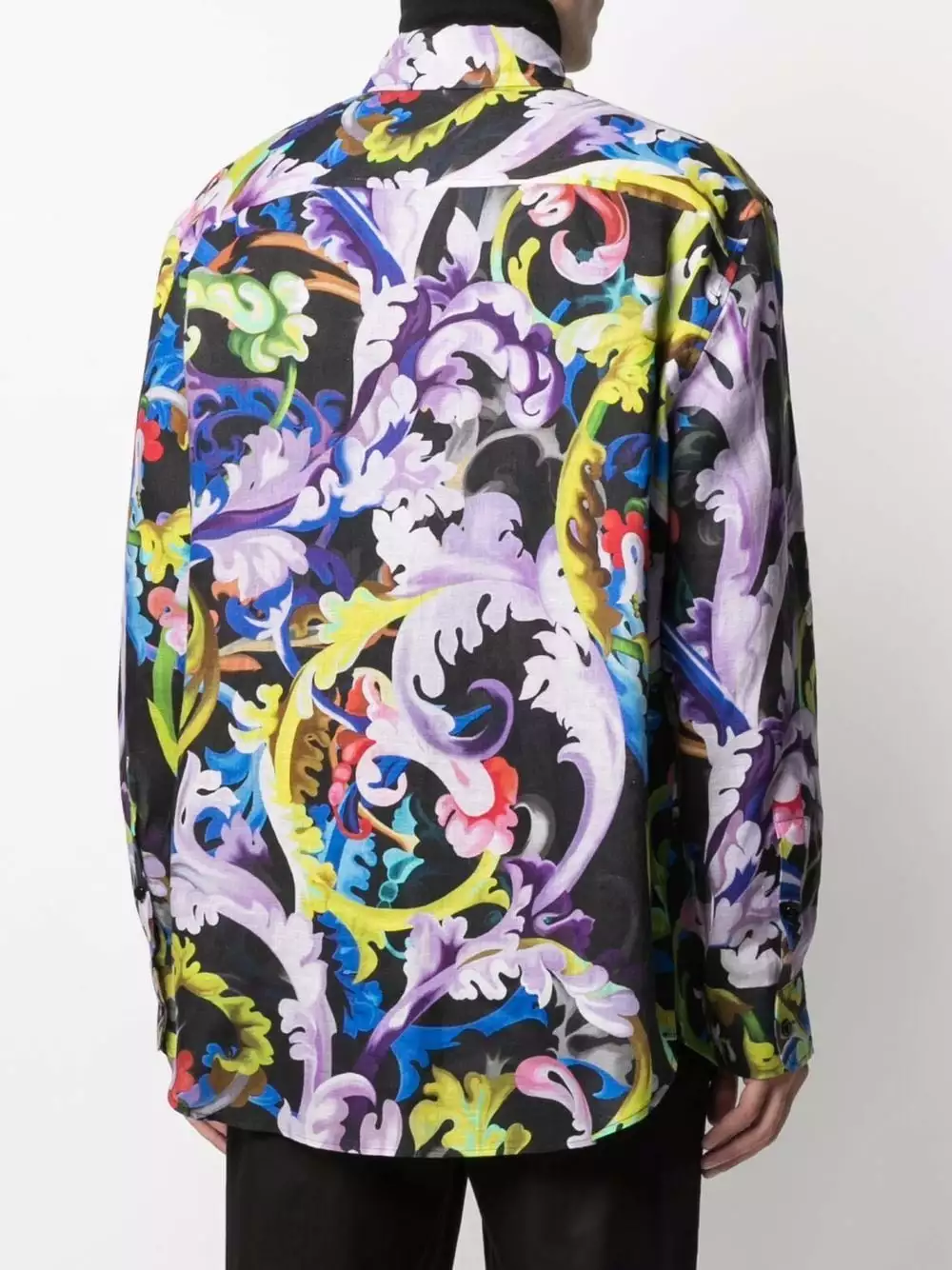 Versace’s colourful linen shirt is printed with filigree motifs for a signature aesthetic. It’s finished with a classic collar and curved hemline.