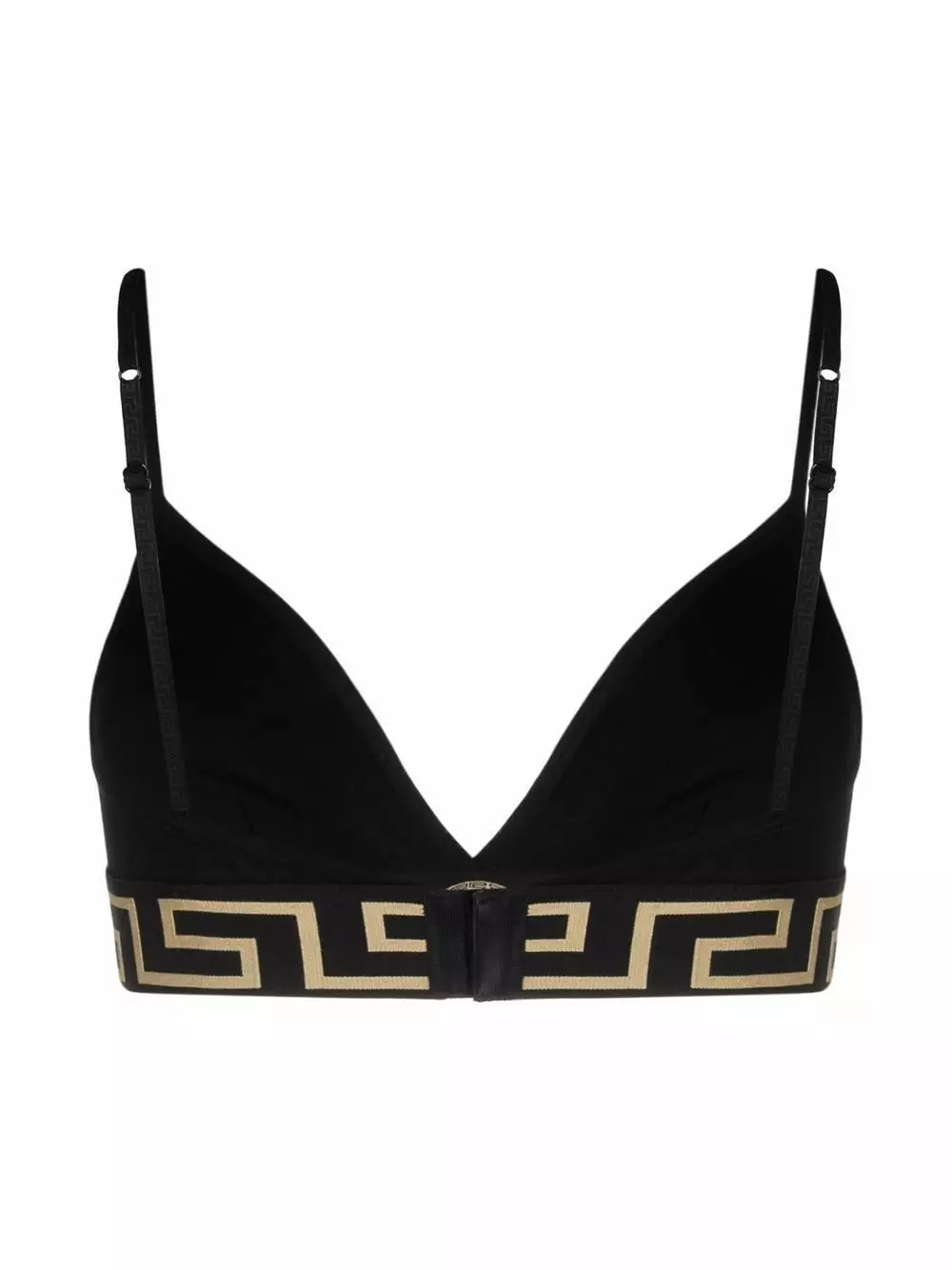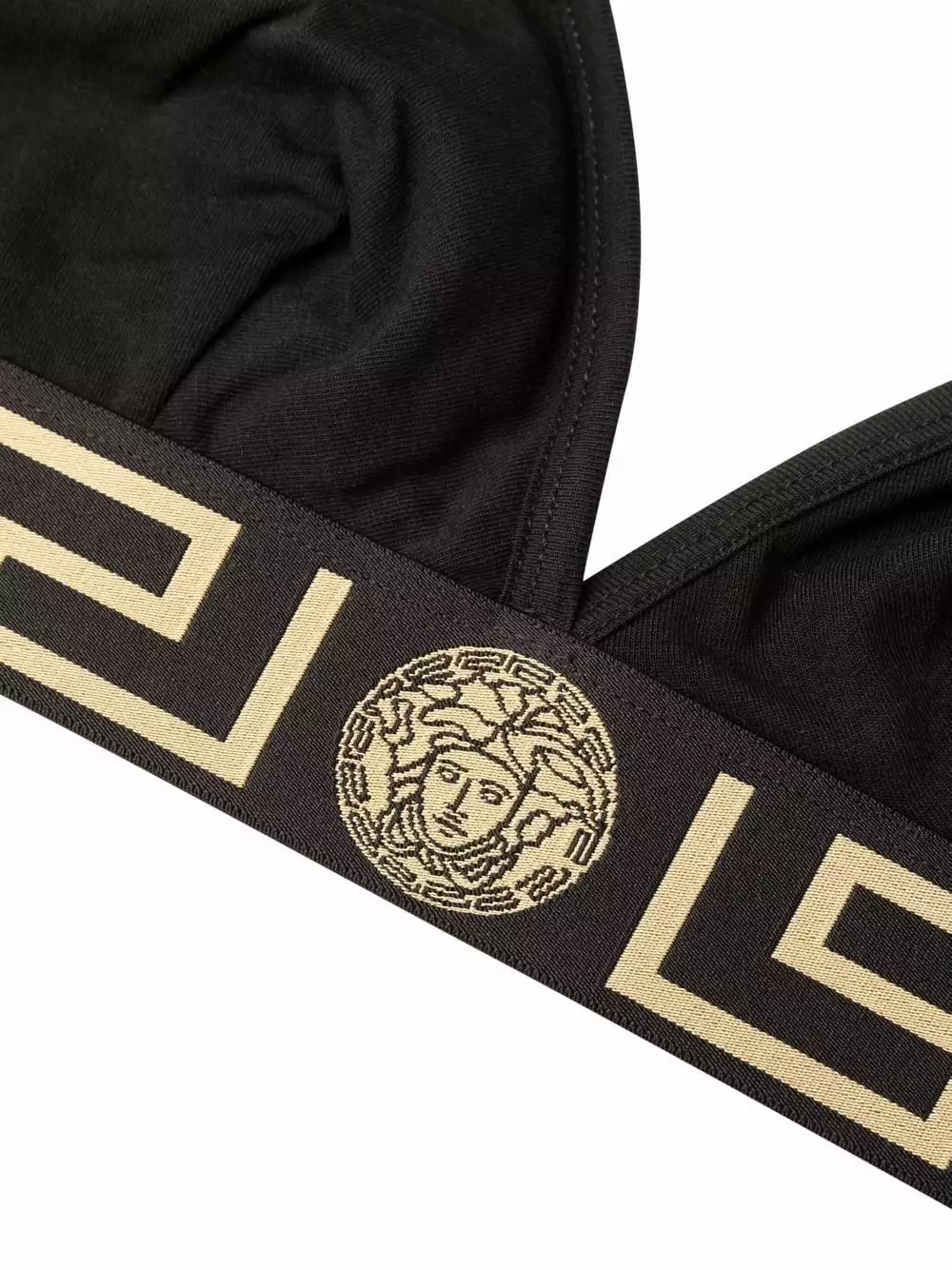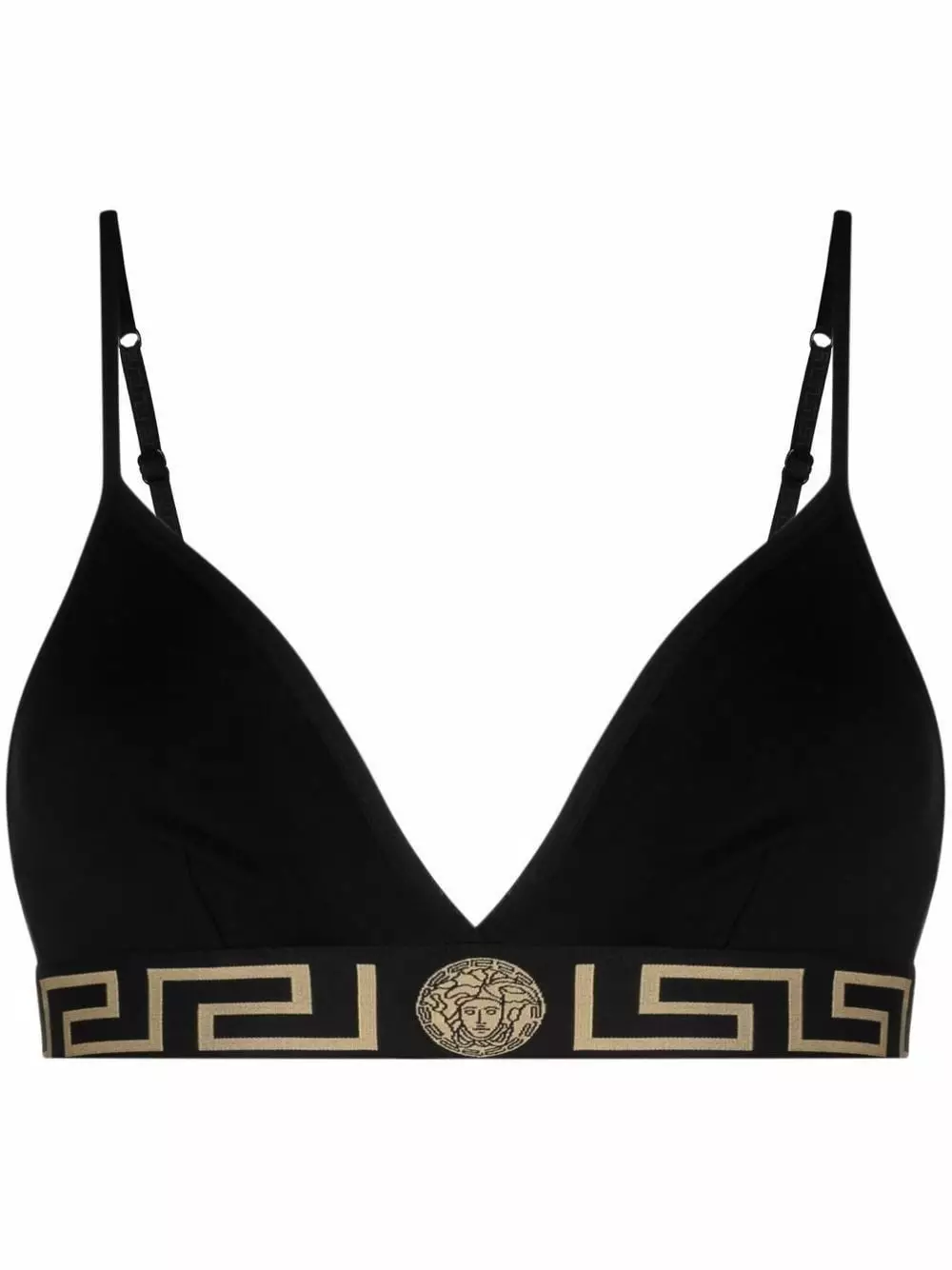 Versace’s triangle bralette showcases the label’s iconic motifs in gold. The Medusa head and Greca symbol sit at the underband, offering a distinct mark of the brand.