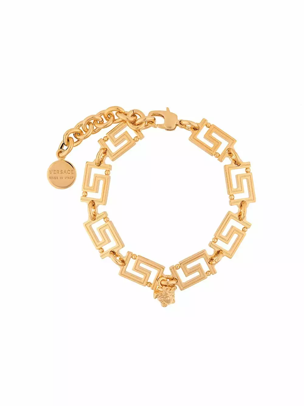 Versace goes beyond utilising the actual brand name to represent their rich Italian heritage and contemporary design ethos through instantly-recognisable house codes, as seen in this gold-tone metal greca chain bracelet. Featuring a lobster clasp closure, an engraved logo charm and a signature Medusa logo charm.