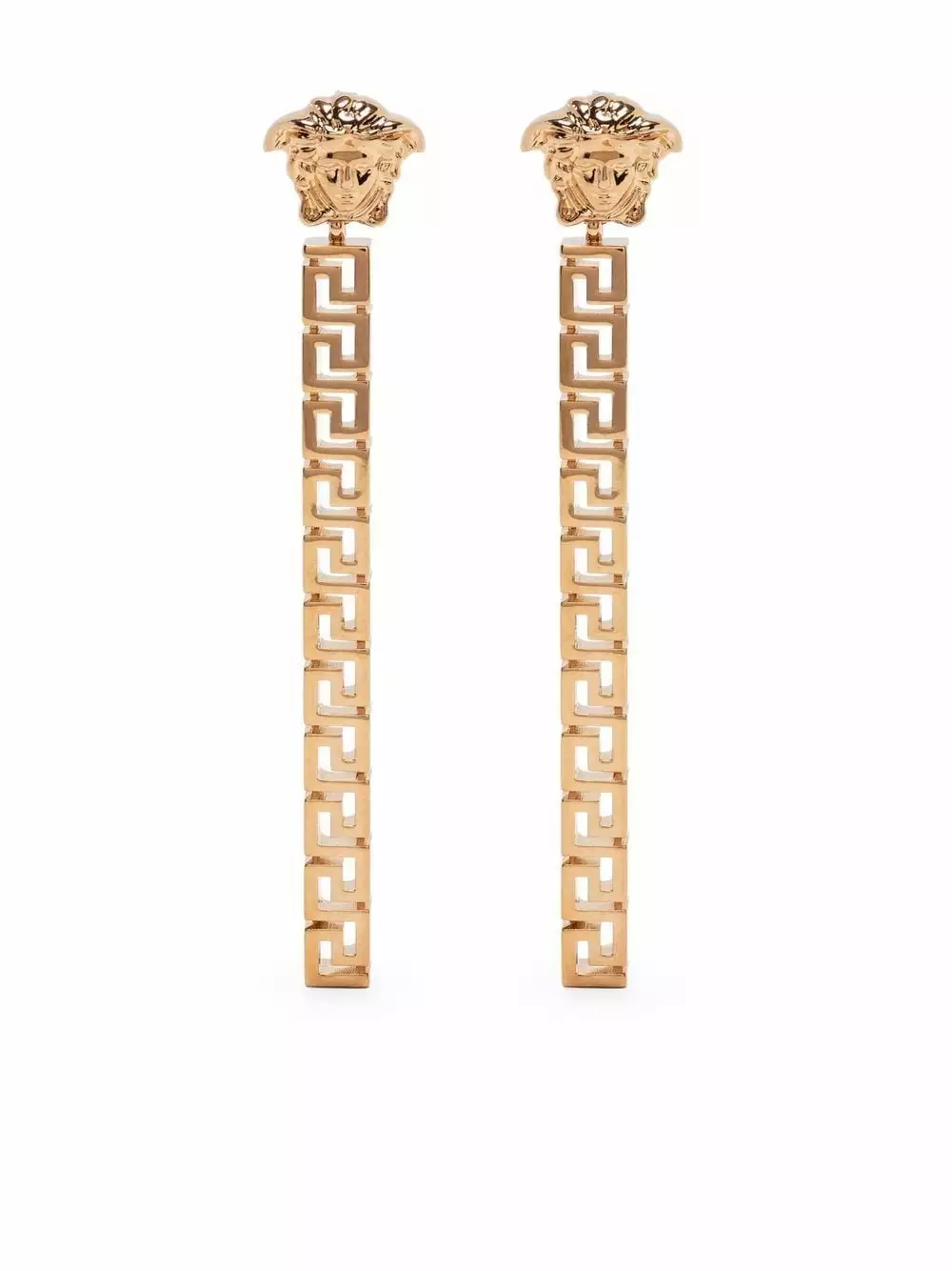 The stone-faced Medusa Head motif, the heritage Greca pattern detail, the statement gold hue…everything about this playful pair of drop earrings points to Versace. No logo needed.