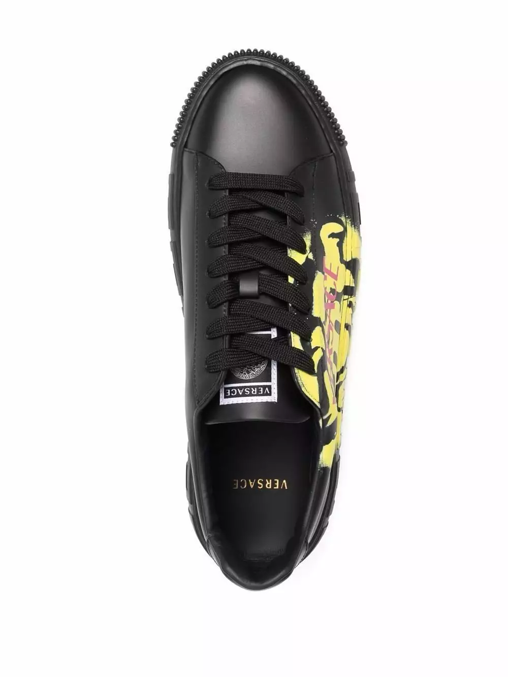 Inspired by graffiti, the Medusa Smile print is a contemporary take on Versace’s signature motif, celebrating the brand’s sense of humour. Crafted from leather, these Greca sneakers are defined by their clean lines and the graphic Greca Key pattern on the sole.