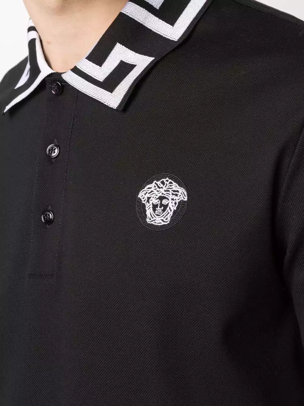 Versace’s signature Greca trim decorates the collar of this cotton short-sleeve polo shirt. Fabricated in Italy, the Medusa is detailed in a contrasting embroidered motif.
