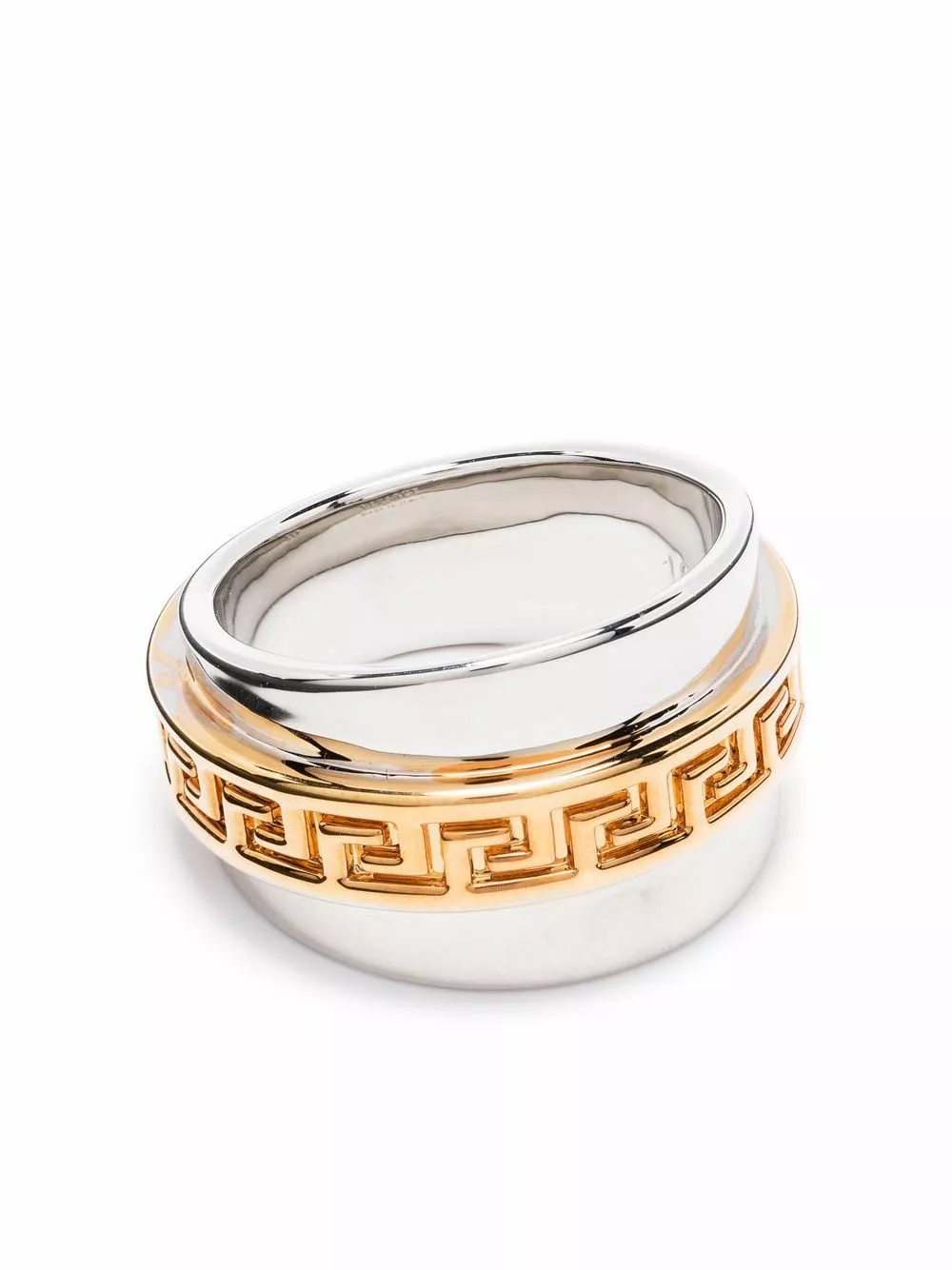 Small detail, big style. This sleek two-tone Versace ring has been engraved with the house’s new Greca monogram for maximum style impact. You’re welcome.